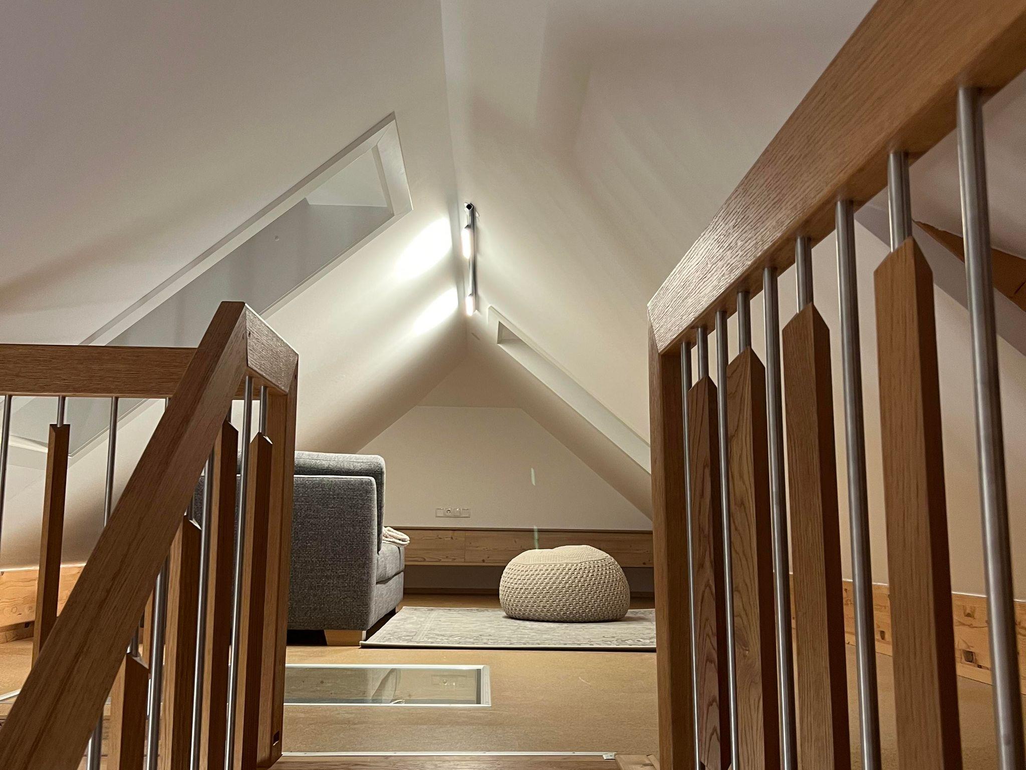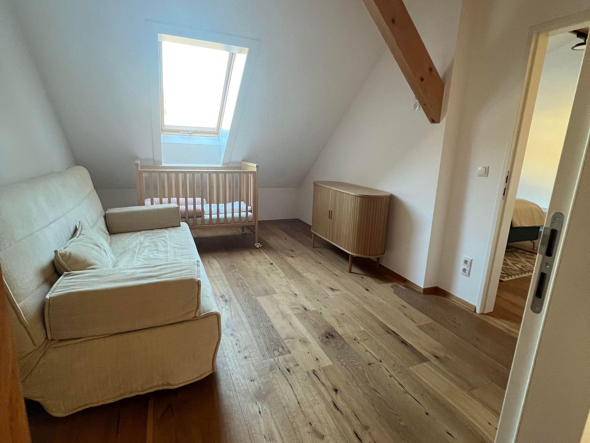Geräumigkeit & Ausstattung: Diese großzügige, lichtdurchflutete Dachgeschosswohnung befindet sich in einem über 300 Jahre alten, liebevoll restaurierten Haus. Sie bietet Platz für bis zu 6 (8) Personen – mit vier Schlafzimmern (drei Doppelbetten, einer Doppel-Schlafcouch und einem Gitterbett), einer voll ausgestatteten Küche, Wohnzimmer, zwei Toiletten, Loggia und einer offenen Galerie. Das Bad verfügt über Dusche, Badewanne und Doppelwaschtisch.