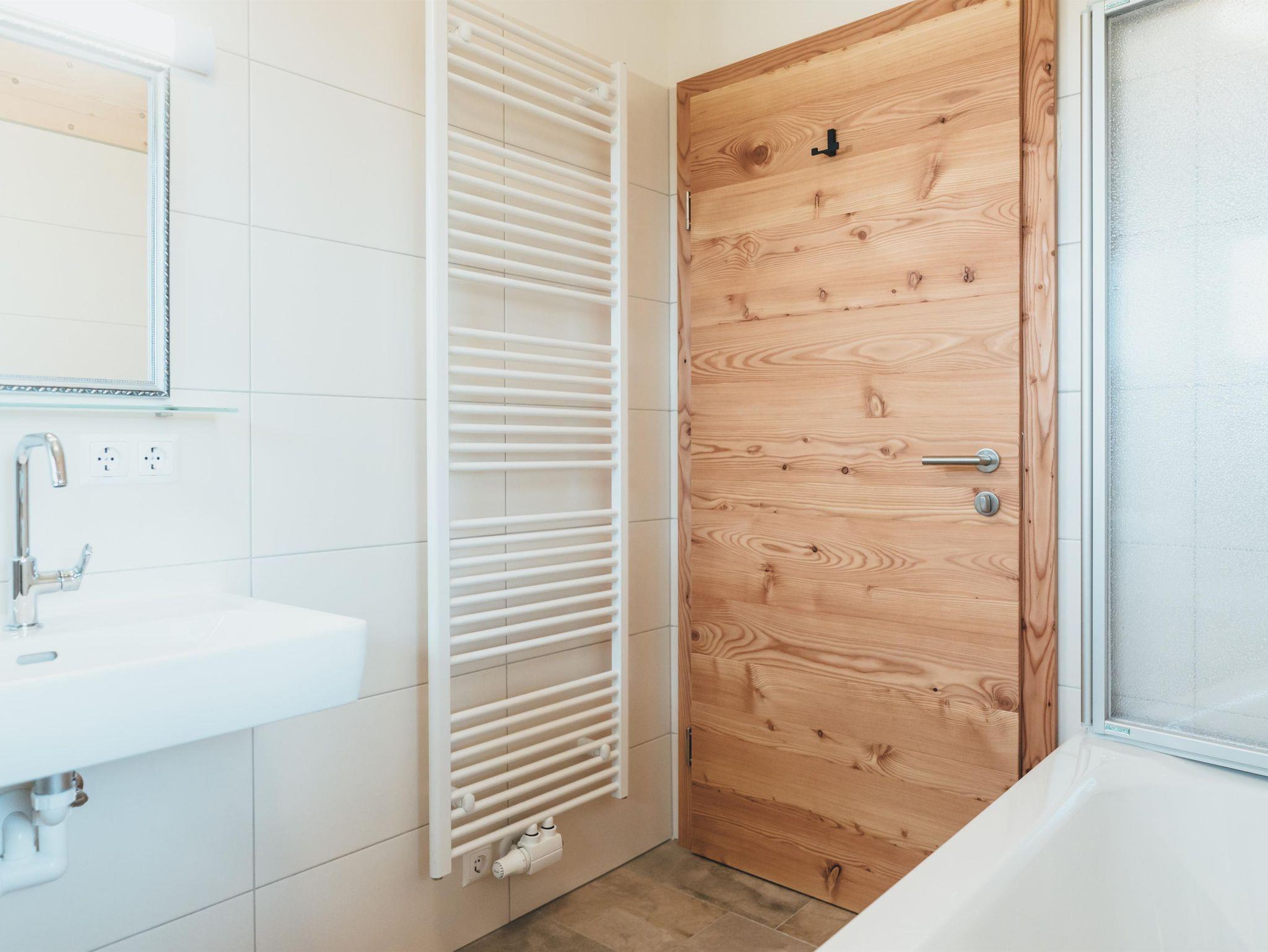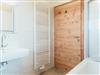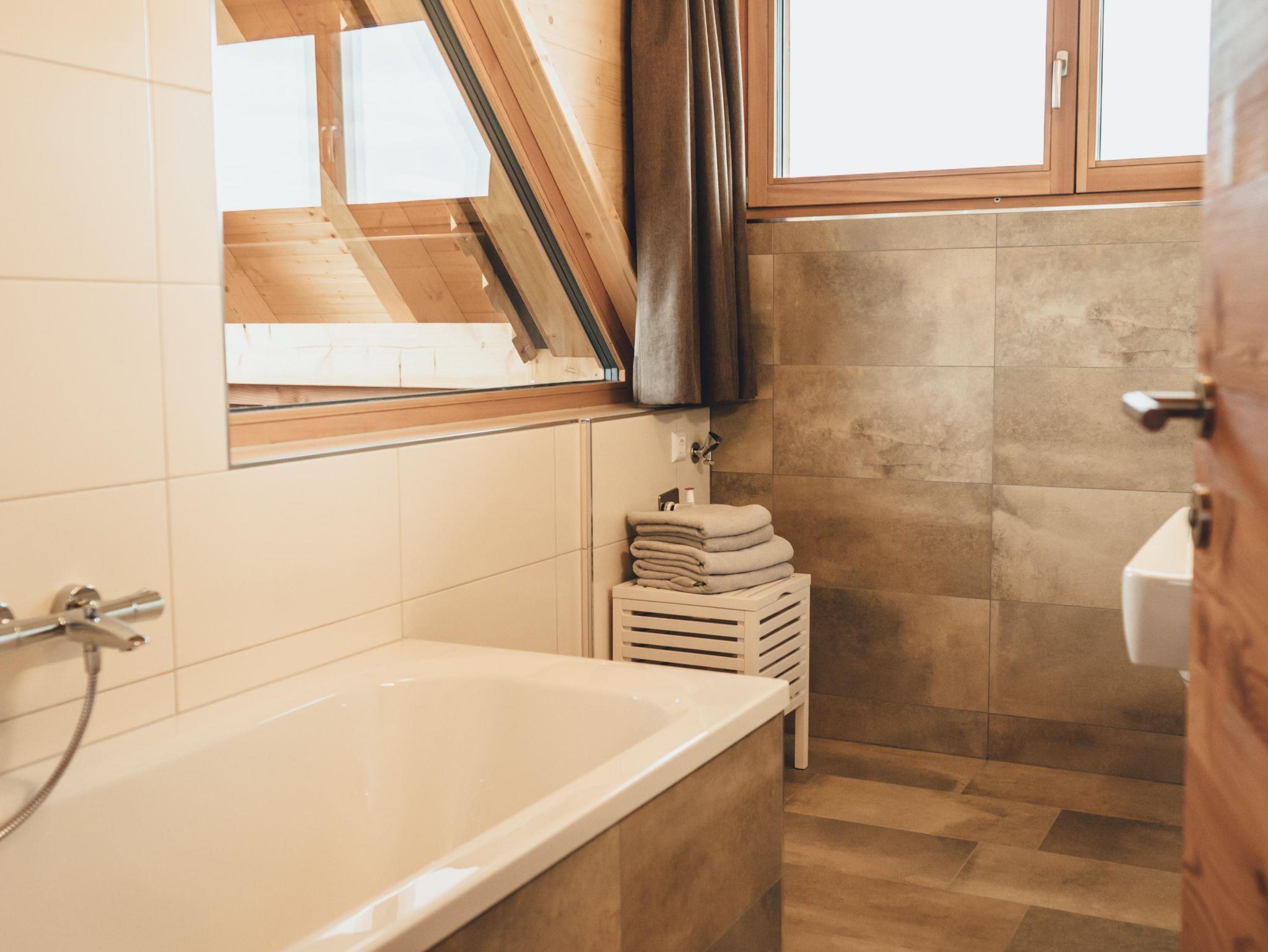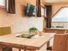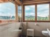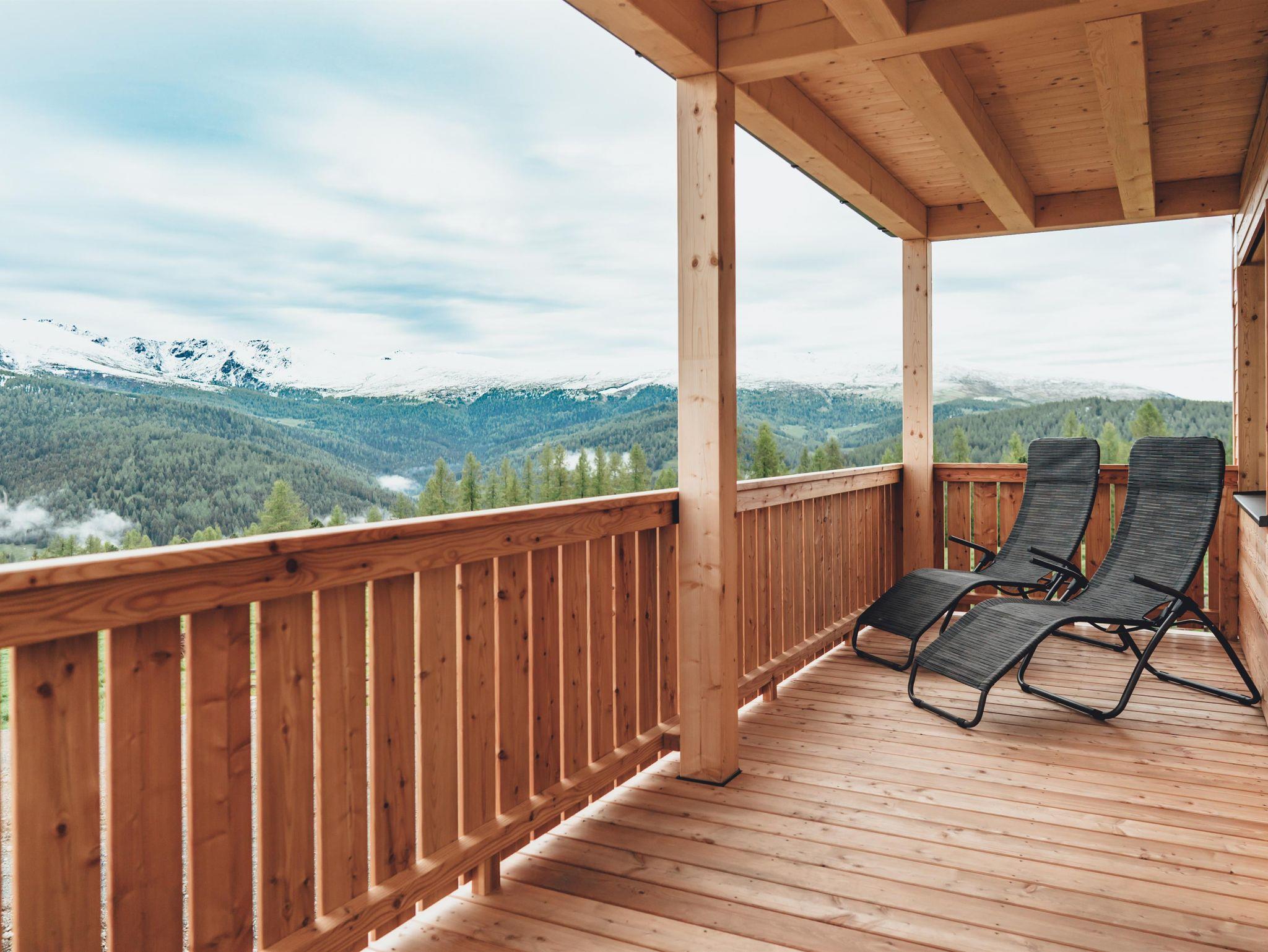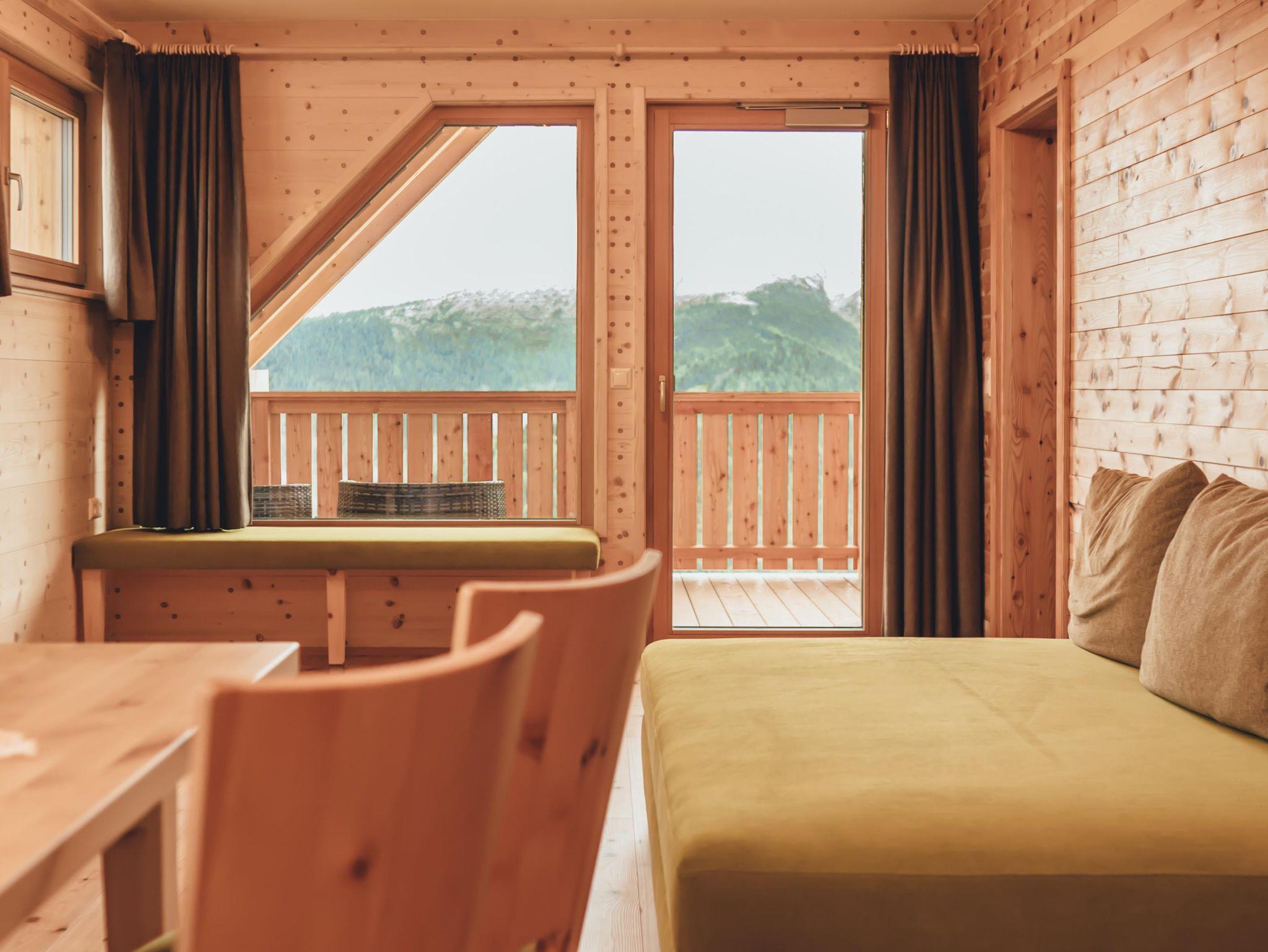 Zirben – Schlafzimmer Nr. 2 mit Doppelbett, Gitter-/Kinderbett; gemeinsamer Vorraum. Wohnküche mit Doppel-Schlafcouch ausziehbar. Bad Nr. 2 mit Badewanne & WC. Kuschelige Fensterbank mit Panoramafenster. Panorama - Balkon mit 17 m²
