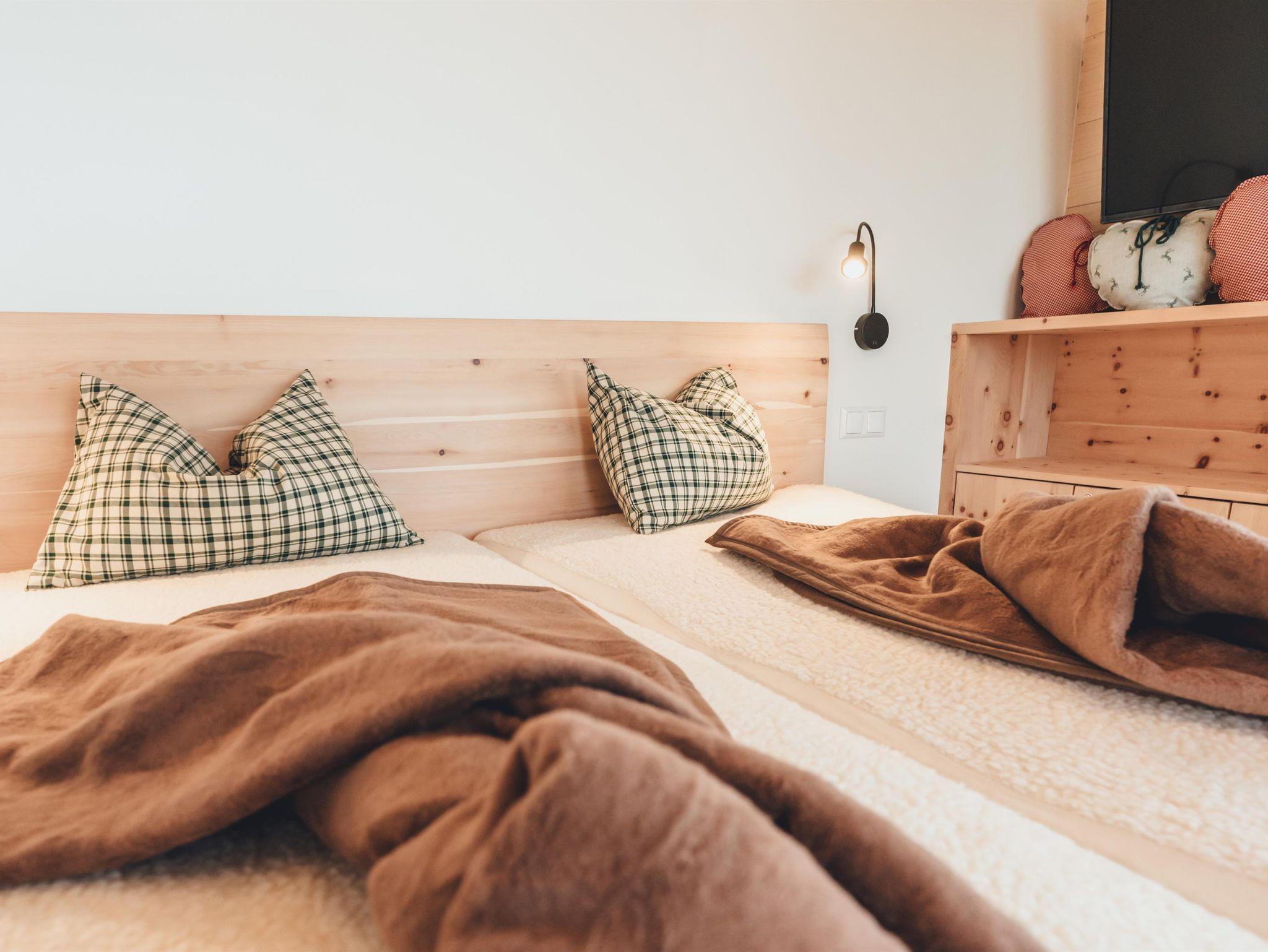 Entdeckt die gemütliche Almwohnung Speikkofel im 1. Stock mit zwei einladenden Unterkunftsoptionen: Die Almwohnung (54 m²) mit einer Zirben - Küche und dem großen Wohnraum mit ausziehbarer Doppel - Schlafcouch und der kuscheligen Fensterbank. Es gibt ein Doppelzimmer mit Zusatzbett und den großen Panorama - Balkon. Im Bad gibt es eine Badewanne und das WC. Im Zirben - Doppelzimmer mit einer zusätzlichen Schlafcouch für eine Person gibt es ein Bad mit Dusche und WC (20 m²).