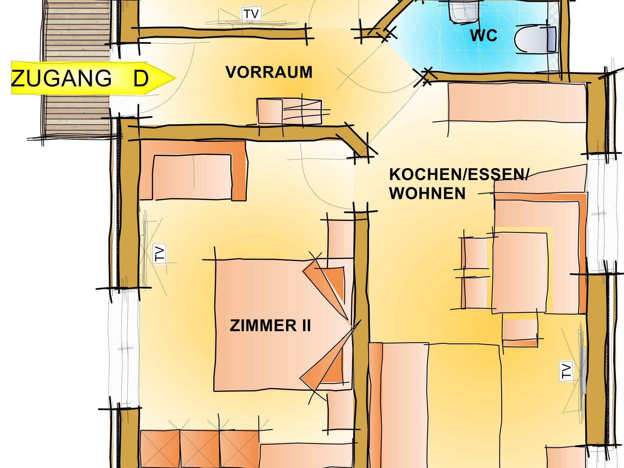 Zirben – Schlafzimmer Nr. 2 mit Doppelbett, Vorraum. Wohnküche mit Doppel-Schlafcouch ausziehbar. Bad mit Badewanne & WC. Extra WC. Kuschelige Fensterbank mit Panoramafenster. Panorama - Balkon mit 17 m²