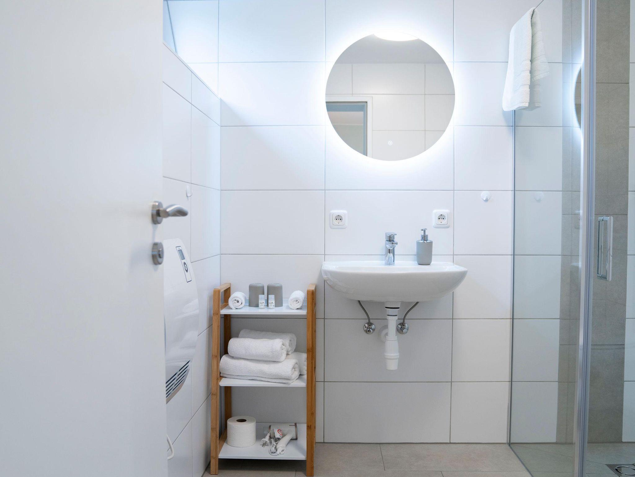 • Badezimmer mit Dusche, Toilette, Waschtisch, Spiegel, Föhn