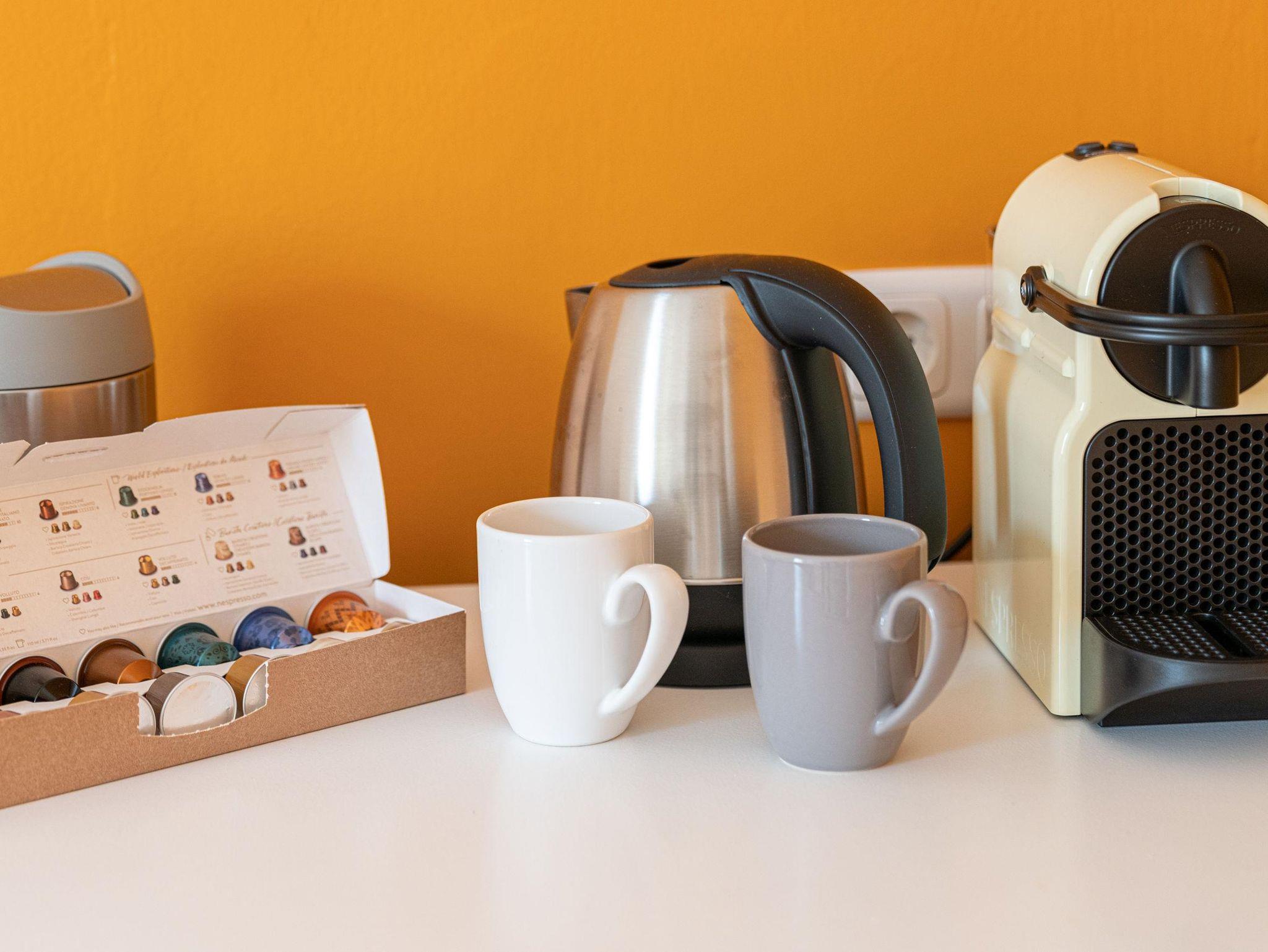 • Kaffeemaschine, Wasserkocher, Minikühlschrank