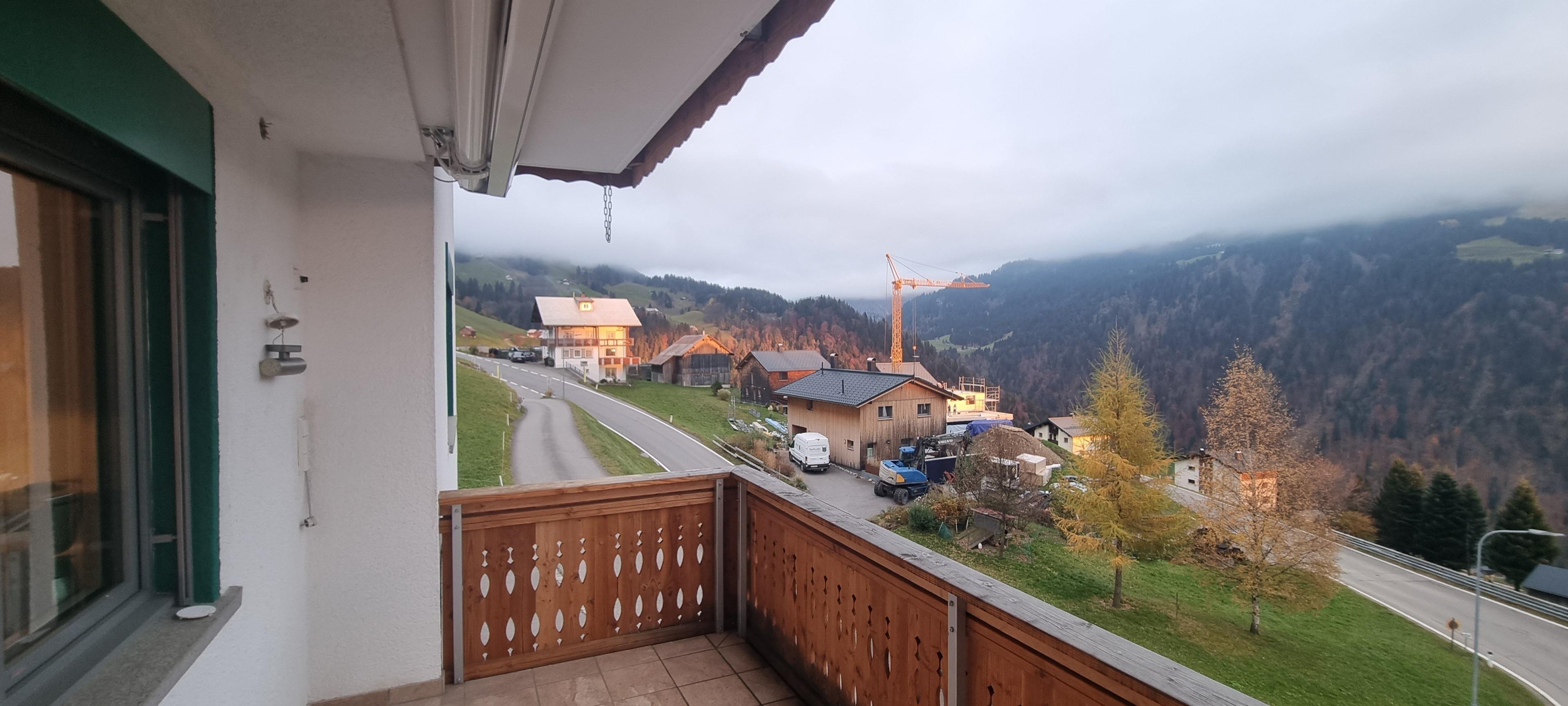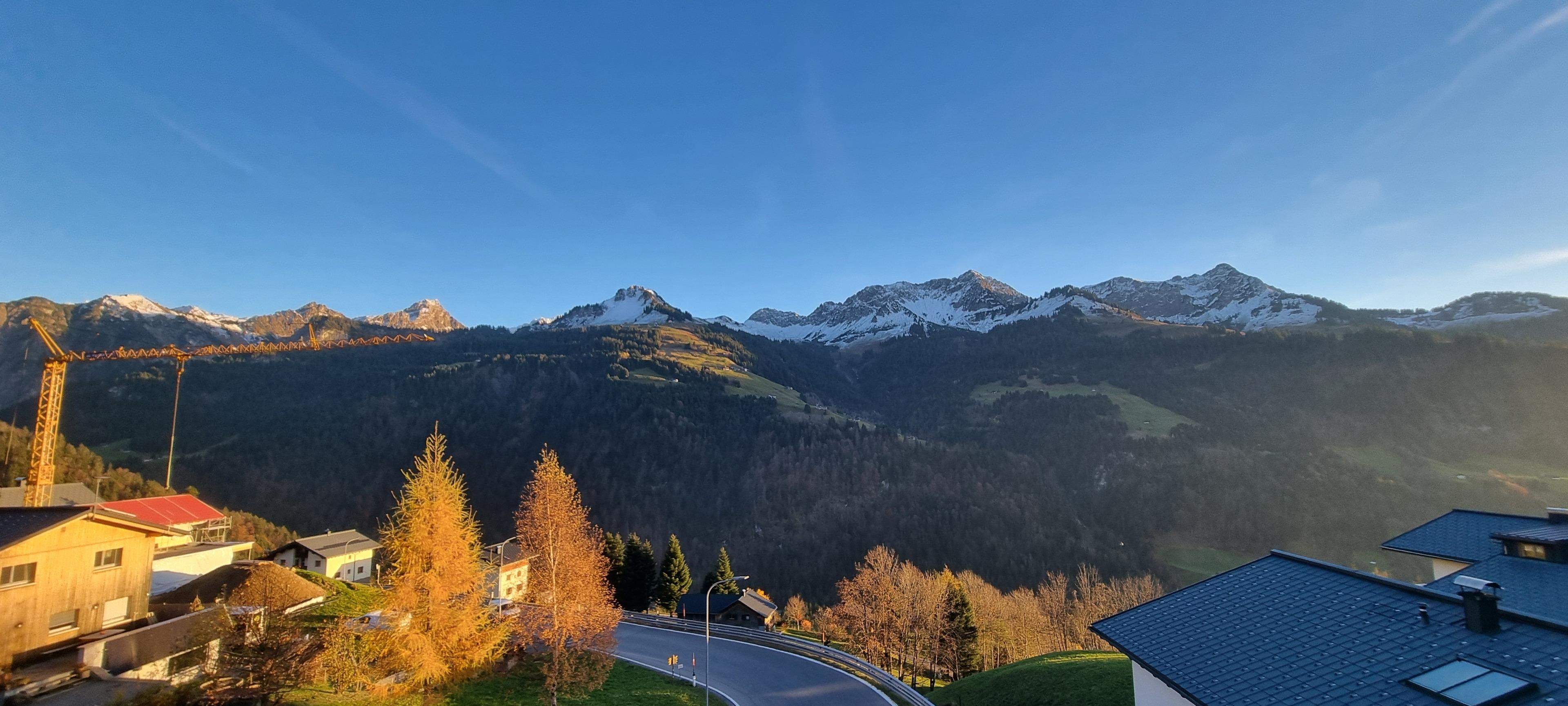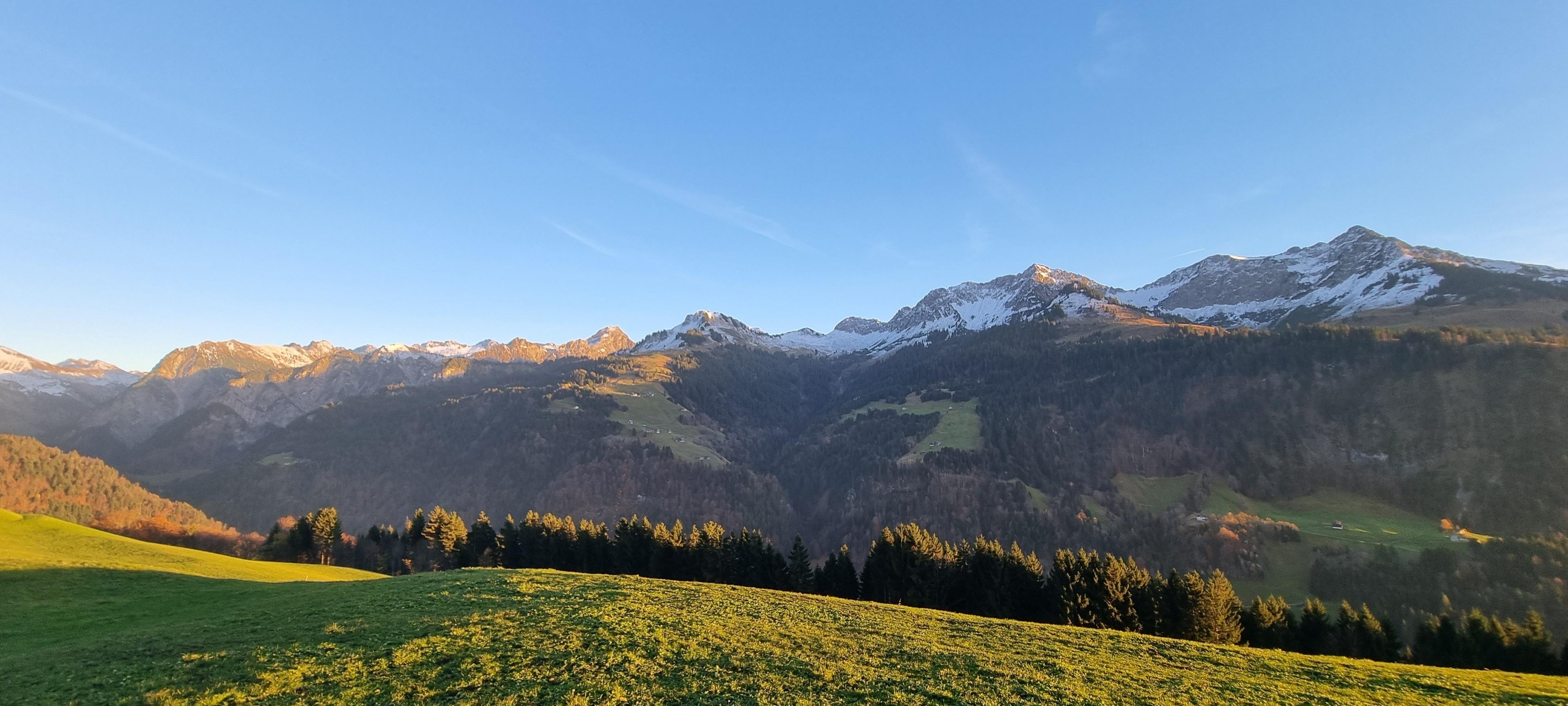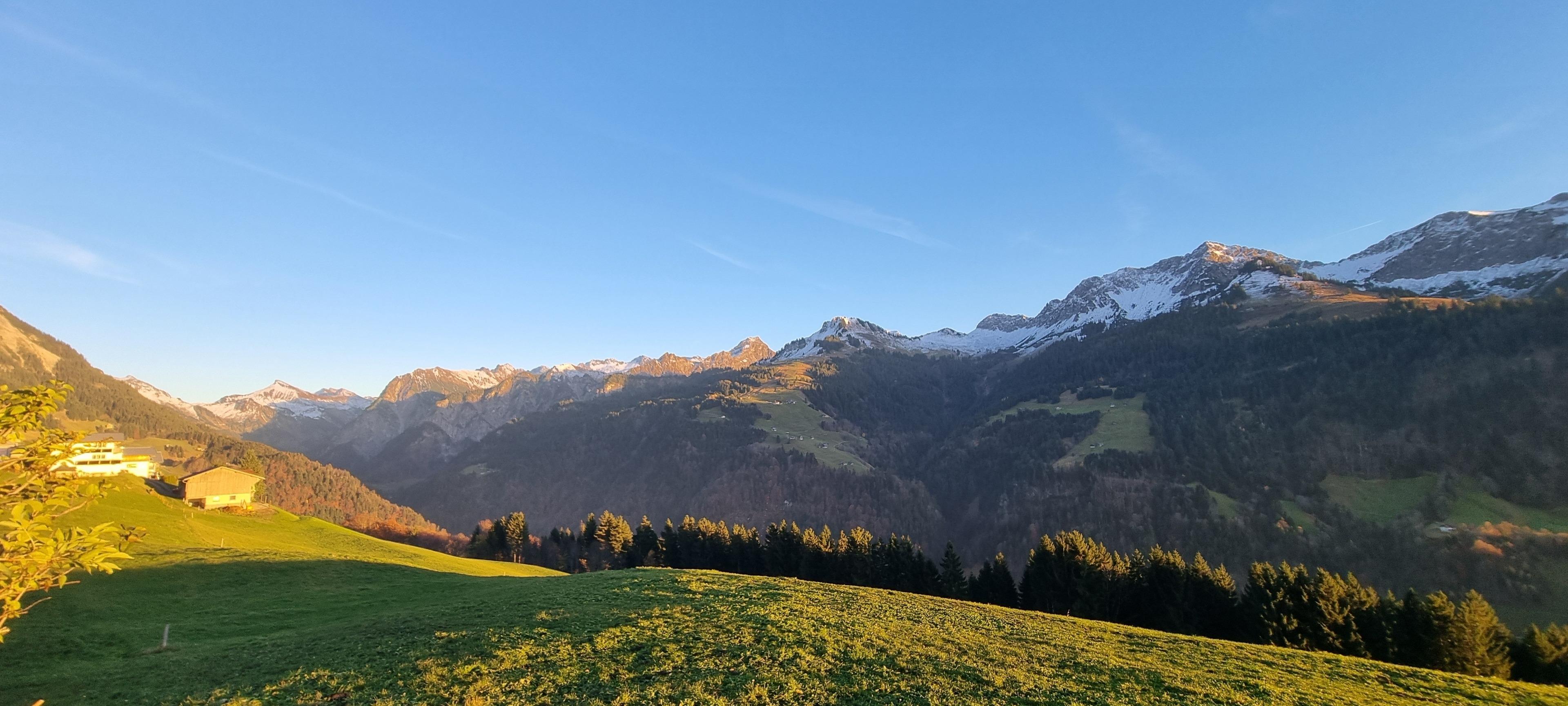 An der Grenze zwischen den Gemeinden Fontanella und Sonntag, auf rund 1.100 Metern Höhe, erwartet dich ein atemberaubender Ausblick auf die imposante Bergkette des Biosphärenparks Großes Walsertal.