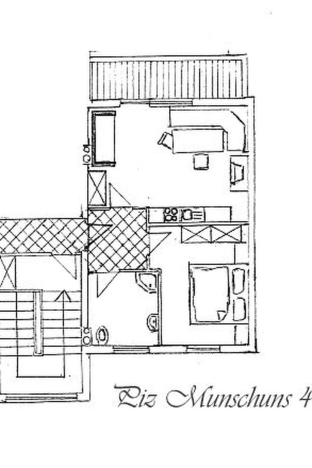 "Piz Munschuns", 2-room apartment 43 m2 on 2nd floor, south-west facing position. Partly with sloping ceilings, beautiful and cosy furnishings: living/sleeping room with 1 double sofabed, dining table and satellite TV. Exit to the balcony. 1 double bedroom. Open kitchen (oven, dishwasher, 4 induction hot plates, toaster, kettle, microwave, electric coffee machine). Shower/WC. Oil heating. Balcony. Balcony furniture. Facilities: safe, children's high chair, baby cot. Internet (WiFi, free). Please note: smoke alarm.