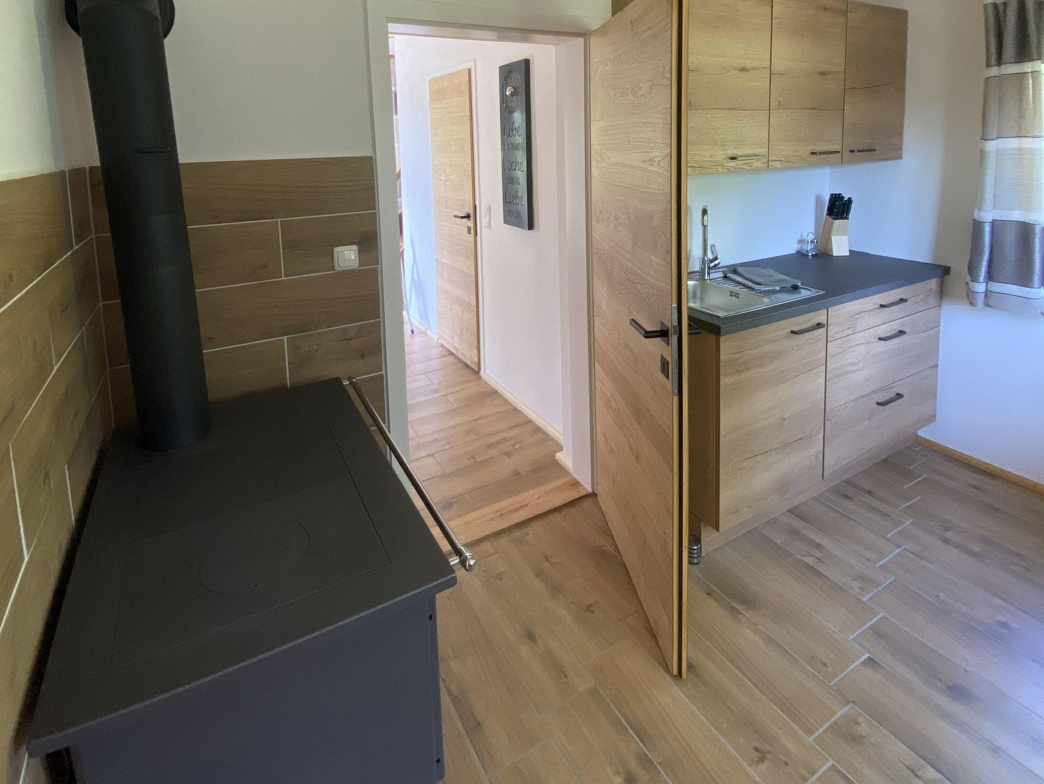 Licht und Warmwasser kommen über eine Photovoltaikanlage und mit Gas. Geheizt wird mit dem Küchenofen und Kachelofen in der Stube.