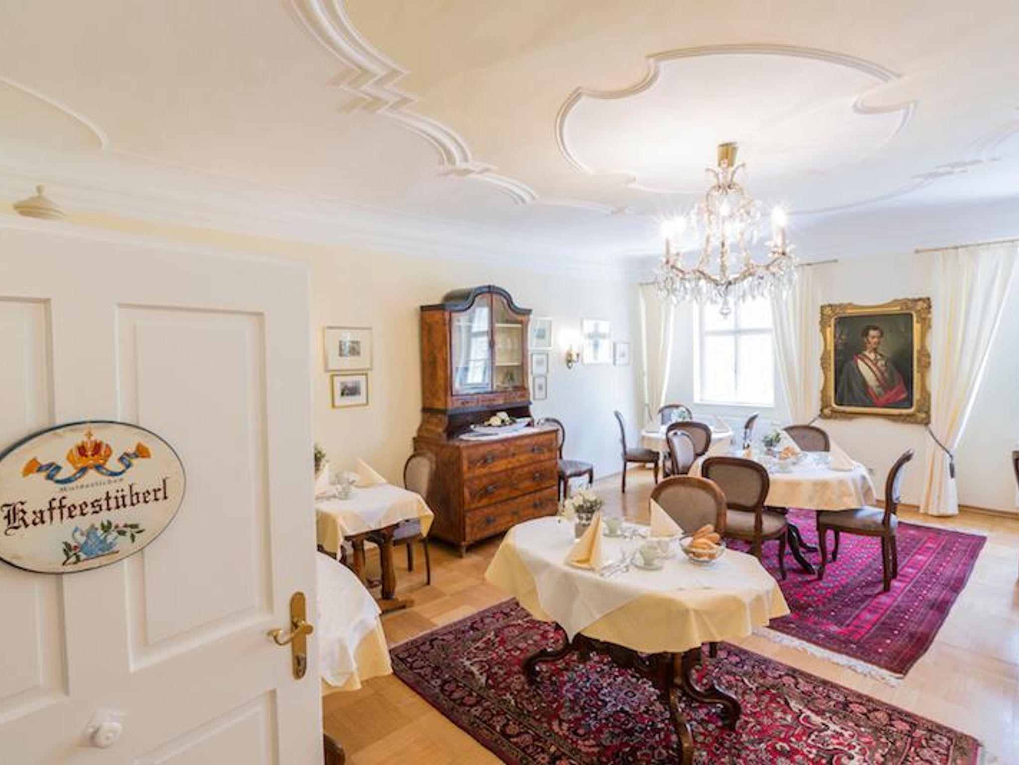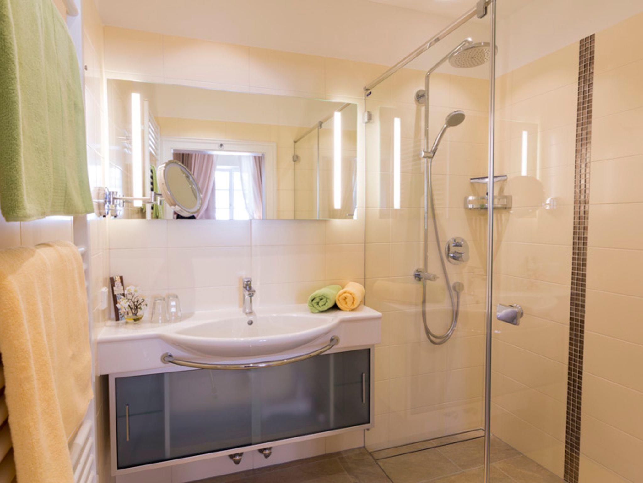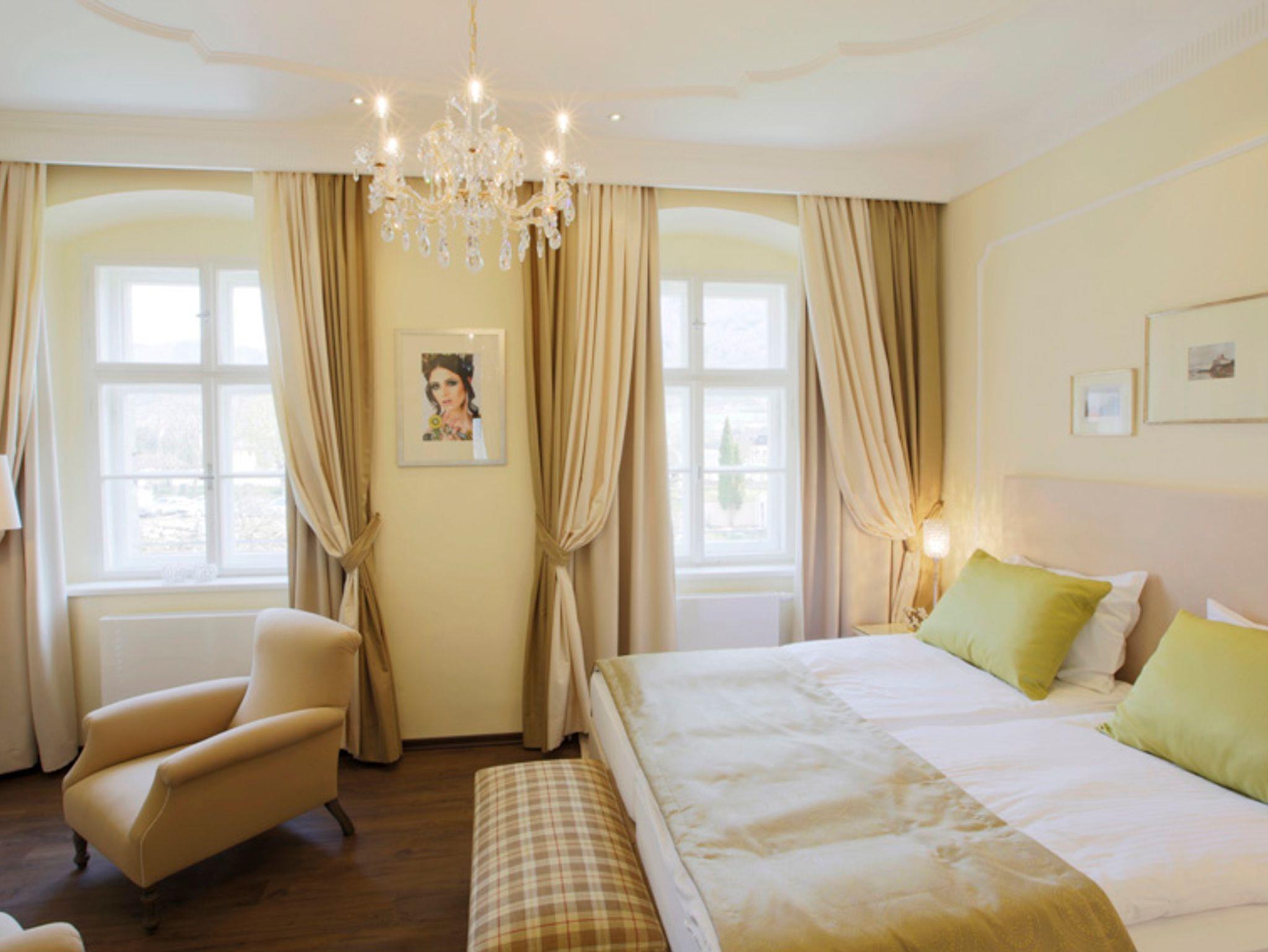 Zur Ausstattung gehören ebenso ein Flat TV, ein kleiner Kühlschrank, ein Telefon und Safe. Der schöne Ausblick geht in den Garten, die Terrassen des Singerriedl Weinbergs oder zur Pfarrkirche.