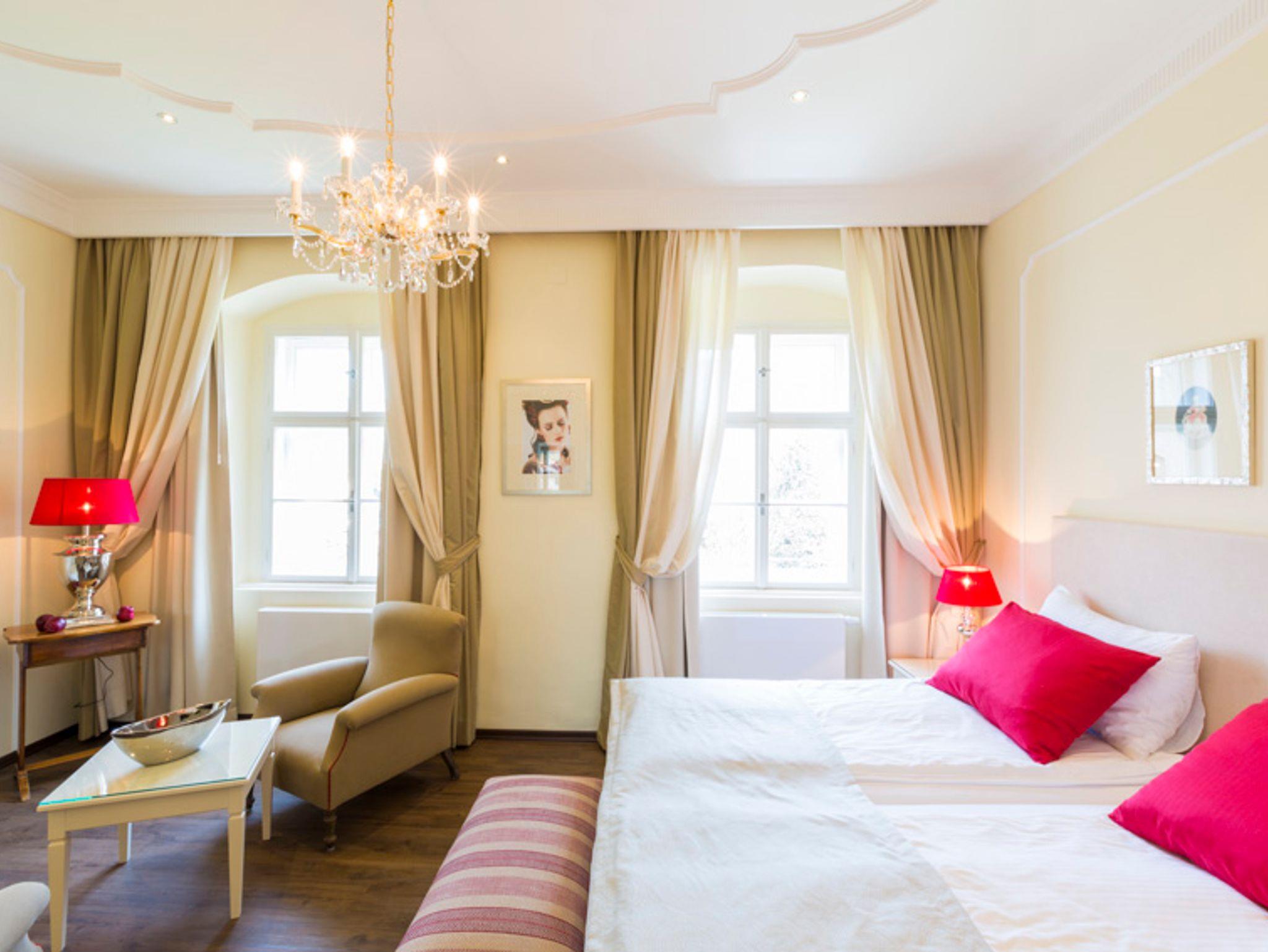 Die Unterkünfte reichen von luxuriös gestalteten Superior Doppelzimmern im Neo-Barockstil bis hin zu gemütlich eingerichteten Gästezimmern und großzügigen Appartements mit Blick auf Kirche und Weinberge.