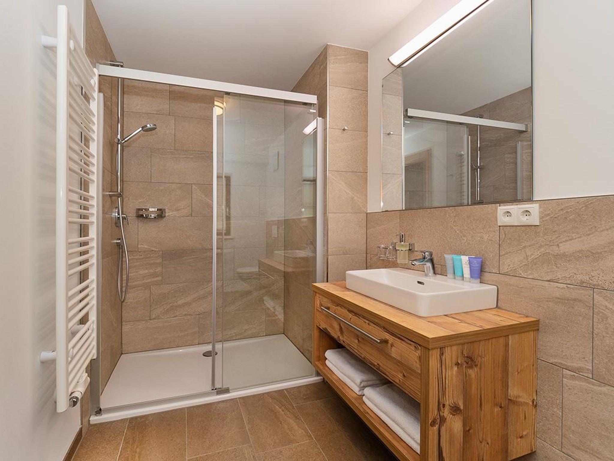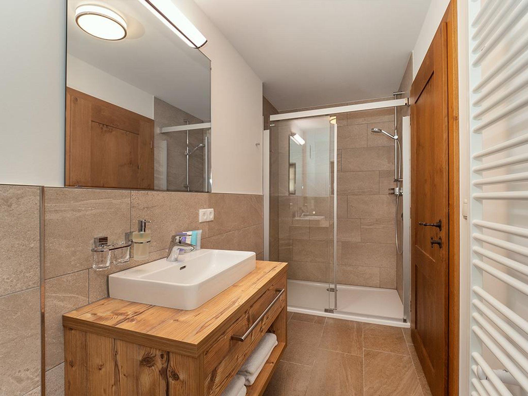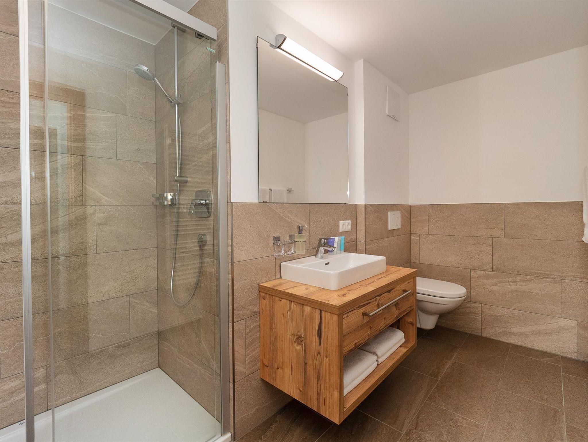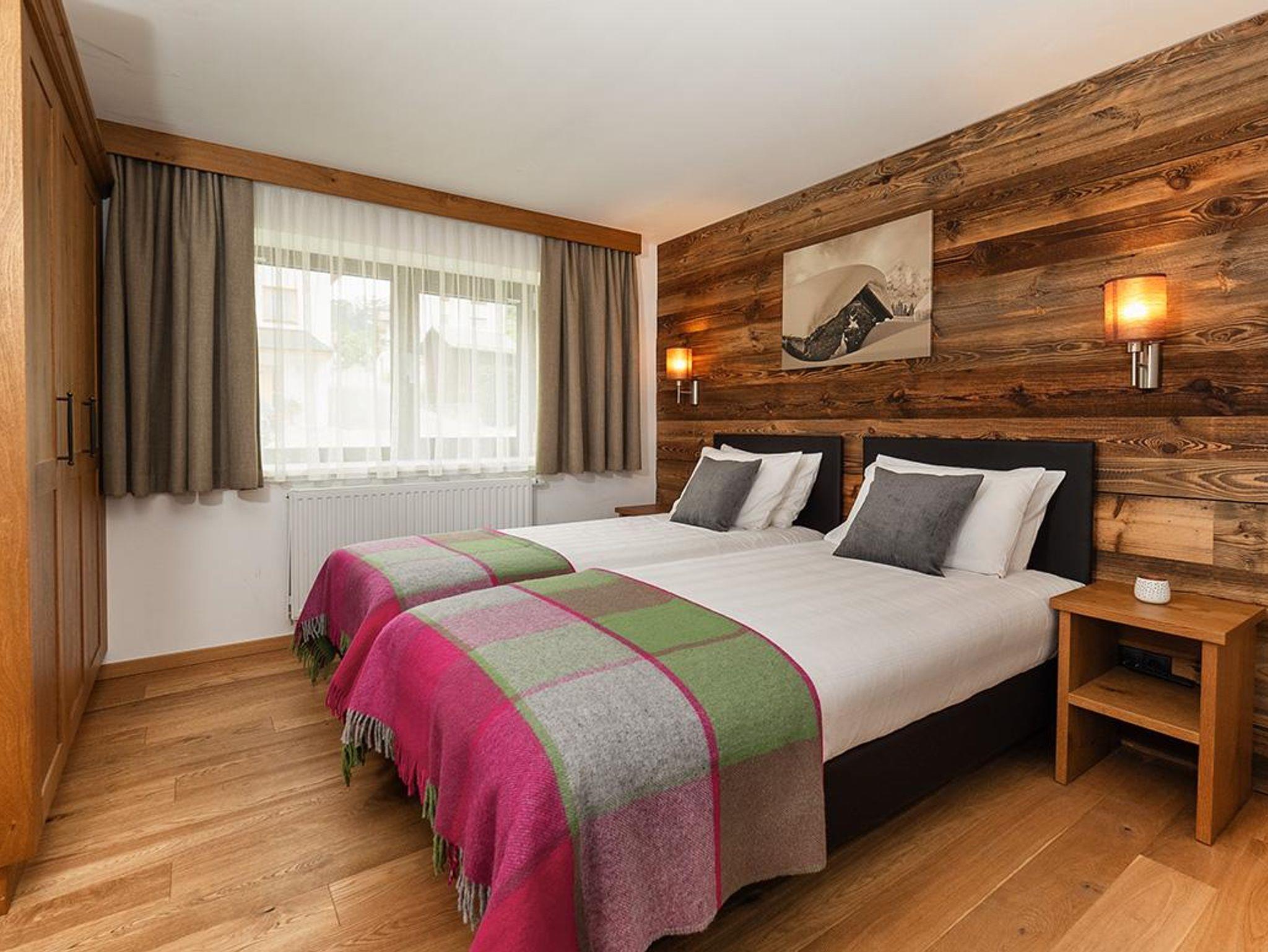 Das Chalet Viridi bietet Platz für bis zu 4 Personen auf einer Wohnfläche von 75m². Die zwei großzügigen, rustikalen Schlafzimmer sind mit einem bequemen, teilbaren Boxspring-Doppelbett, einem geräumigen Kleiderschrank und einem Nachttischchen ausgestattet. Jedes Schlafzimmer verfügt über ein eigenes modernes Badezimmer mit Waschbecken, Dusche oder Badewanne, WC, Haarföhn und einem Handtuchtrockner.