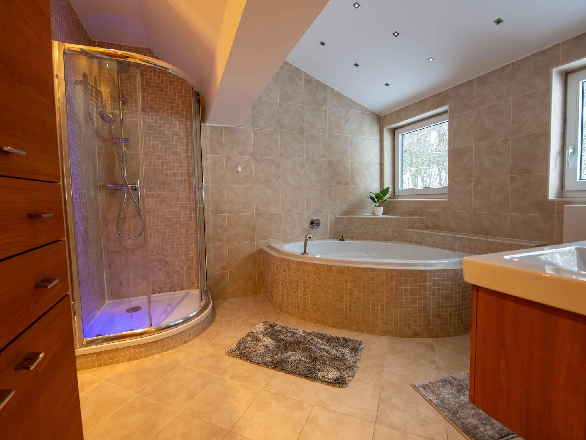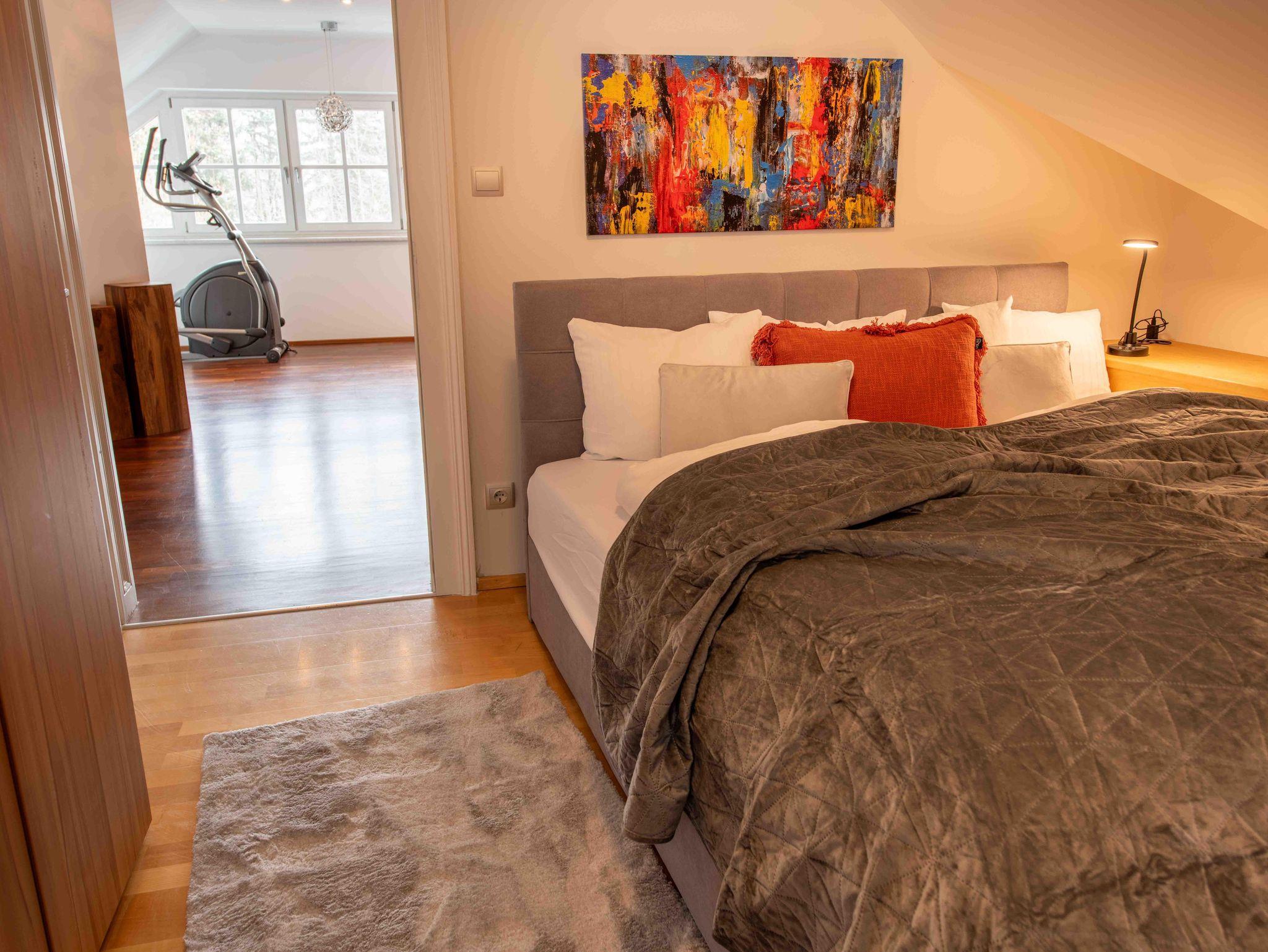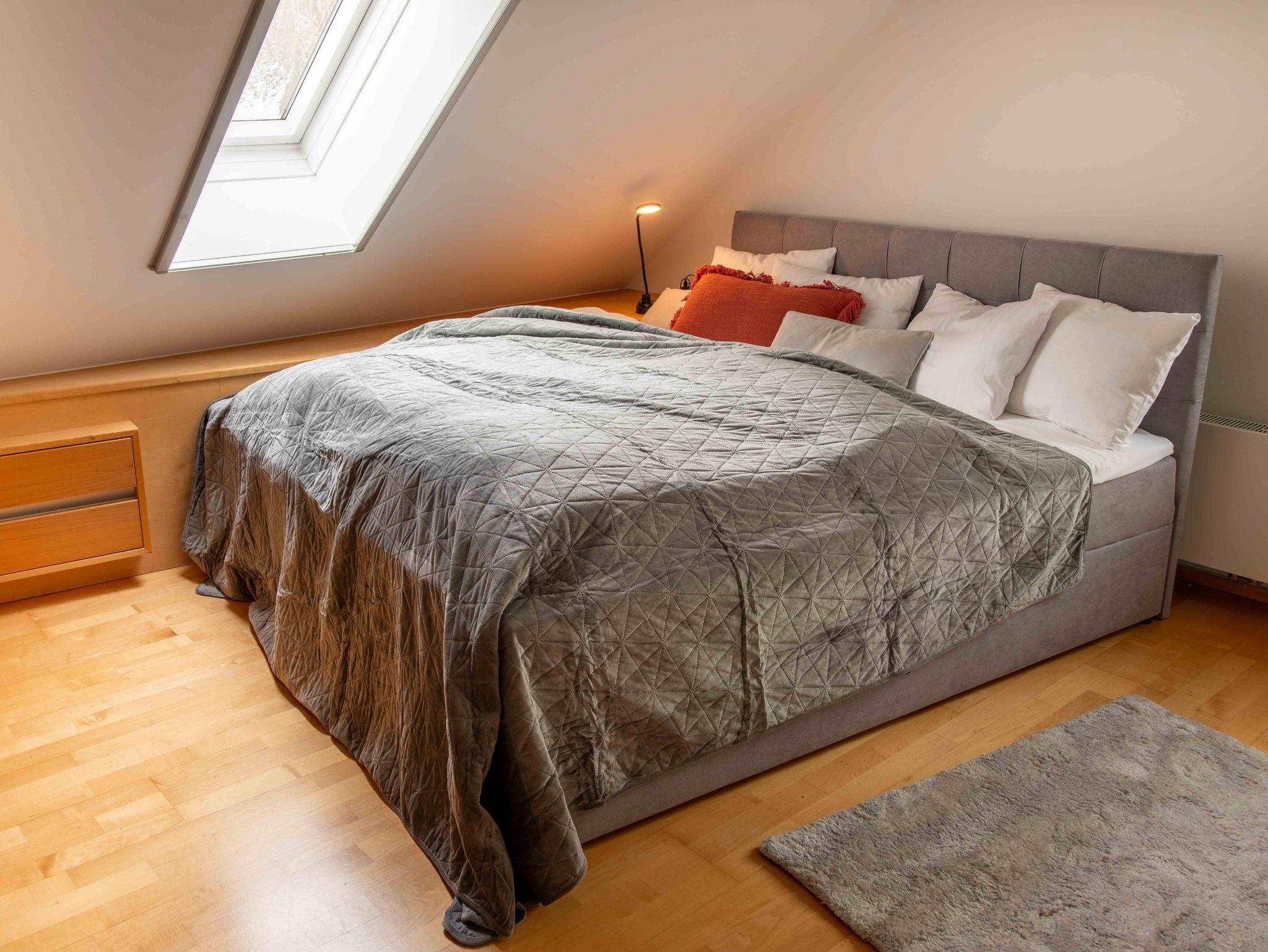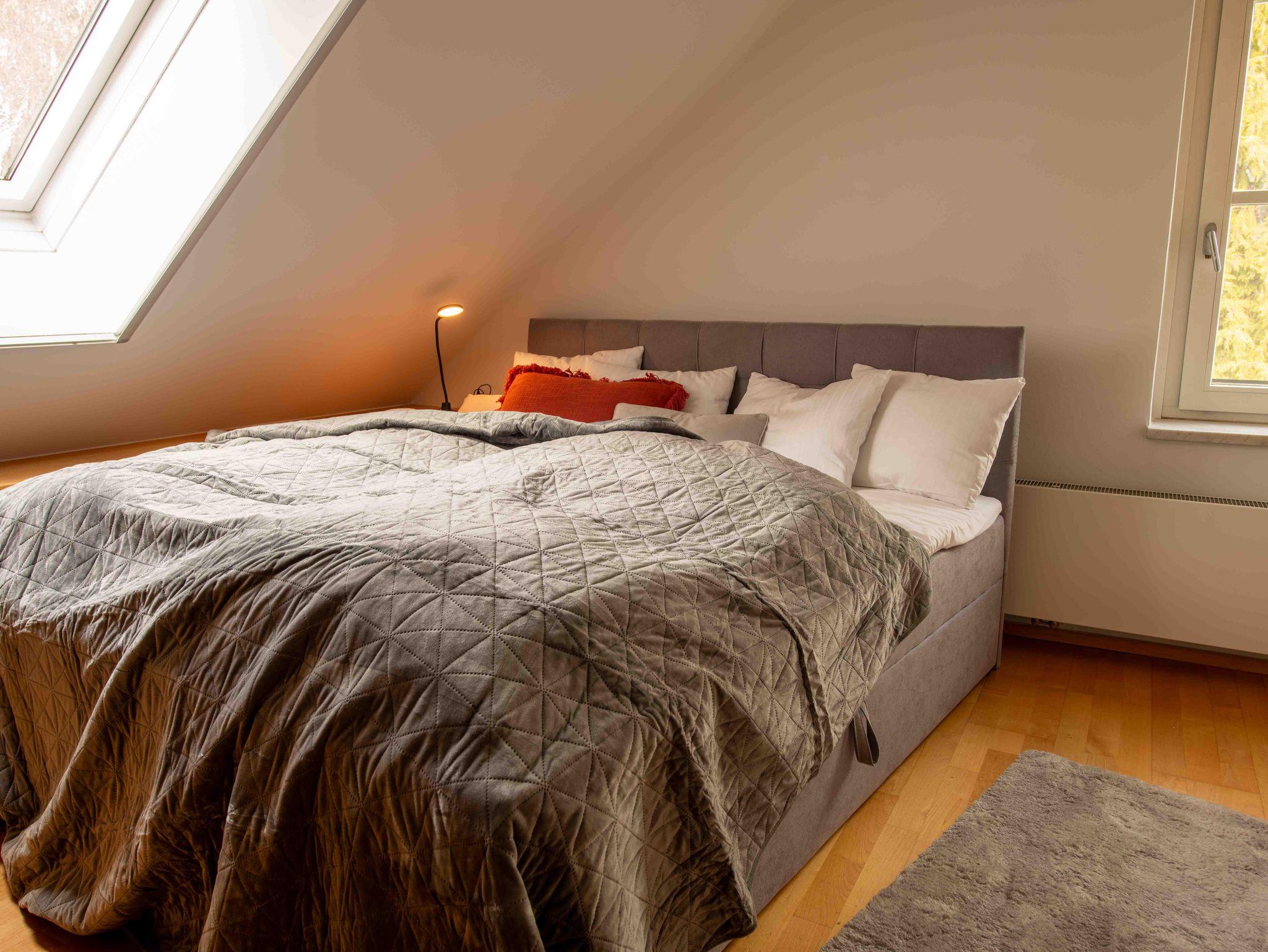 Die Unterkunft bietet exklusiven Wohnkomfort mit 4 getrennten Schlafzimmern mit hochwertigen Doppelbetten, einem Zusatzbett im Master Bedroom sowie einer Schlafcouch. Zwei moderne Badezimmer, zwei separate WCs, eine voll ausgestattete Küche mit großem Essbereich, Waschmaschine, Trockner, TV in allen Zimmern und kostenloses WLAN sorgen für höchsten Komfort. Highlight: die private Innensauna für entspannte Wellnessmomente.