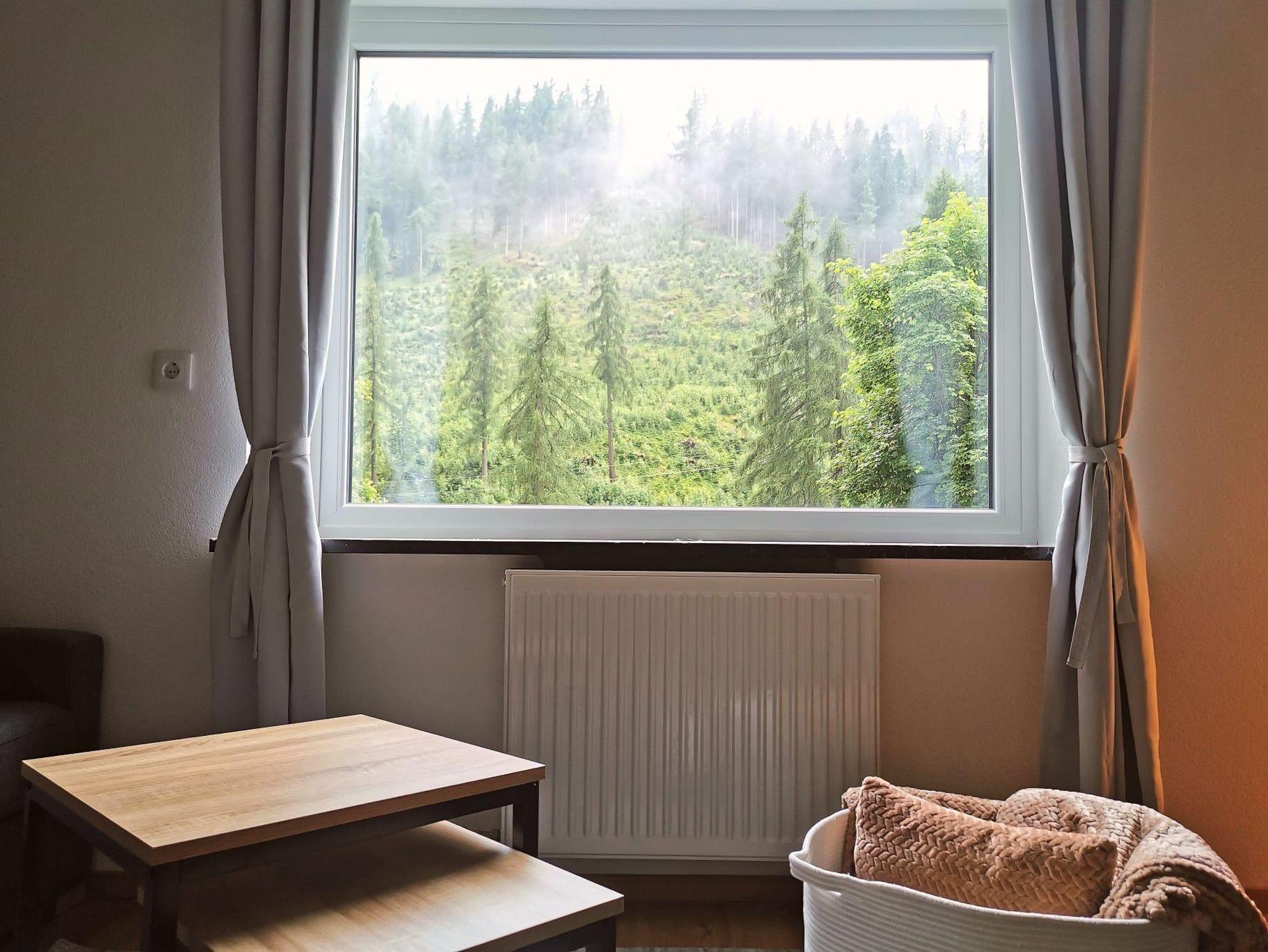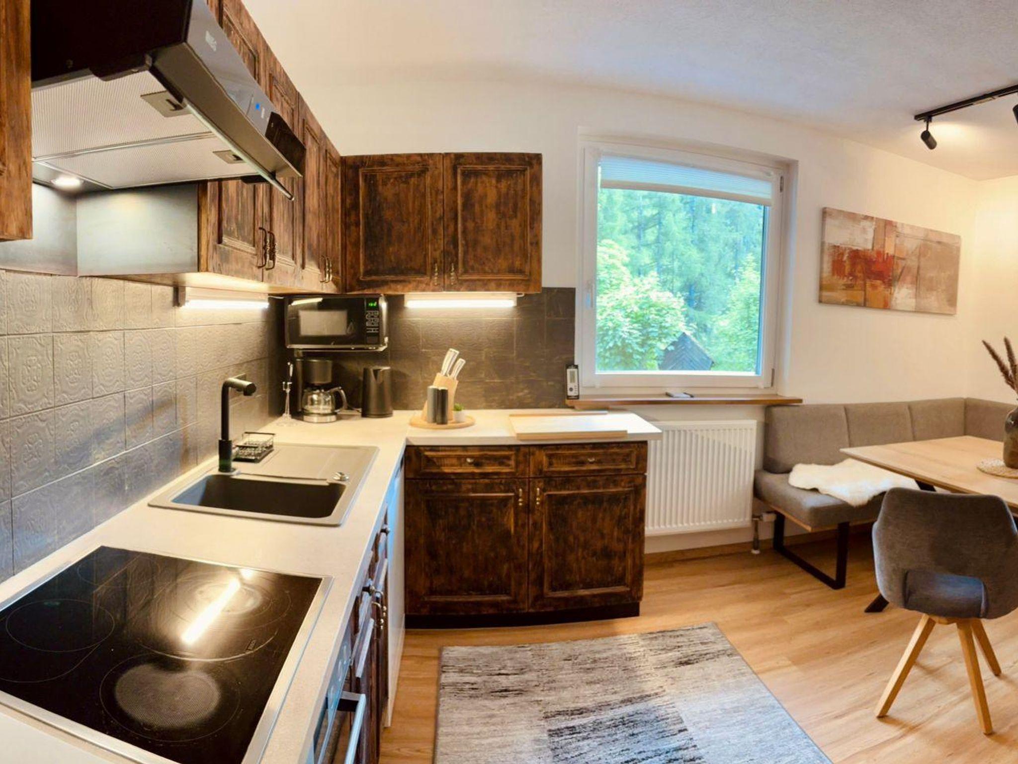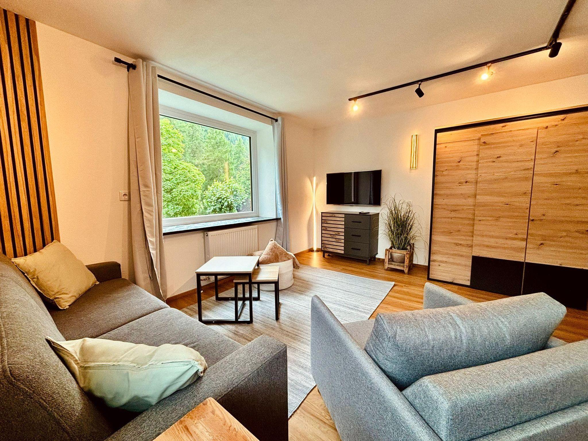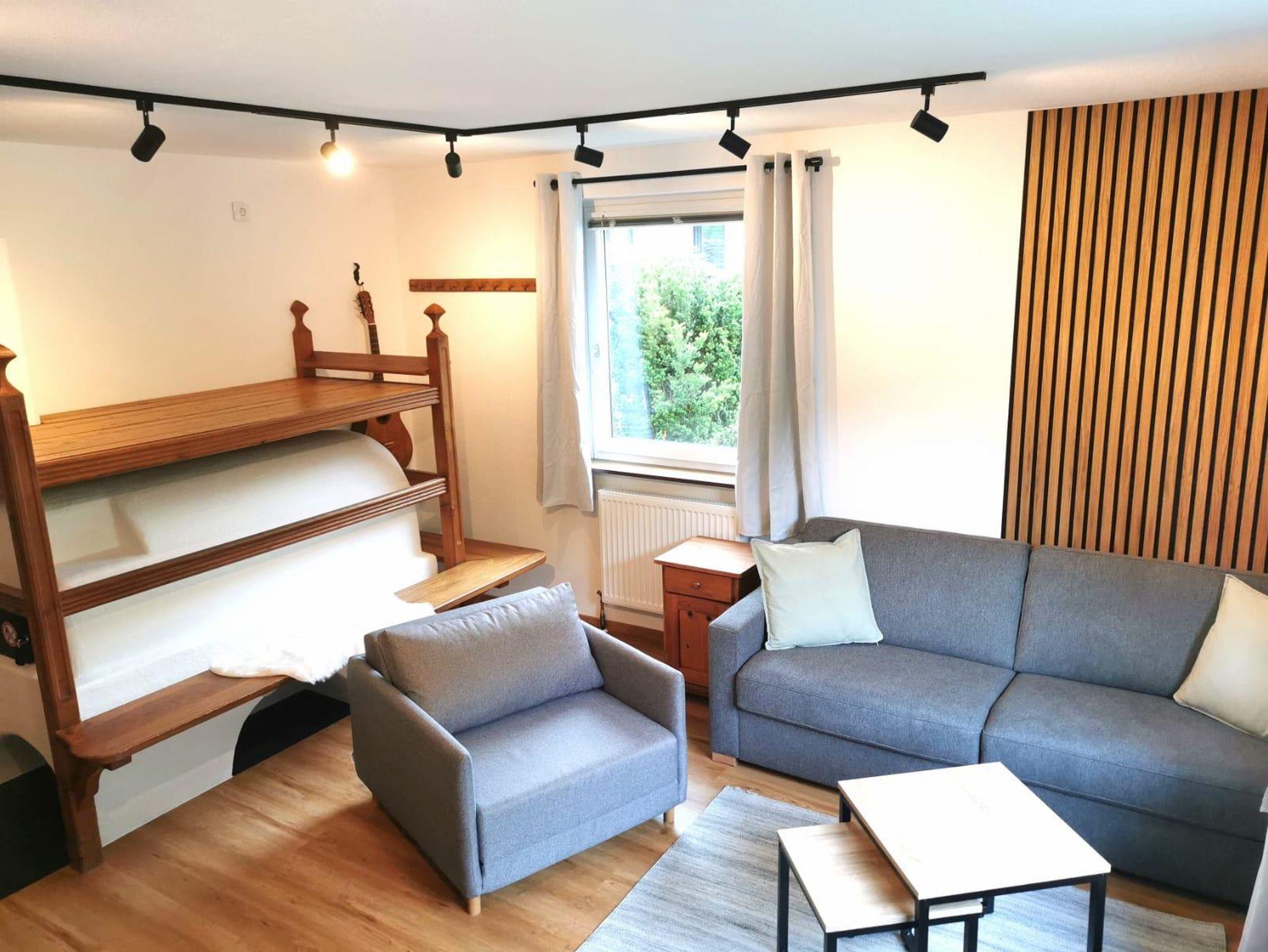 Die sehr gut ausgestattete Wohnküche lädt zum Kochen und Entspannen ein. Die Wohnung verfügt über eine Terrasse, ein Schlafzimmer sowie ein Wohn-/Schlafzimmer mit Panoramafenster, das einen herrlichen Ausblick auf die Natur bietet. Das große Badezimmer mit WC sowie ein separates Gäste-WC sorgen für extra Komfort. Ein Skispind steht Ihnen ebenfalls zur Verfügung.