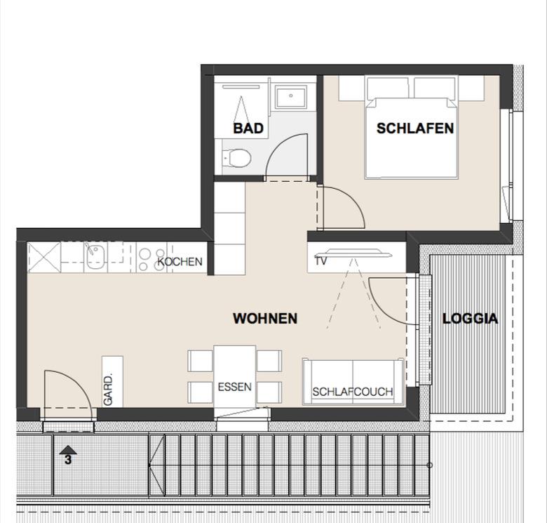 Das Apartment verfügt über ein helles gemütliches Schlafzimmer, ein modernes kleines Bad mit Walk-in Dusche und WC, einem lichtdurchflutetem Wohn/Essbereich mit top-ausgestatteter Küche und einer schönen Lodgia mit Blick auf das Kitzbüheler Horn.