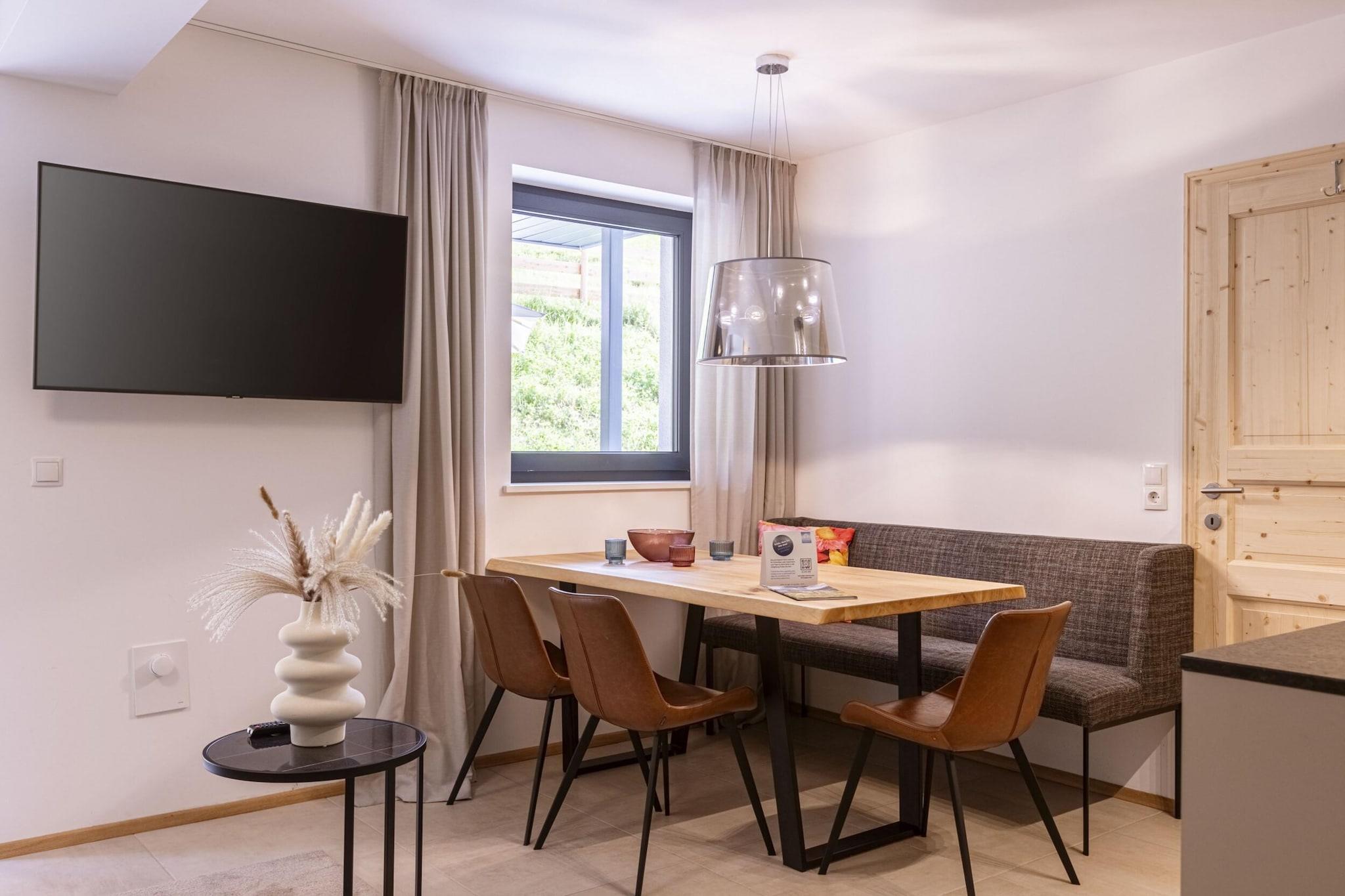 "Opdag komfort og elegance i vores lejlighed i stueetagen, designet til op til 6 gæster. Dette stilfulde tilflugtssted, der spænder over 55 m², tilbyder den perfekte blanding af moderne bekvemmeligheder og fredfyldte omgivelser. Lejligheden har to indbydende soveværelser, hver møbleret med plysæske. springdobbeltsenge, hvilket sikrer et afslappende ophold. To velindrettede badeværelser er udstyret med brusere, toiletter og hårtørrer for din bekvemmelighed. Slap af i den rummelige opholds-/spisestue, som omfatter en hyggelig siddeplads og et fladskærms-tv. Opholdsrummet har også en 2-personers sovesofa, ideel til ekstra gæster. Træd ud på terrassen fra opholdsstuen for at nyde den friske luft og udsigten. Det fuldt udstyrede køkken er en kulinarisk fornøjelse, komplet med bestik, køkkengrej, en keramisk kogeplade, ovn, køleskab med fryser og en opvaskemaskine. Yderligere bekvemmeligheder omfatter en brødrister, elkedel og kaffemaskine. Et startsæt med opvaskemaskinefaner, opvaskemiddel, en svamp, affaldsposer, rengøringsmidler og et viskestykke leveres til din ankomst. For gæster, der rejser med kæledyr, er hunde velkomne efter anmodning (mod ekstra gebyr). Nyd gratis Wi-Fi under hele dit ophold. Yderligere funktioner: - Rolig beliggenhed i udkanten af skoven - Adgang til et generelt wellness-område med en finsk sauna og en opvarmet udendørs infinity-pool - TennengauPLUS-kort inkluderet for eksklusive lokale rabatter Poolens åbningstider: - Vinter (01.10 - 30.04): 16.00 - 19.00 - Sommer (01.05 - 30.09): 10.00 - 18.00
