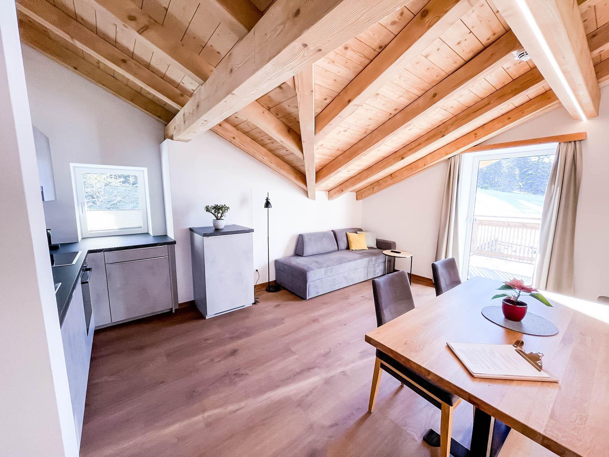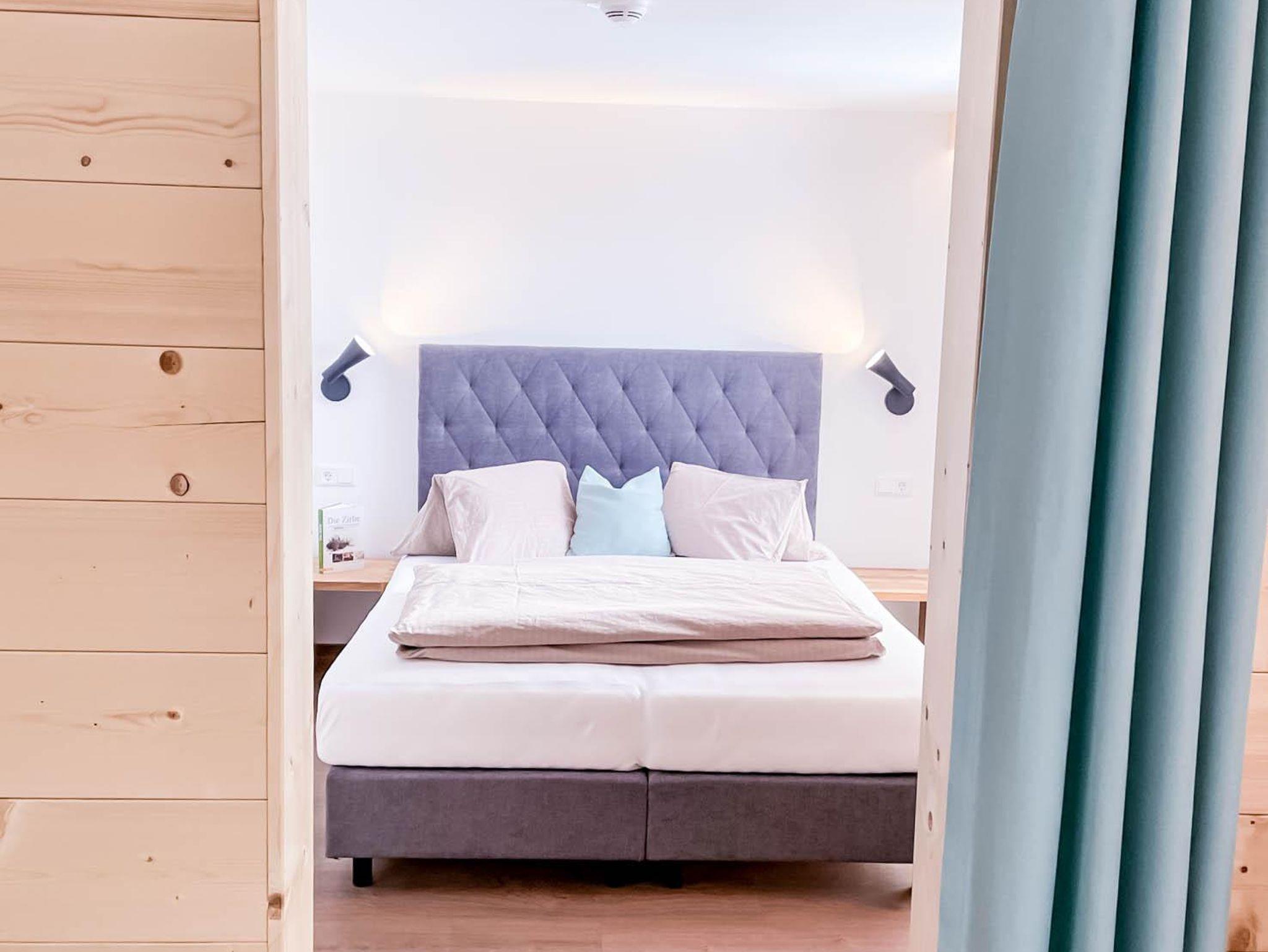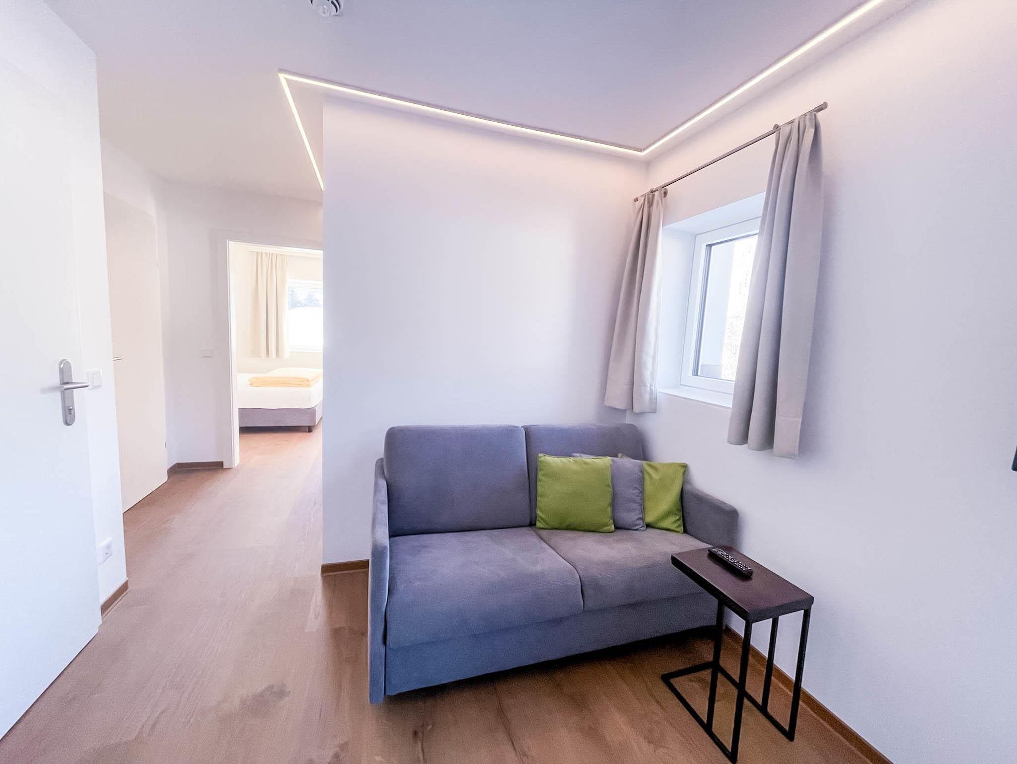 Erwachen im Boxspring-Doppelbett – mit Blick auf die von der Morgensonne angestrahlten Berge – ist besonders schön. Weiters gibt es eine Ausziehcouch als Schlafmöglichkeit im Wohn-Essbereich.