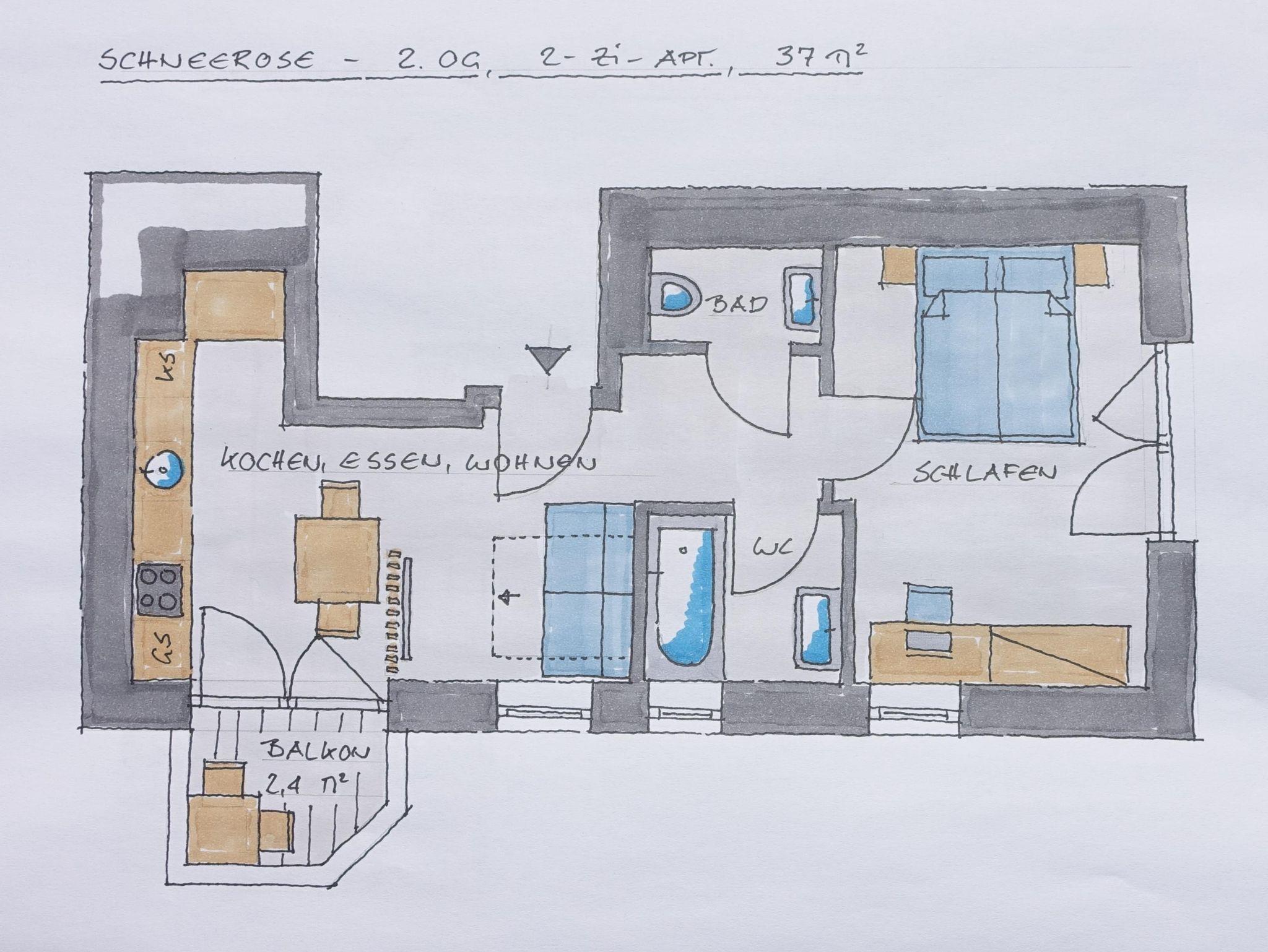 Das gemütliche Appartement Schneerose mit 37 m² liegt im 2. Stock mit Blick nach Westen, so kann man die wunderbaren Sonnenuntergänge beobachten. Es verfügt über einen geschützten Balkon mit Blick zur gegenüberliegenden Bergseite.