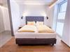 Erholsamen Schlaf bietet das Boxspring-Doppelbett im kuscheligen Schlafzimmer. Die Couch im Wohn-Essbereich kann als Schlafmöglichkeit für eine weitere Person gerichtet werden und ist mit einem Vorhang vom Schlafzimmer geteilt.