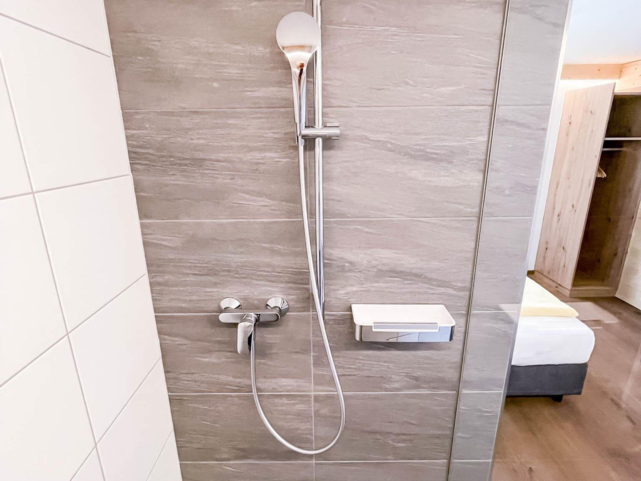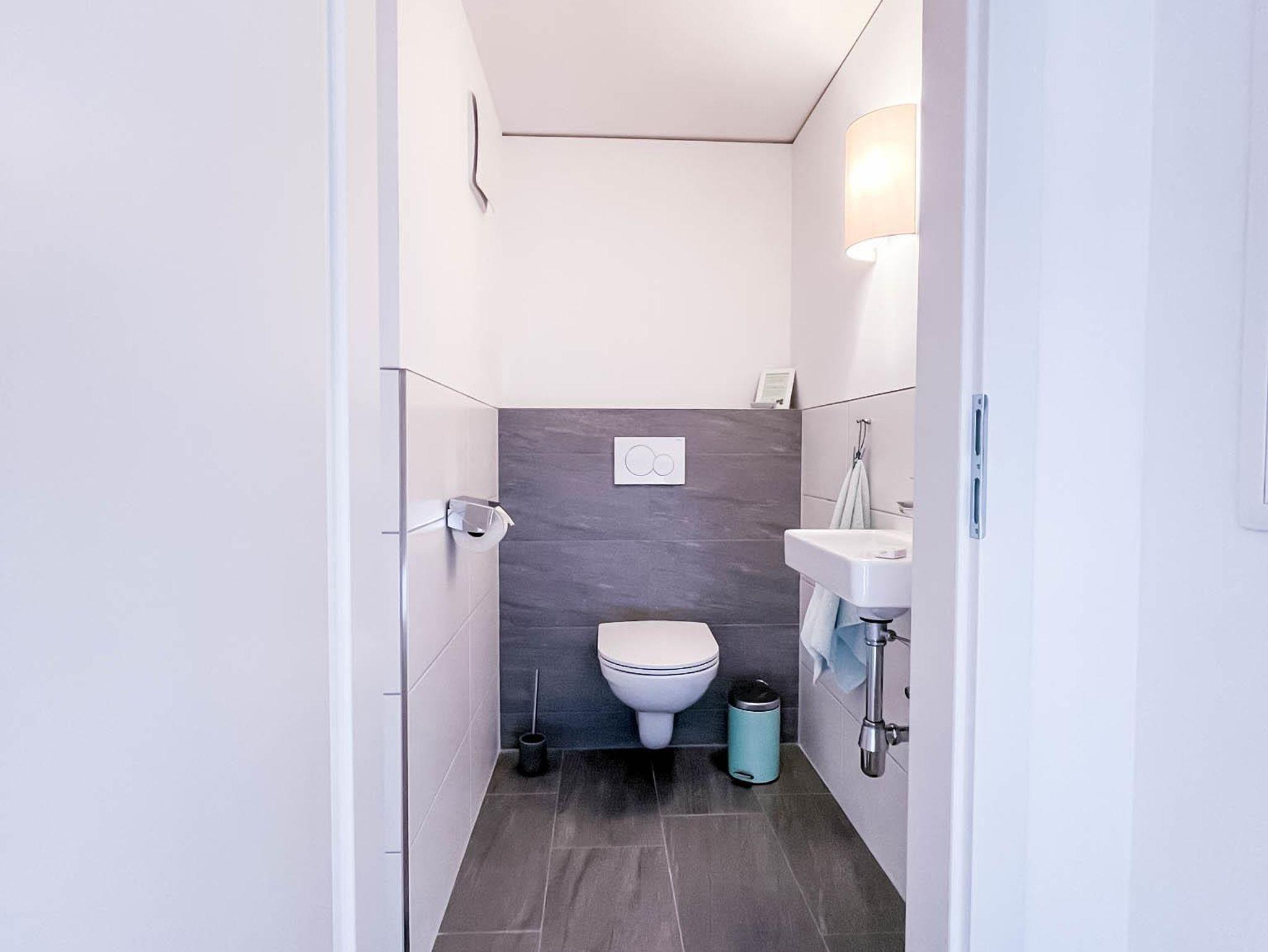 Das halboffene Badezimmer grenzt an das Schlafzimmer und verfügt über Dusche und Fön, das WC ist extra.