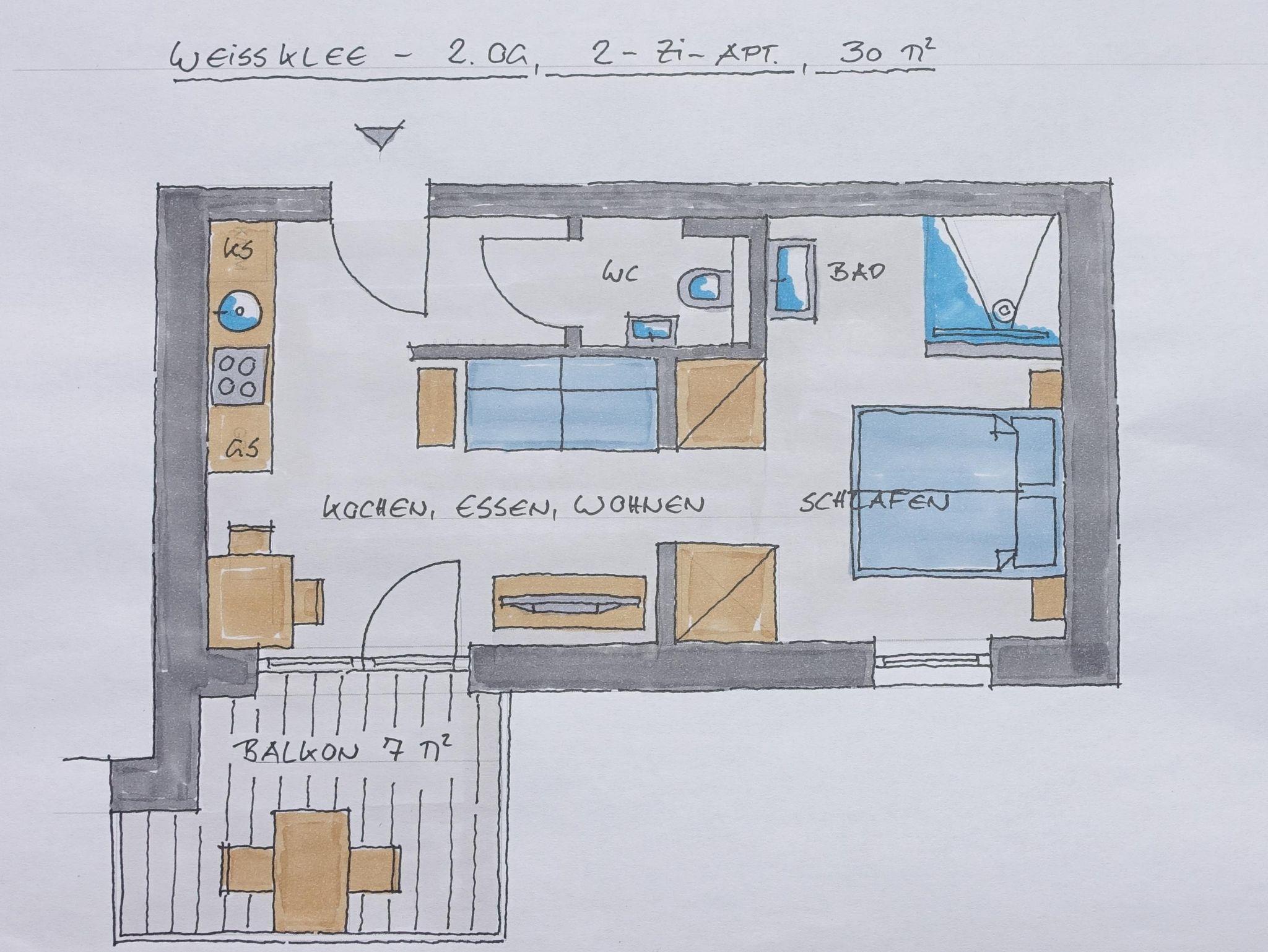 Dieses gemütliche Appartement mit Südausrichtung liegt im 2. Stock, es hat einen sonnigen, großen Balkon und Blick auf den Österreichberg. Der gemütliche Wohn-Essbereich mit vollausgestatteter Küche und Flat-screen TV lädt zum Verweilen ein.