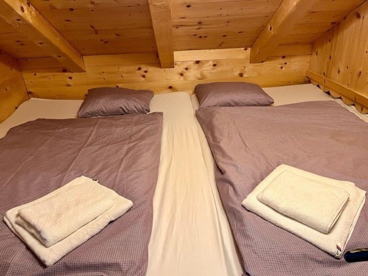 darüber ein Hochbett unter dem Dachgiebel, erreichbar über eine Leiter – ein abenteuerlicher Schlafplatz für bis zu 4 Kinder