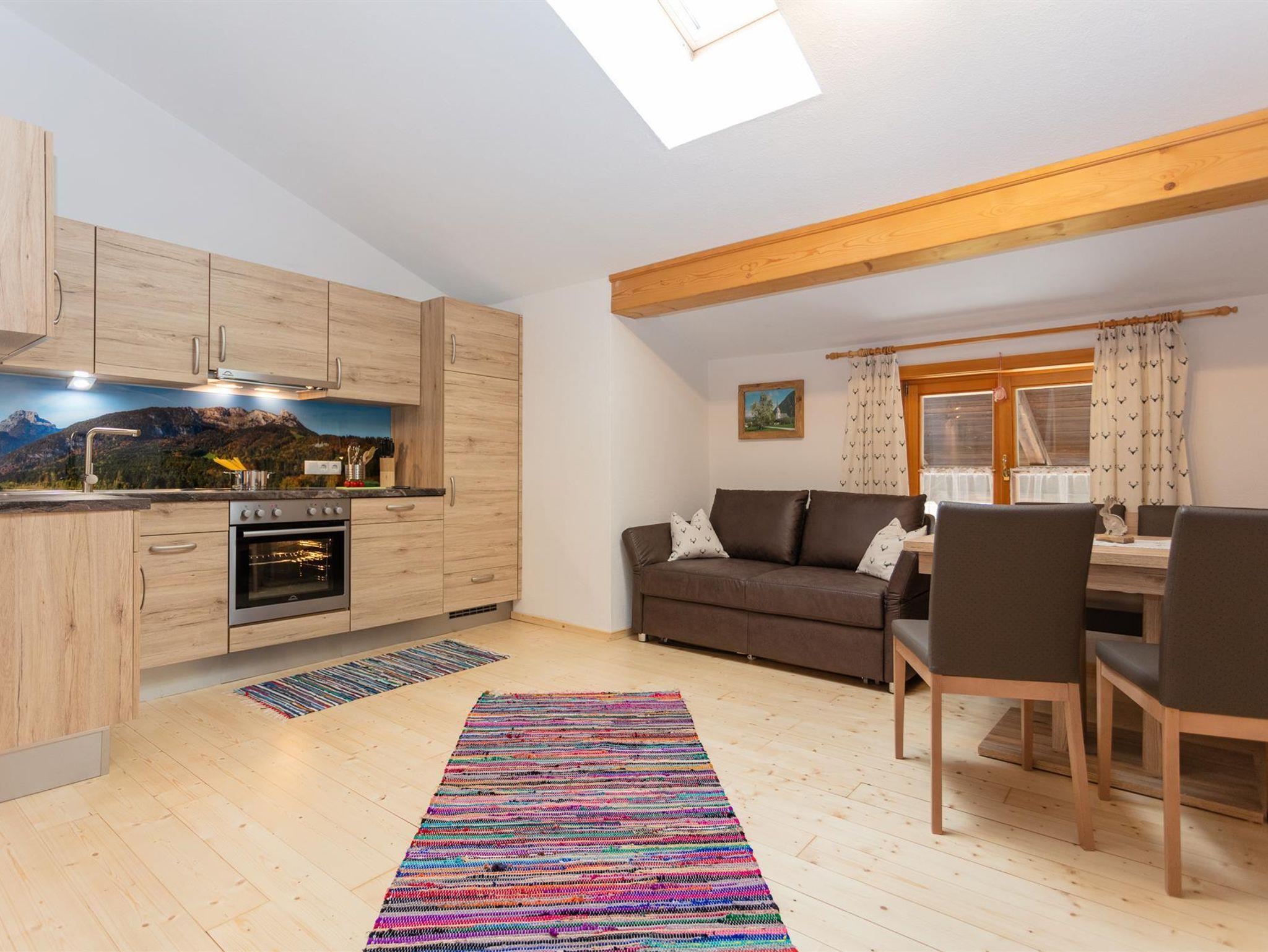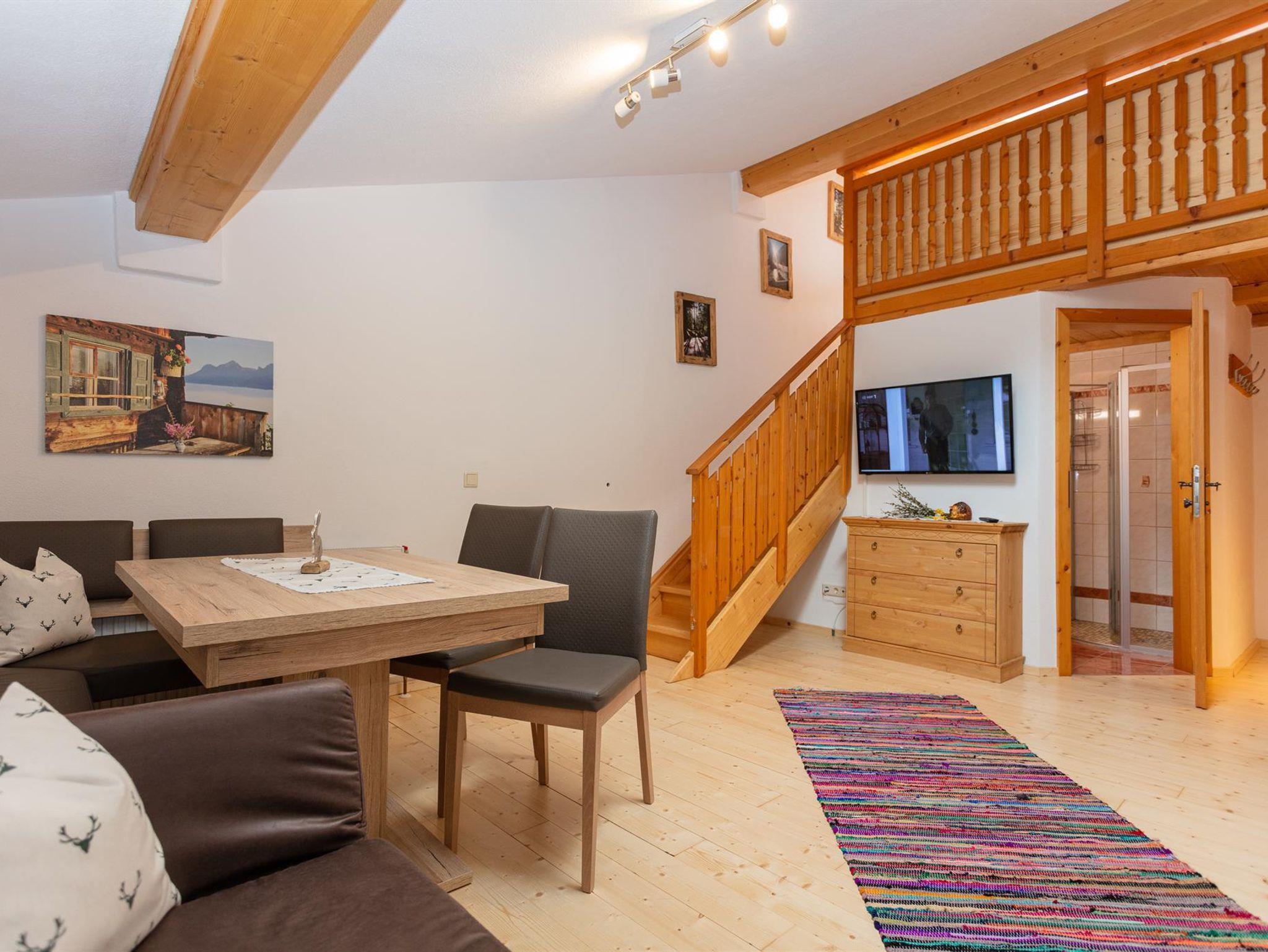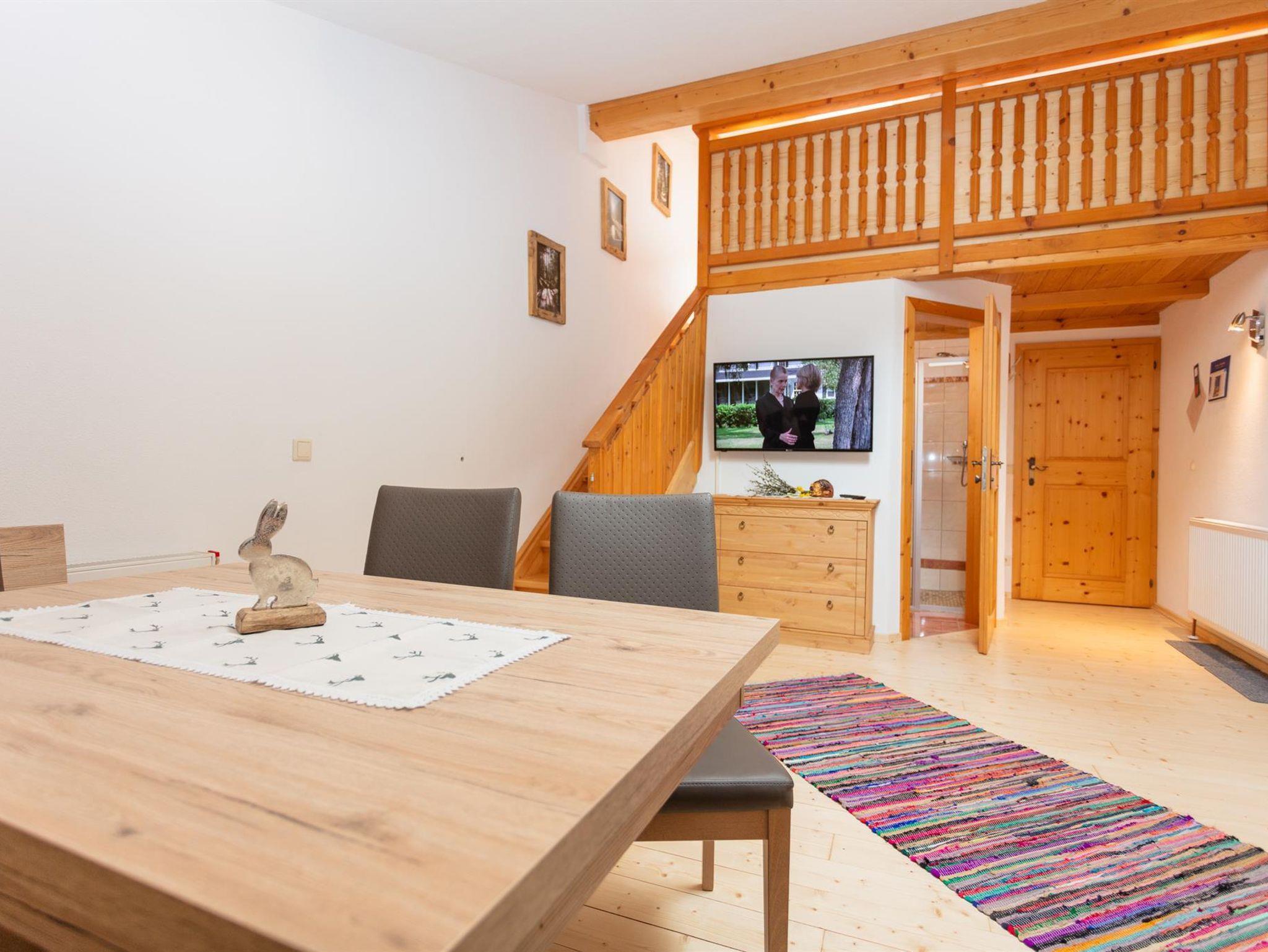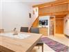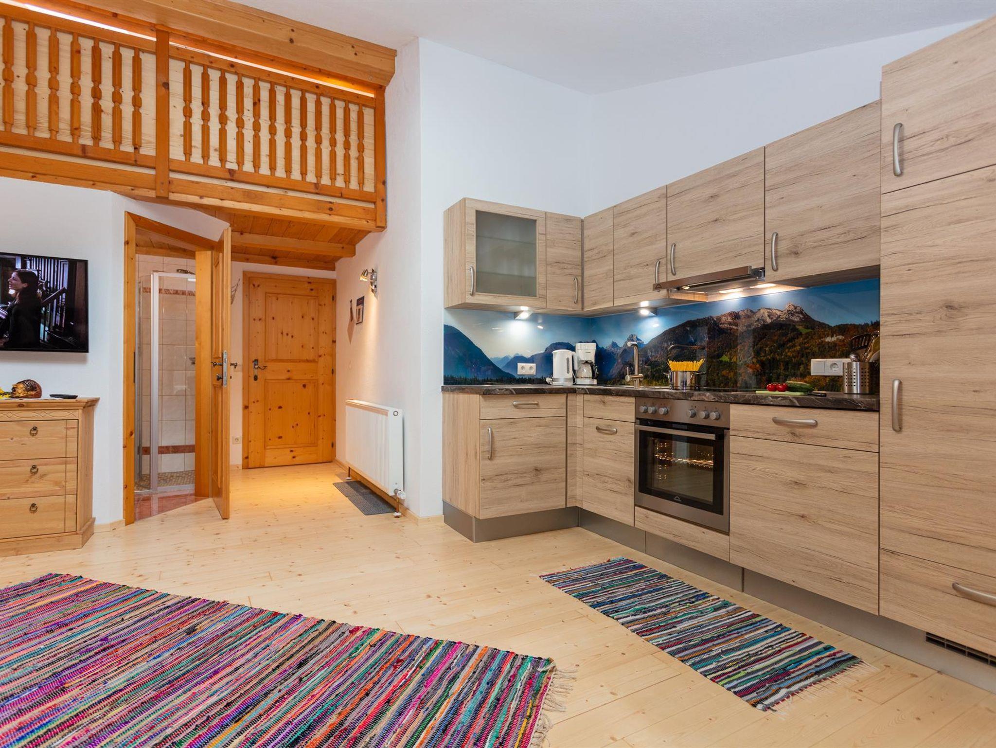Die gemütliche Wohnung mit Almhüttenflair liegt im 2. Stock, sie hat eine Wohnküche mit Kühlschrank, E-Herd, Geschirrspüler, ausziehbare Ledercouch gemütlicher Sitzecke. Über die Treppe geht es rauf auf die Galerie, wo sich der Schlafbereich befindet.