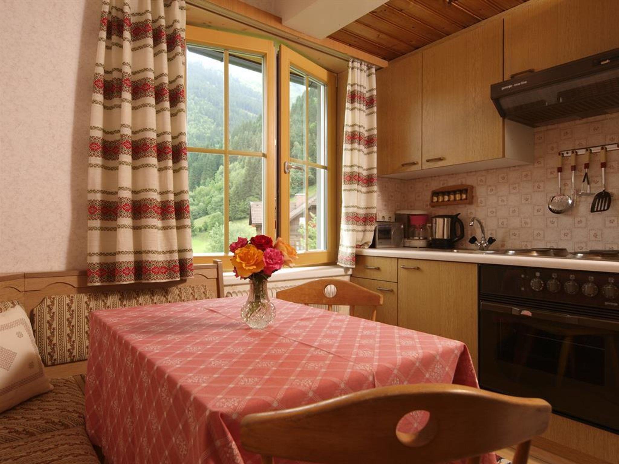 Unser, mit Zirbenholz ausgestattetes, Appartement bietet Ihnen 1 Schlafzimmer mit Doppelbett und Couch, Wohnküche mit Kochnische und Essecke, Vorraum, Dusche/WC und Balkon