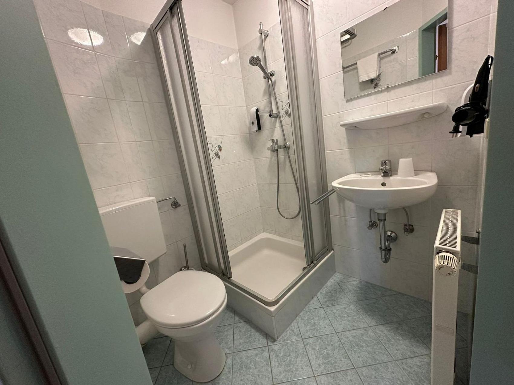 Das Pensionszimmer befindet sich auf der Seite des ruhigen und geschützten Innenhofes. Die schalldichten Fenster sorgen für eine angenehme Nachtruhe.