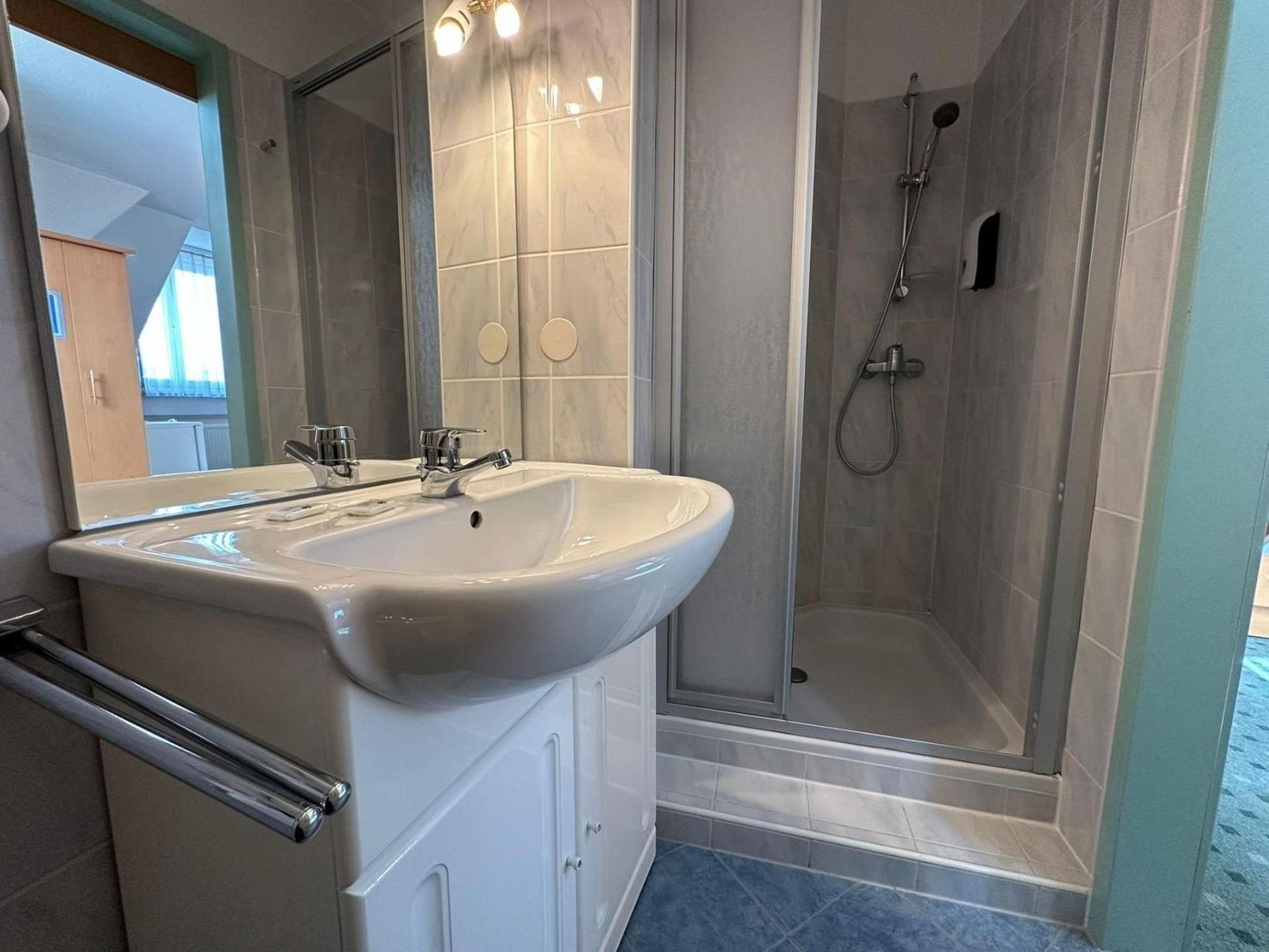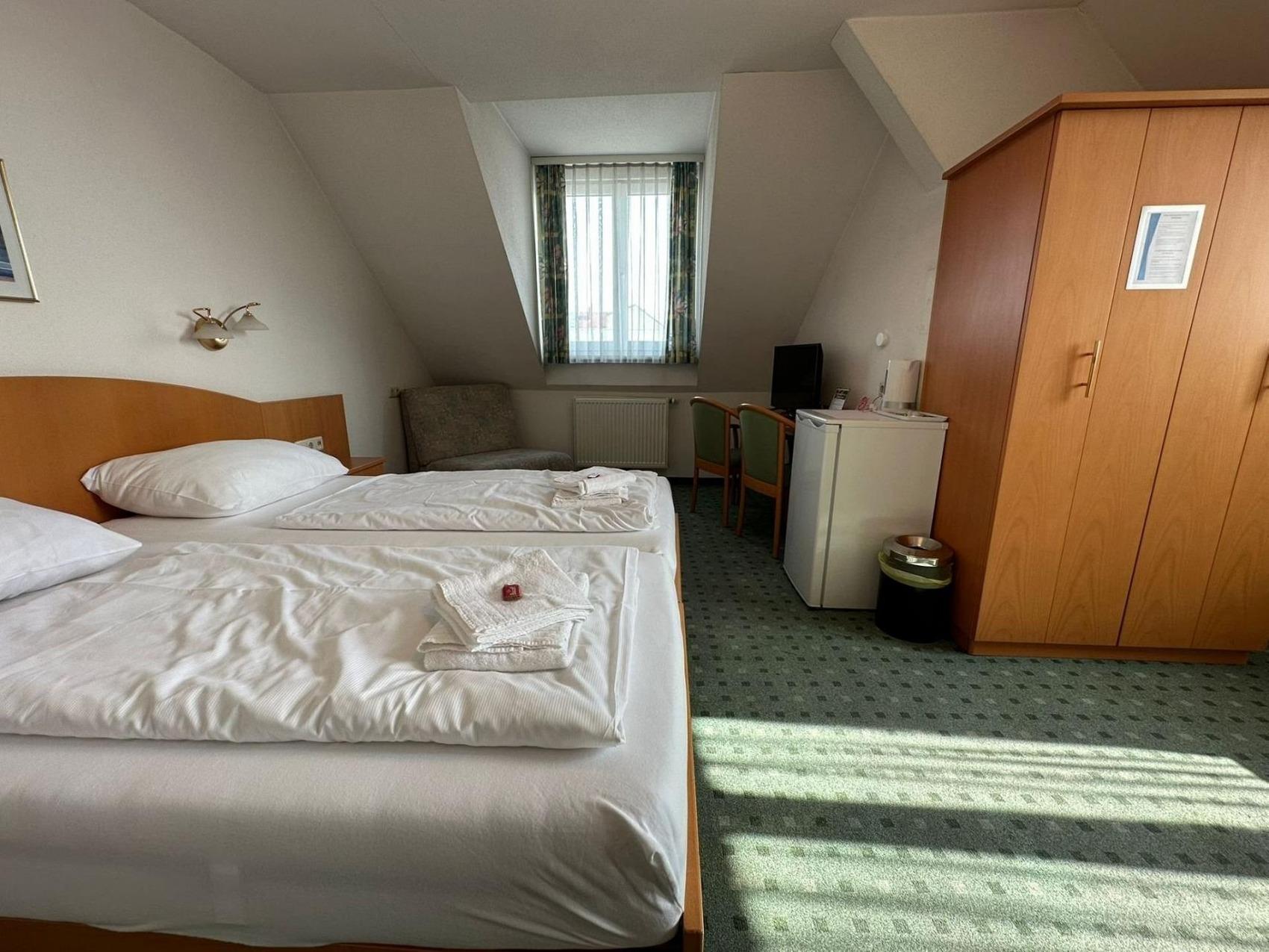 Ihr großes Doppelzimmer Nr. 207 im 2. Stock ist ausgestattet mit einem Doppelbett (Kingsize), TV, Kühlschrank, Schreibtisch, WLAN, Duschbad/WC.