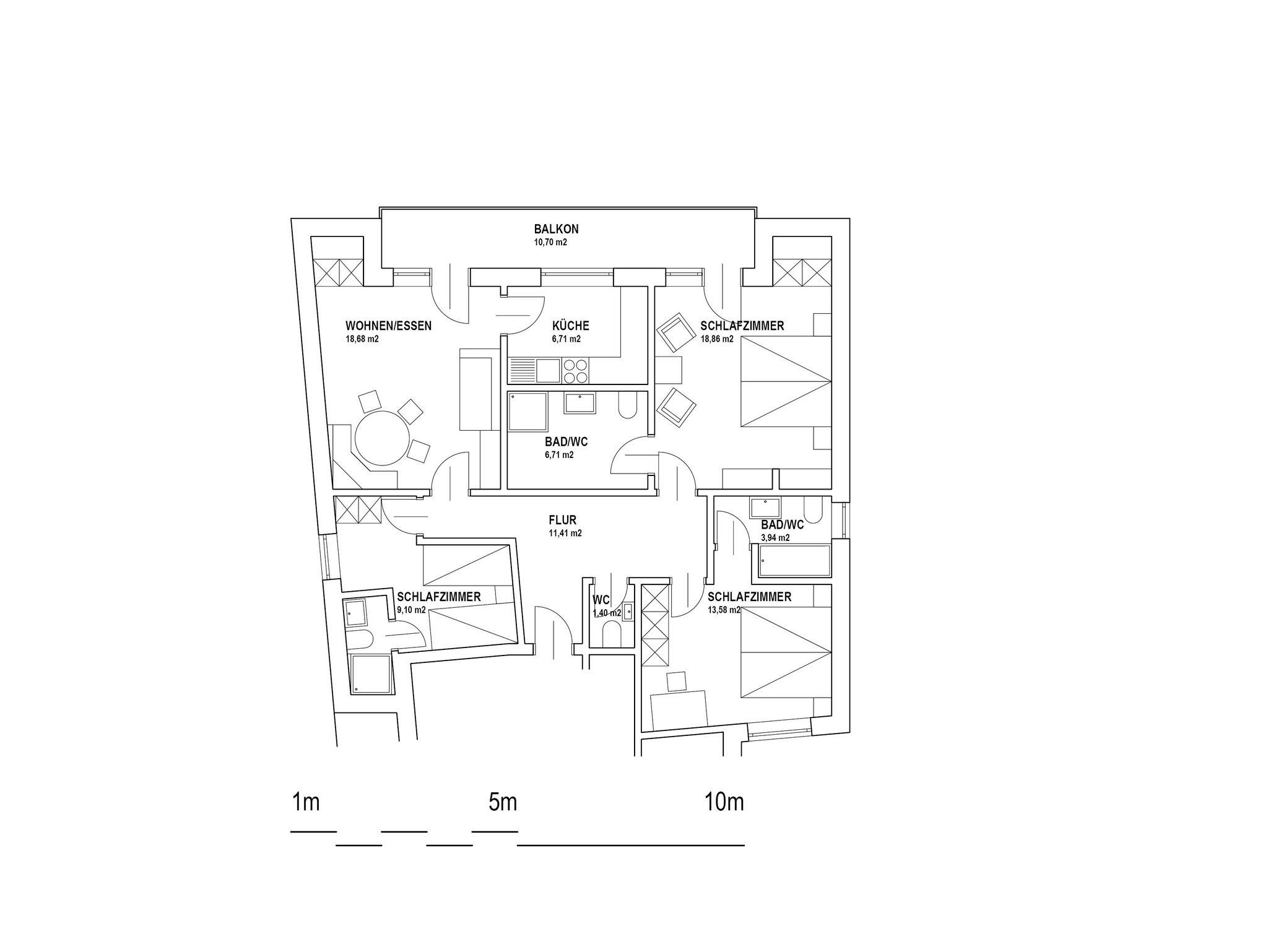 3 Doppelbettschlafzimmer und jedes mit eigenem Bad und WC. Komplett eingerichtete Küche, Wohnzimmer, Vorraum und großer Balkon. Bett- und Frotteewäsche ist im Preis inkludiert.