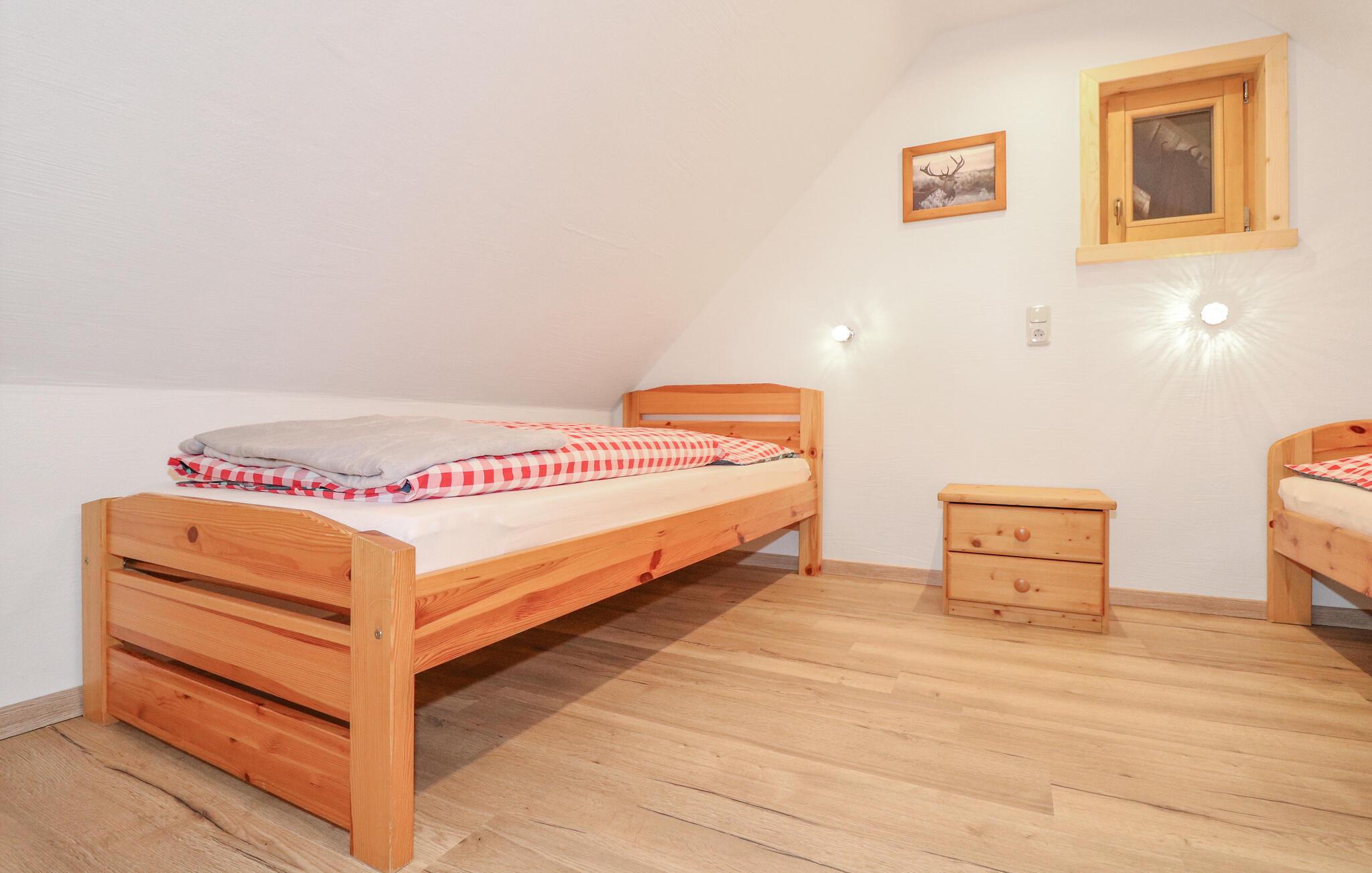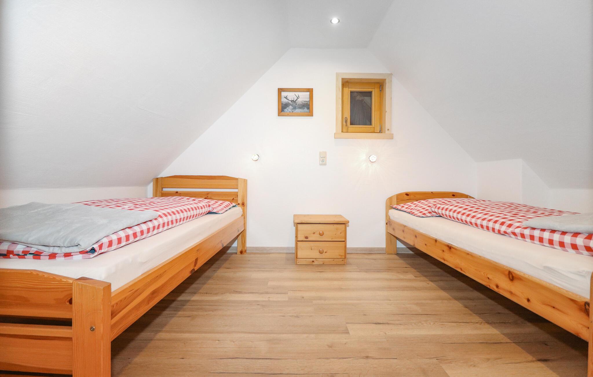 Tilbring jeres ferie i dette feriehus med alpin charme. Den rolige beliggenhed og autentiske atmosfære gør dette sted oplagt til afslappende dage omgivet af naturen. Den hyggelige stue byder jer velkommen med sine træpanelvægge, en rustik hjørnebænk og håndlavede møbler. Nyd måltider sammen ved det kærligt dækkede bord og lad jer betage af den hjemlige atmosfære. Saunaen tilbyder yderligere øjeblikke af velvære.