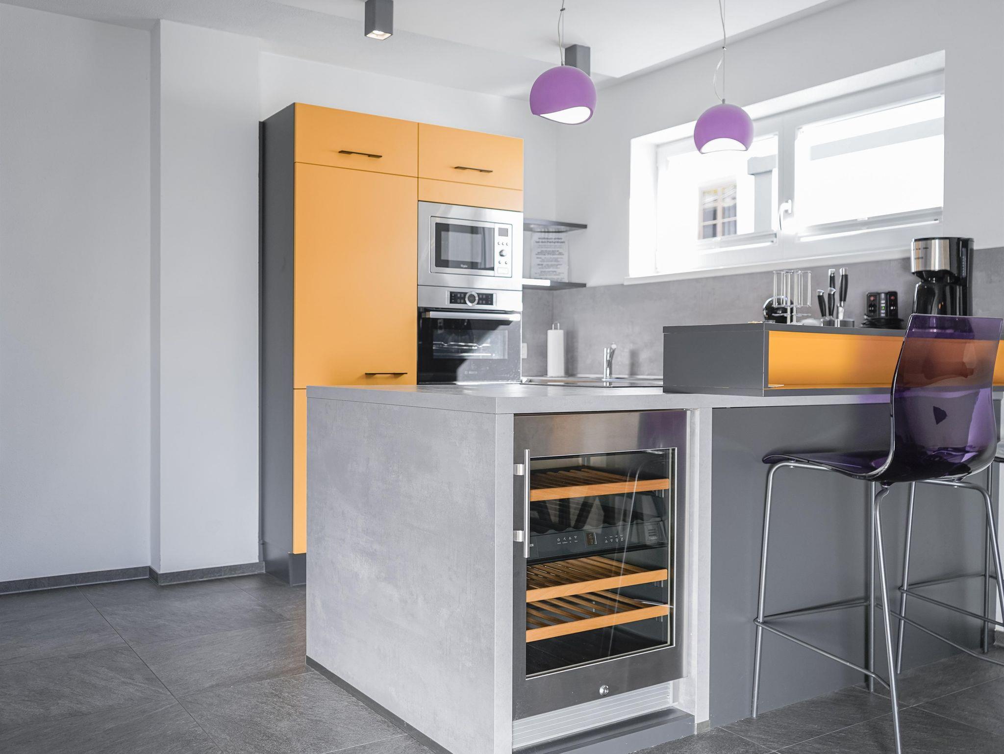 Die Küche ist voll ausgestattet. Im Wohnbereich sorgt ein FlachBildschirm für ein optimales Fernsehbild zum Relaxen.