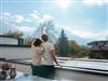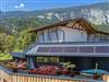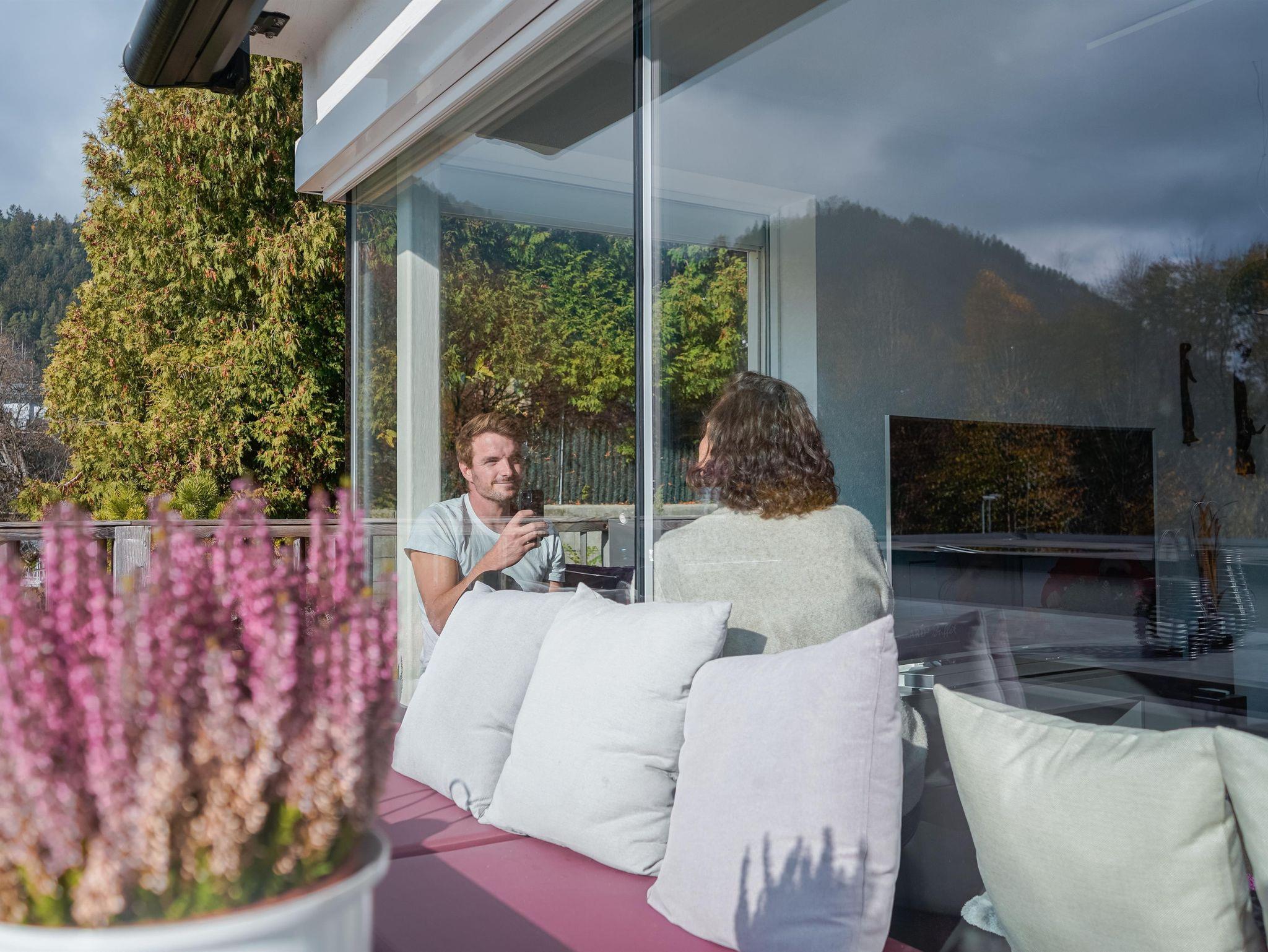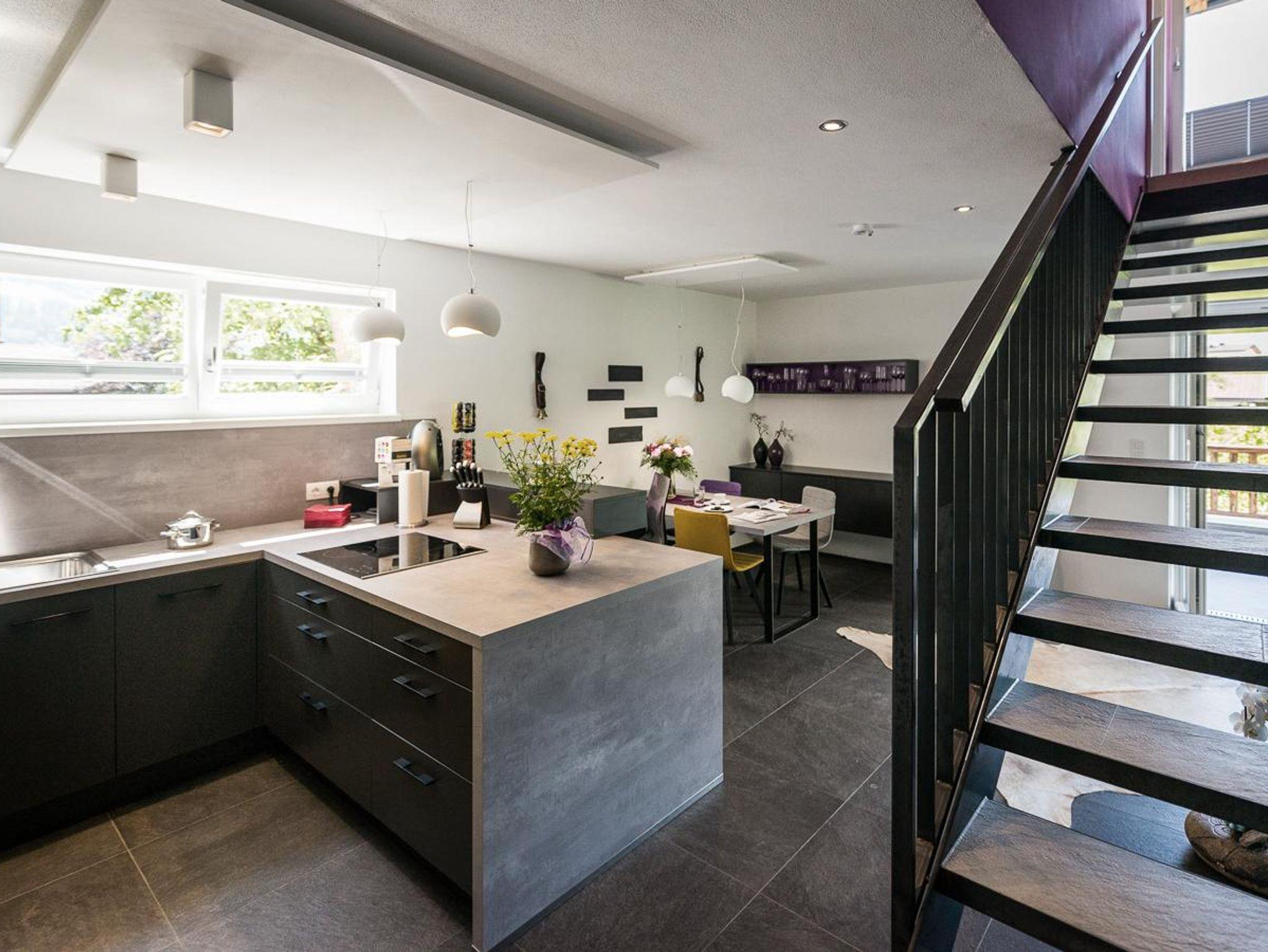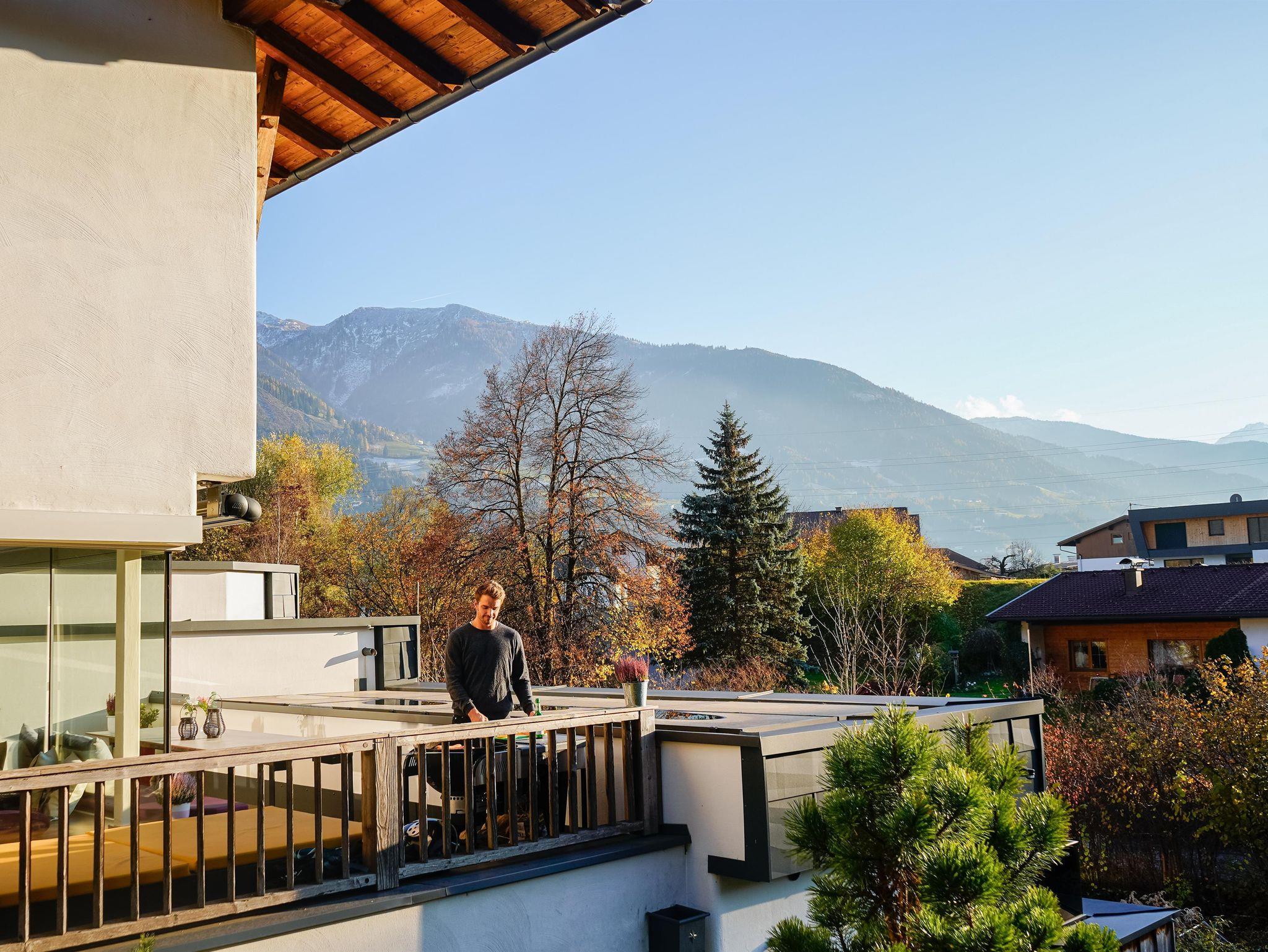 Das Erdgeschoss des Ferienhauses Schiefer ist sehr offen gestaltet. Die große Fensterfront Richtung Westen bietet einen wunderbaren Blick auf die Bergkulisse, die man auf der Terrasse gemeinsam mit dem Rauschen des Wildbachs genießen kann. Auf der selben Terrasse wartet ein Holzkohle-Griller auf seinen Einsatz.