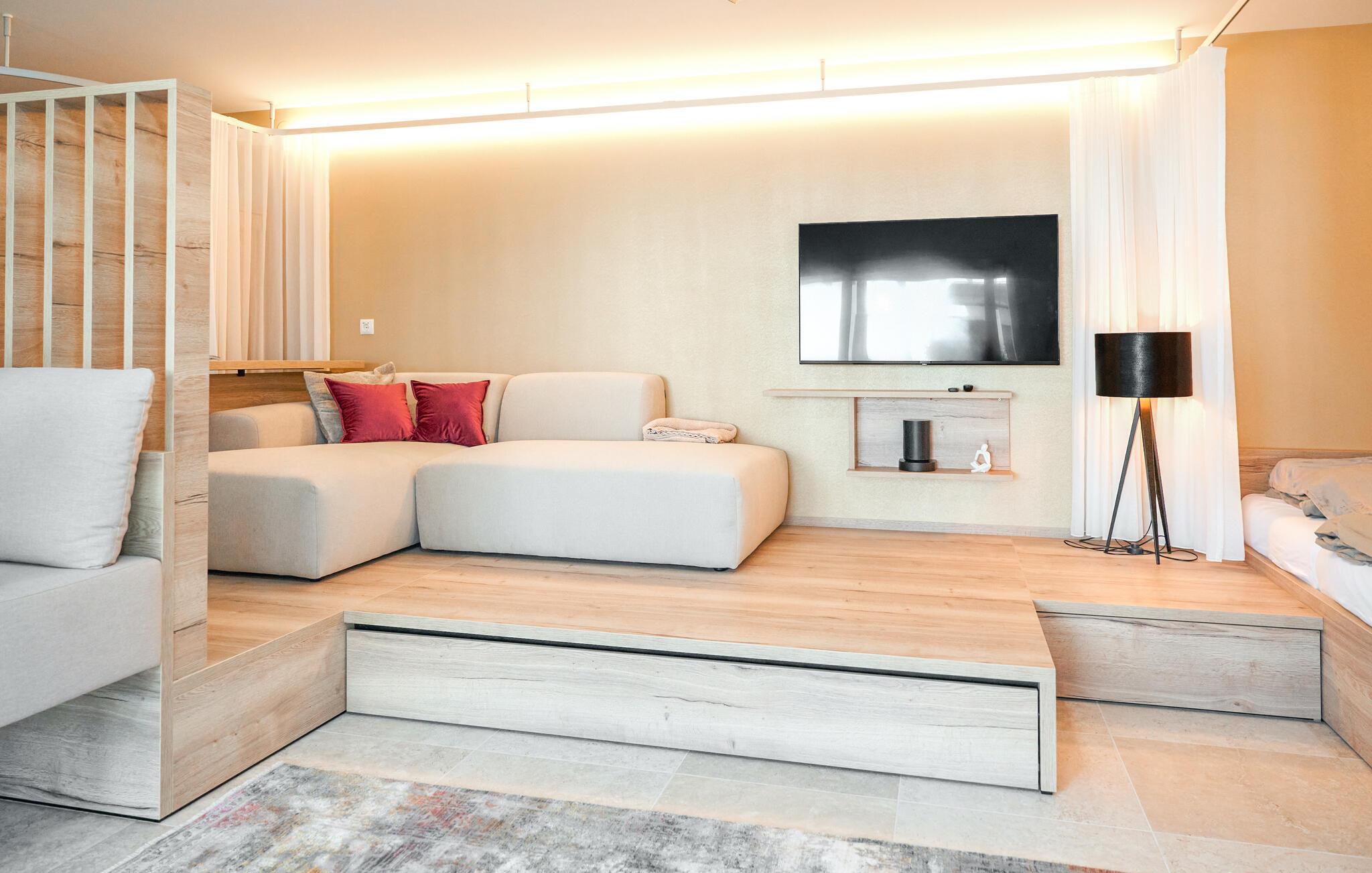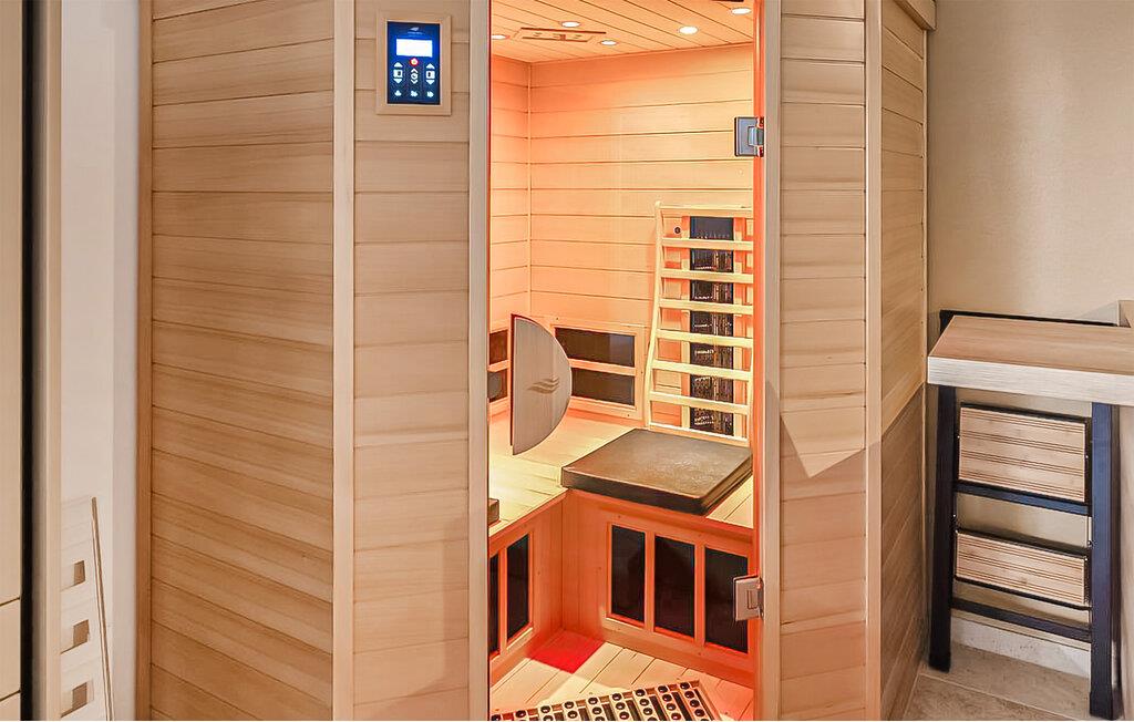 Sæt hverdagen på pause og nyd afslappende dage for to i dette komfortable hjem. Træd ind i en smagfuld stue med moderne møbler og tiltalende farver. Her kan I virkelig finde jer selv til rette efter jeres aktiviteter. Nyd måltider sammen ved spisebordet, mens I lægger planer for den næste dag, og slap af i den infrarøde kabine.