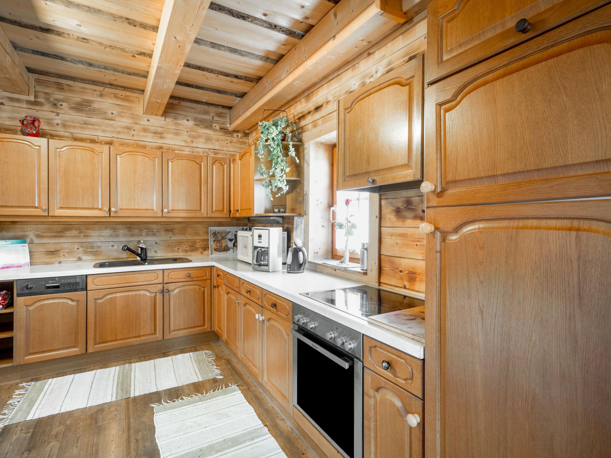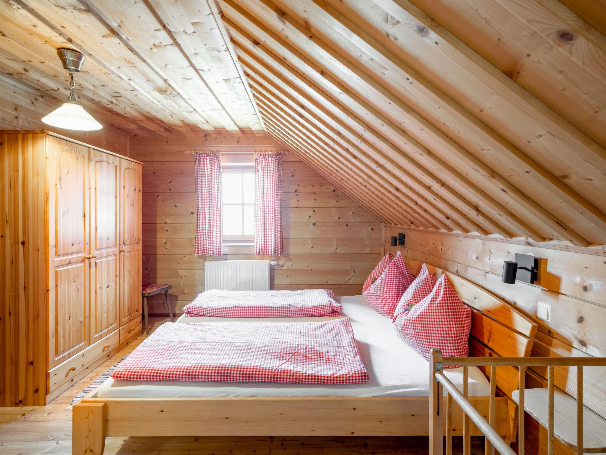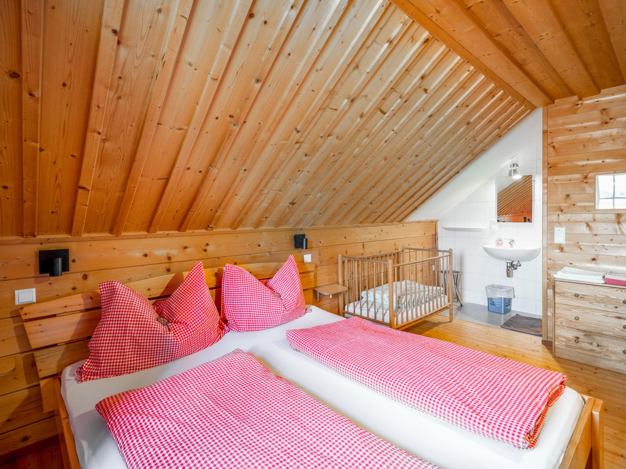 "Steiners Blockhütte", 6-room house 160 m2 on 2 levels. Cosy and wooden furniture furnishings: large living/dining room with Scandinavian wood stove, dining table and dining nook. Living/sleeping room with 1 double sofabed, satellite TV and DVD. Exit to the terrace. Open kitchen (oven, dishwasher, 4 ceramic glass hob hotplates, kettle, electric coffee machine). Shower/WC. Upper floor: 3 rooms with sloping ceilings, each room with 1 double bed, hand-basin and shower. 1 room with sloping ceilings with 1 double bed and hand-basin. Sep. WC. Heating, solar energy heating. Wooden floors. Terrace roofed. Terrace furniture, barbecue. Beautiful view of the mountains and the countryside. Facilities: children's high chair, baby cot. Internet (WiFi, free). Maximum 1 pet/ dog allowed. Pets are only allowed in summer! Barbecues are also only permitted in summer.