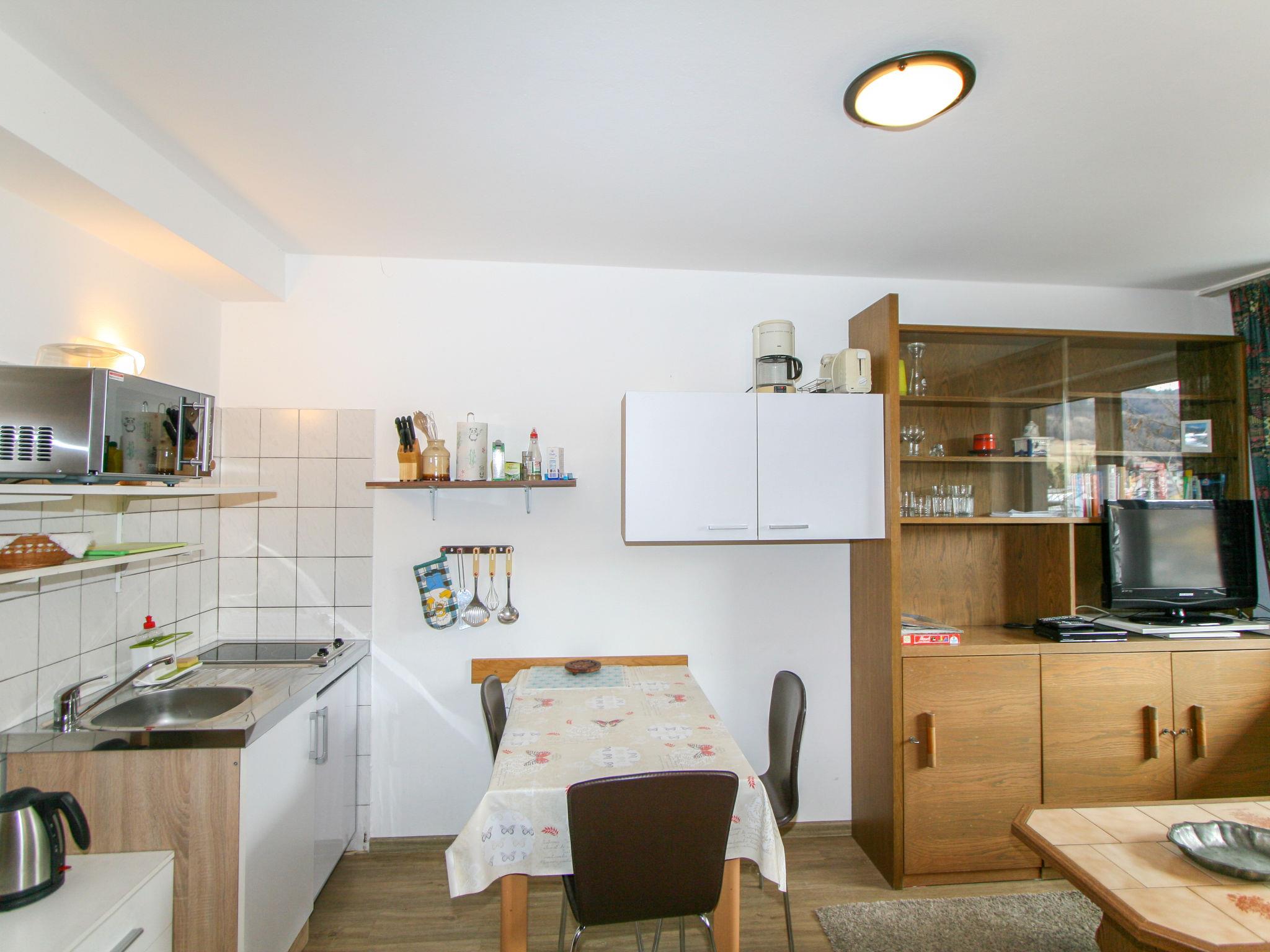 2-room apartment 27 m2 on 1st floor. Practical and cosy furnishings: living/sleeping room with 1 sofabed, dining table and satellite TV. 1 double bedroom with shower/WC. Kitchenette (2 hot plates, oven, toaster, kettle, grill, electric coffee machine, combination microwave). Terrace. Terrace furniture. Beautiful view of the mountains and the resort. Facilities: hair dryer. Internet (WiFi, free). Please note: maximum 1 pet/ dog allowed. Smoke alarm.