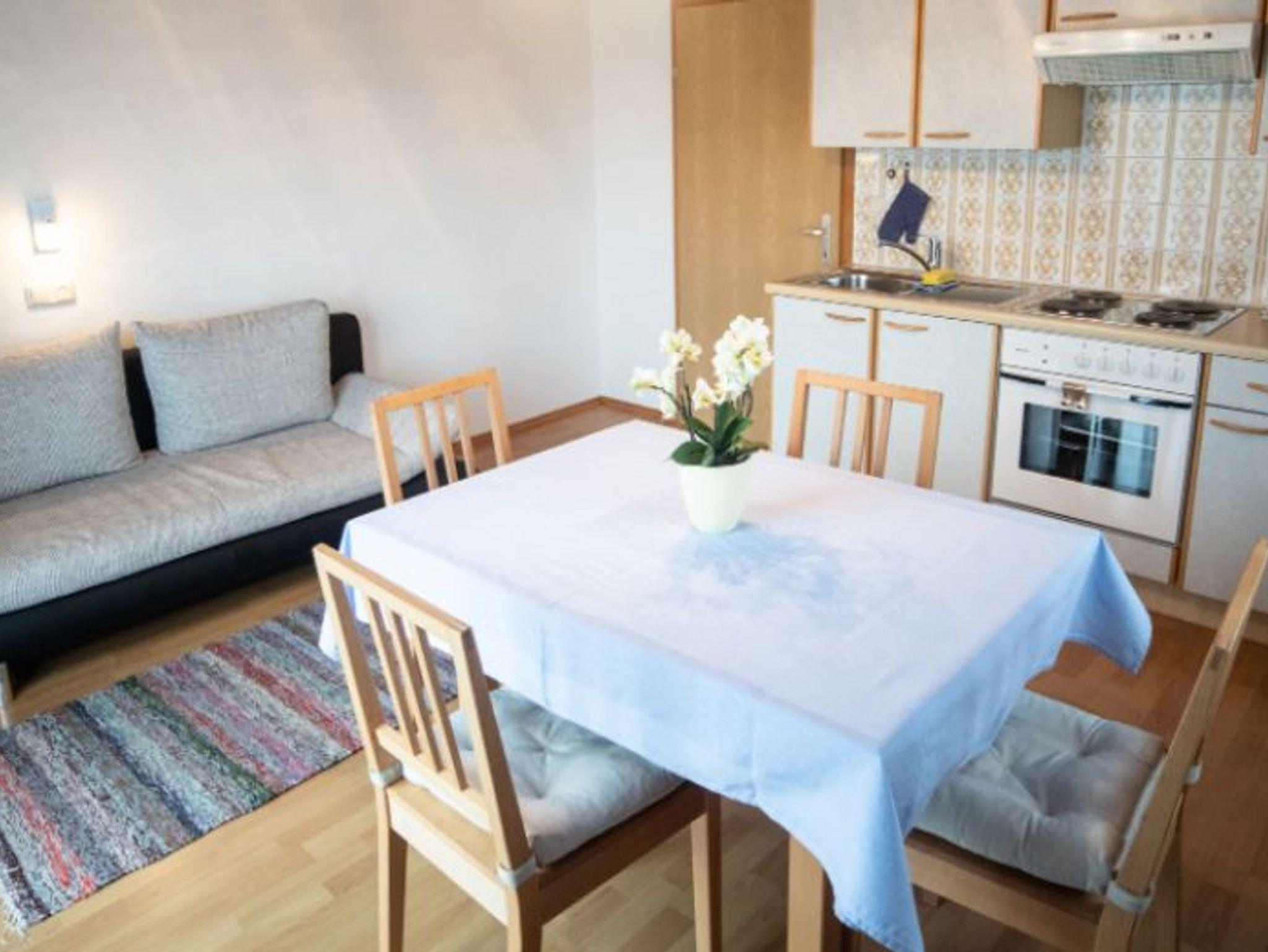 Die Ferienwohnung verfügt über einen Schlafraum mit Doppelbett und Couch, eine Wohnküche, Dusche, WC und Vorraum. Vom Balkon der Ferienwohnung sieht man Richtung Gebirge. Die Wohnung ist im Nebenhaus im 1. Stock. WLAN verfügbar.
