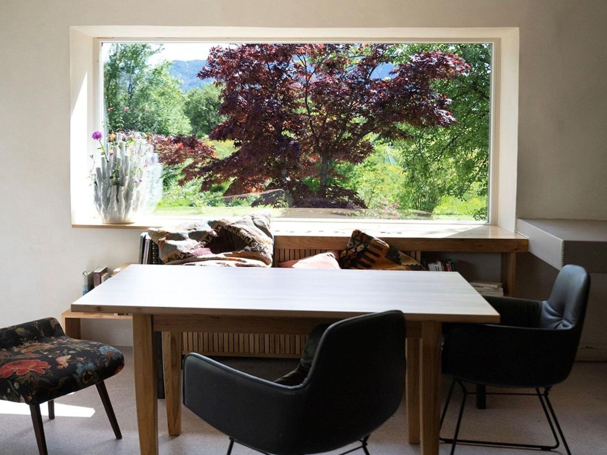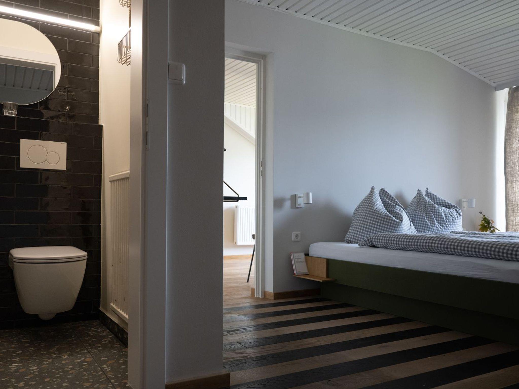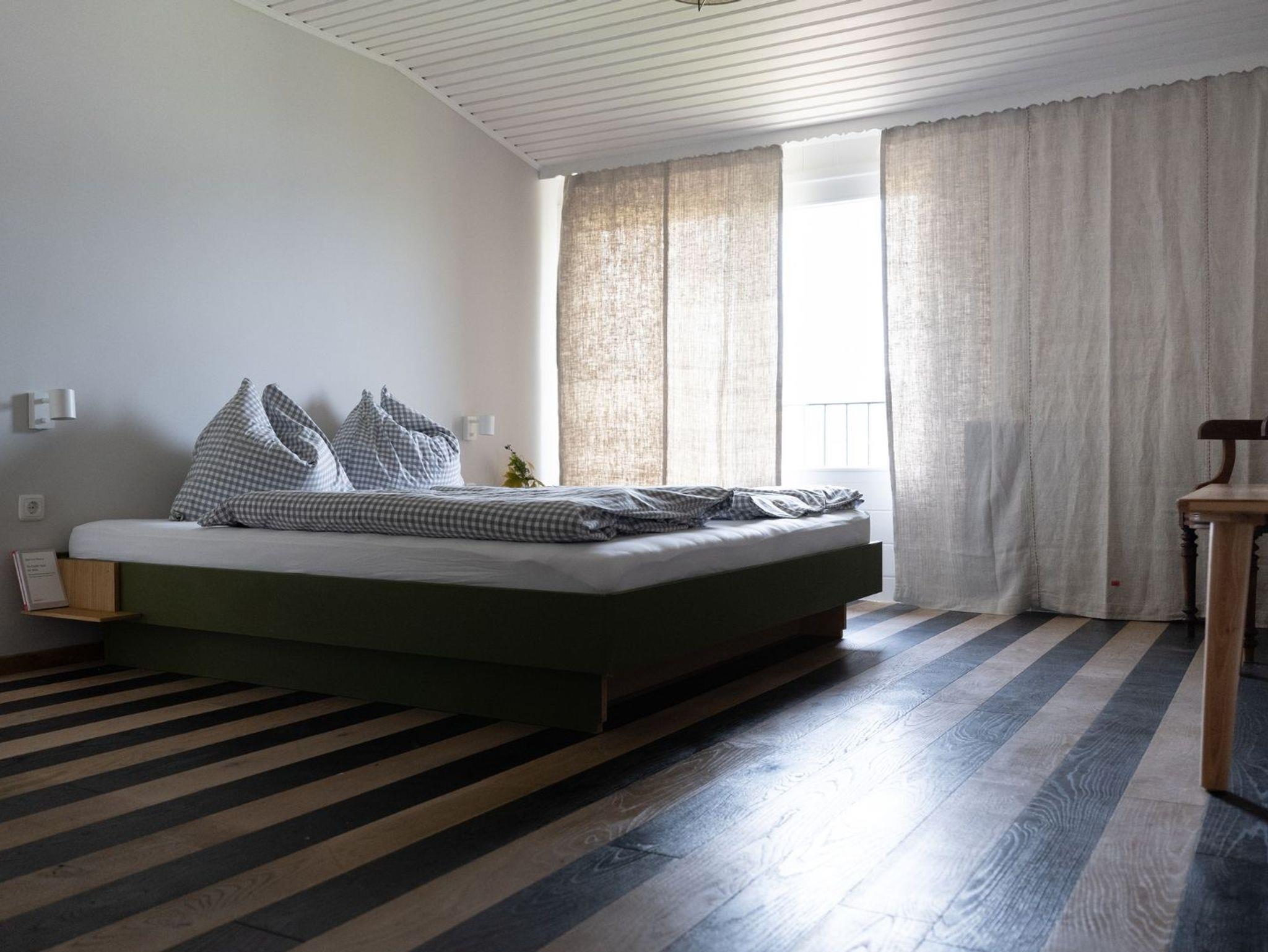 Elf neue, modern ausgestattete Ferienwohnungen, große Wiese für die Gäste direkt vor dem Haus, Frühstücksraum mit Produkten der Bauern aus der Umgebung, ausgewählte Bibliothek.