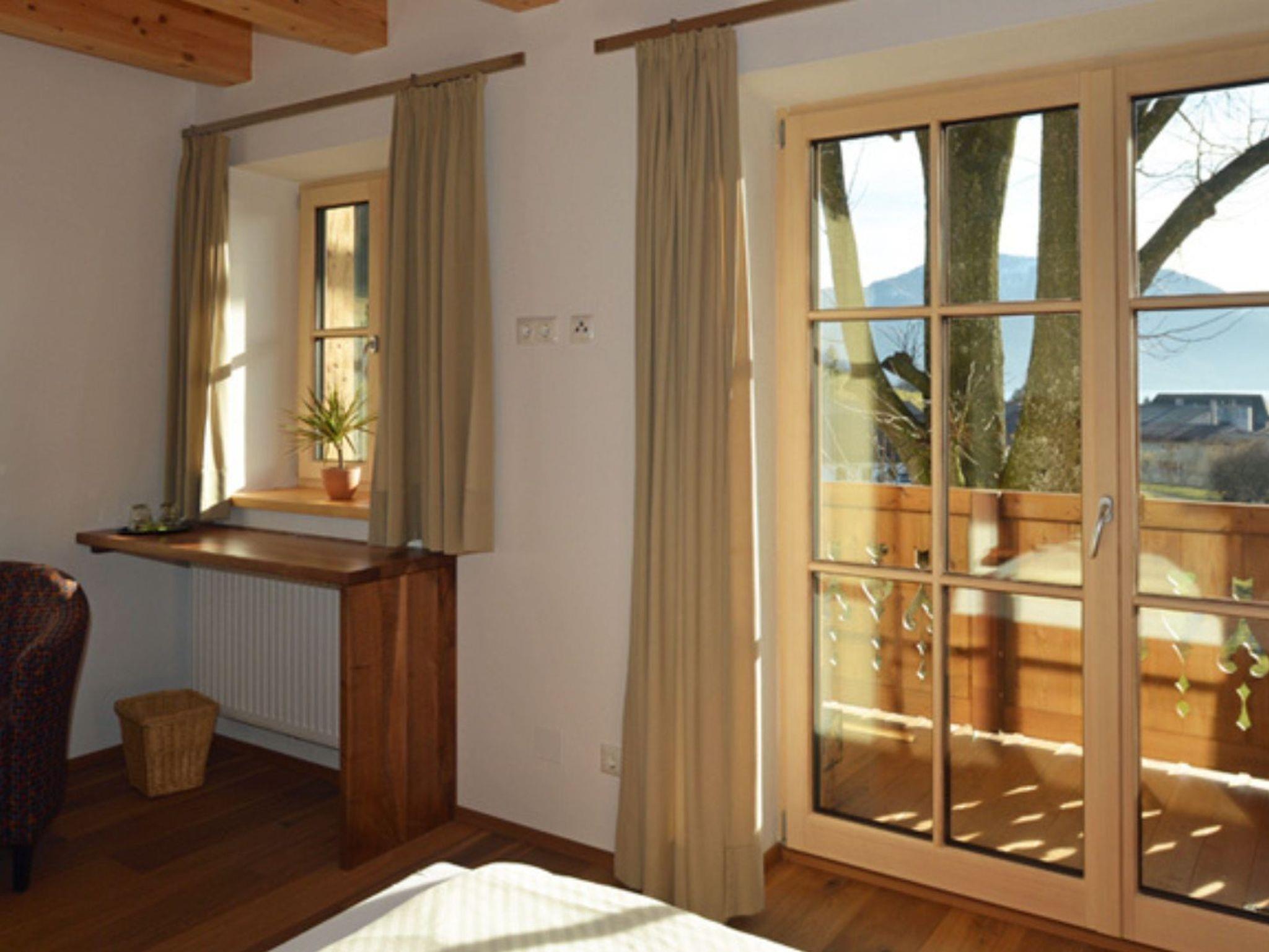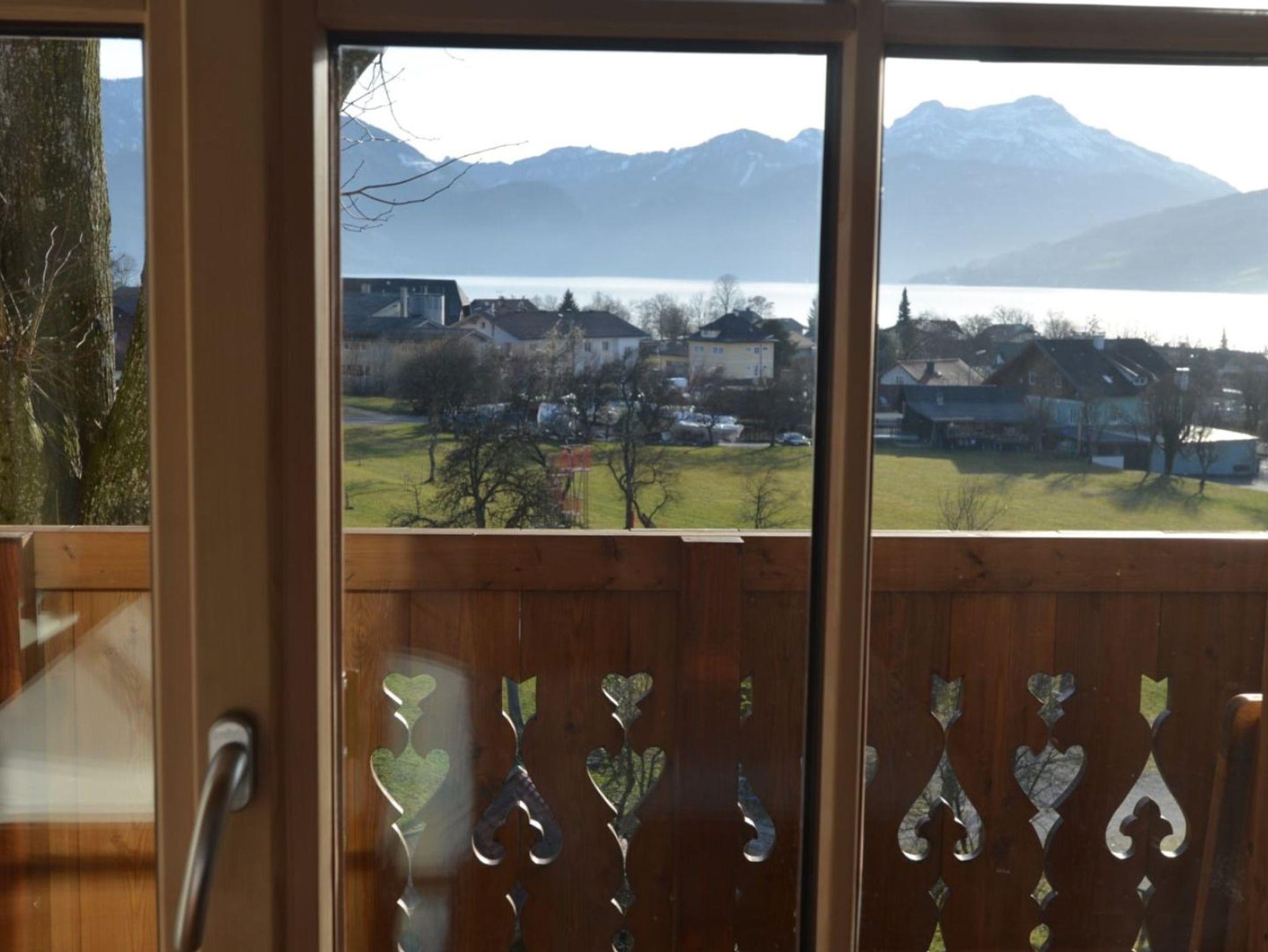 Unser Doppelzimmer BIRNE ist mit Möbeln aus Birnenholz ausgestattet. Vom großen Balkon hat man einen herrlichen Blick auf den Attersee und das Gebirge.
