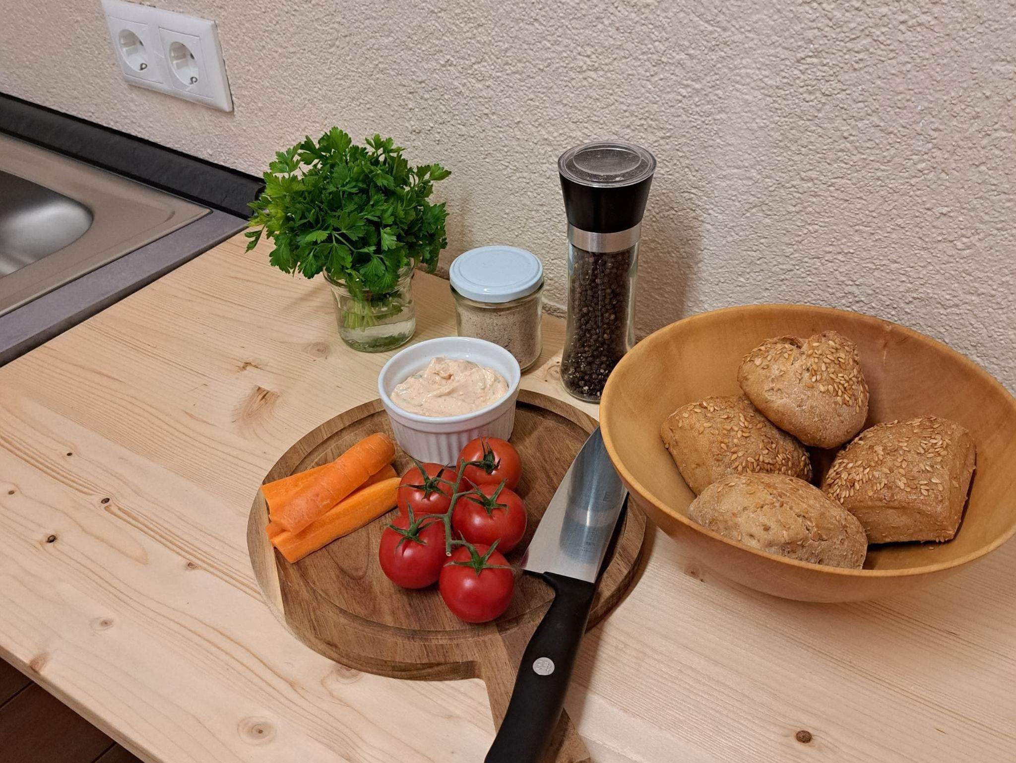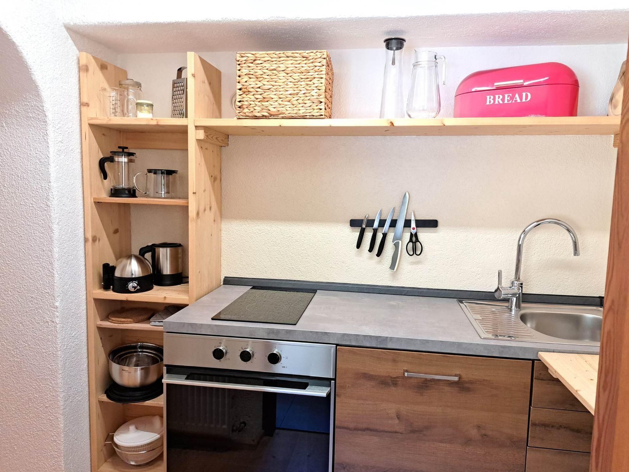 Die Küche liegt seitlich des Wohnbereichs hinter dem Torbogen und ist voll ausgestattet mit Spülmaschine, Backofen und 2 Zerankochplatten und allem, was man zum Kochen braucht.