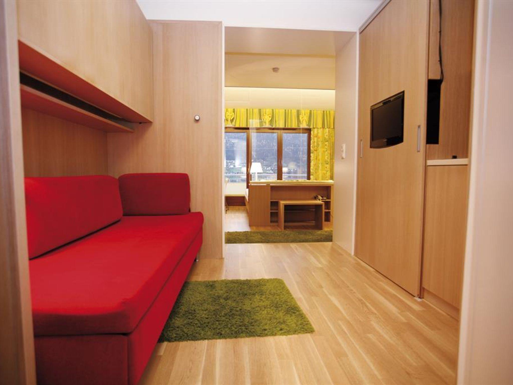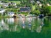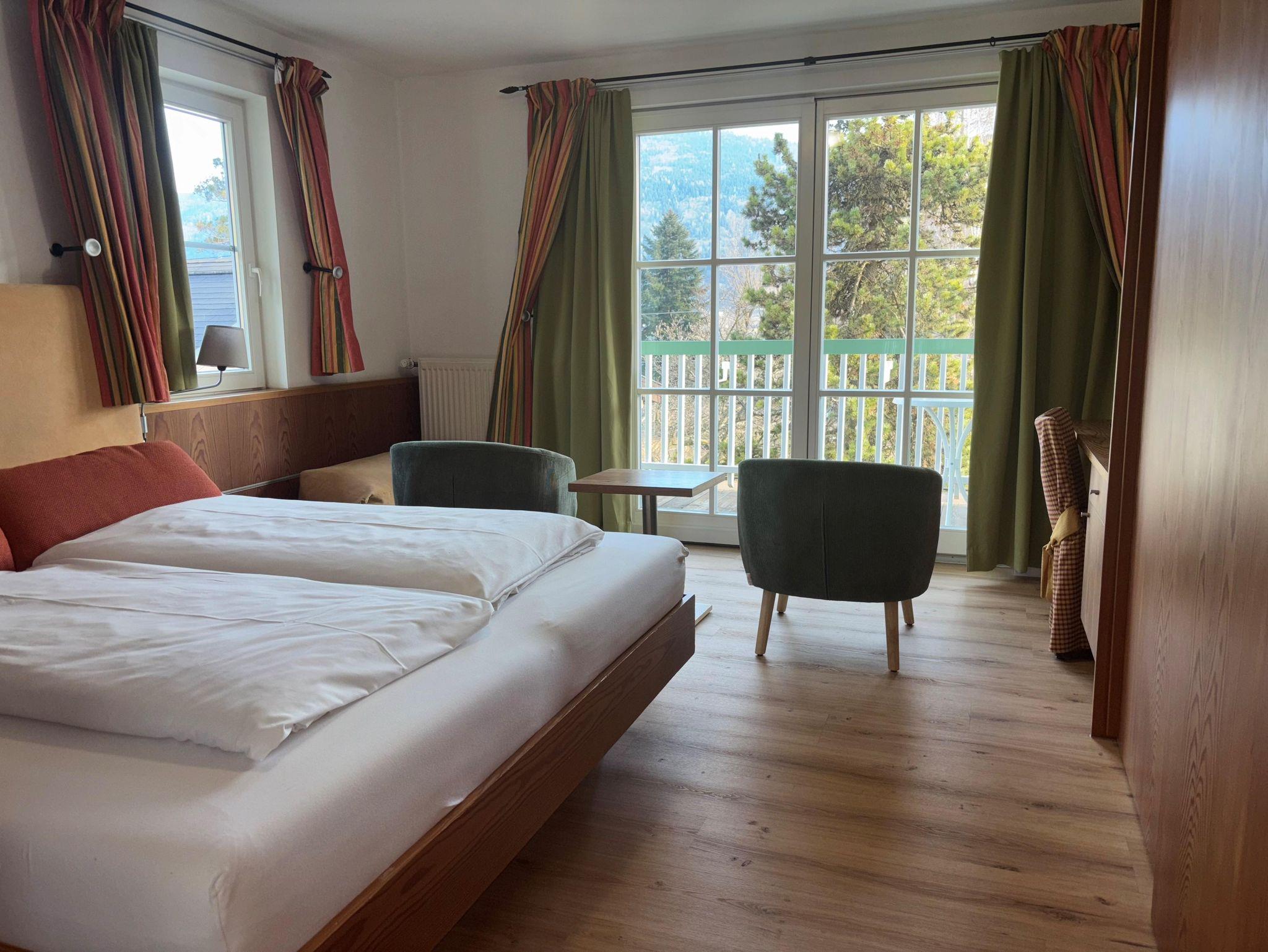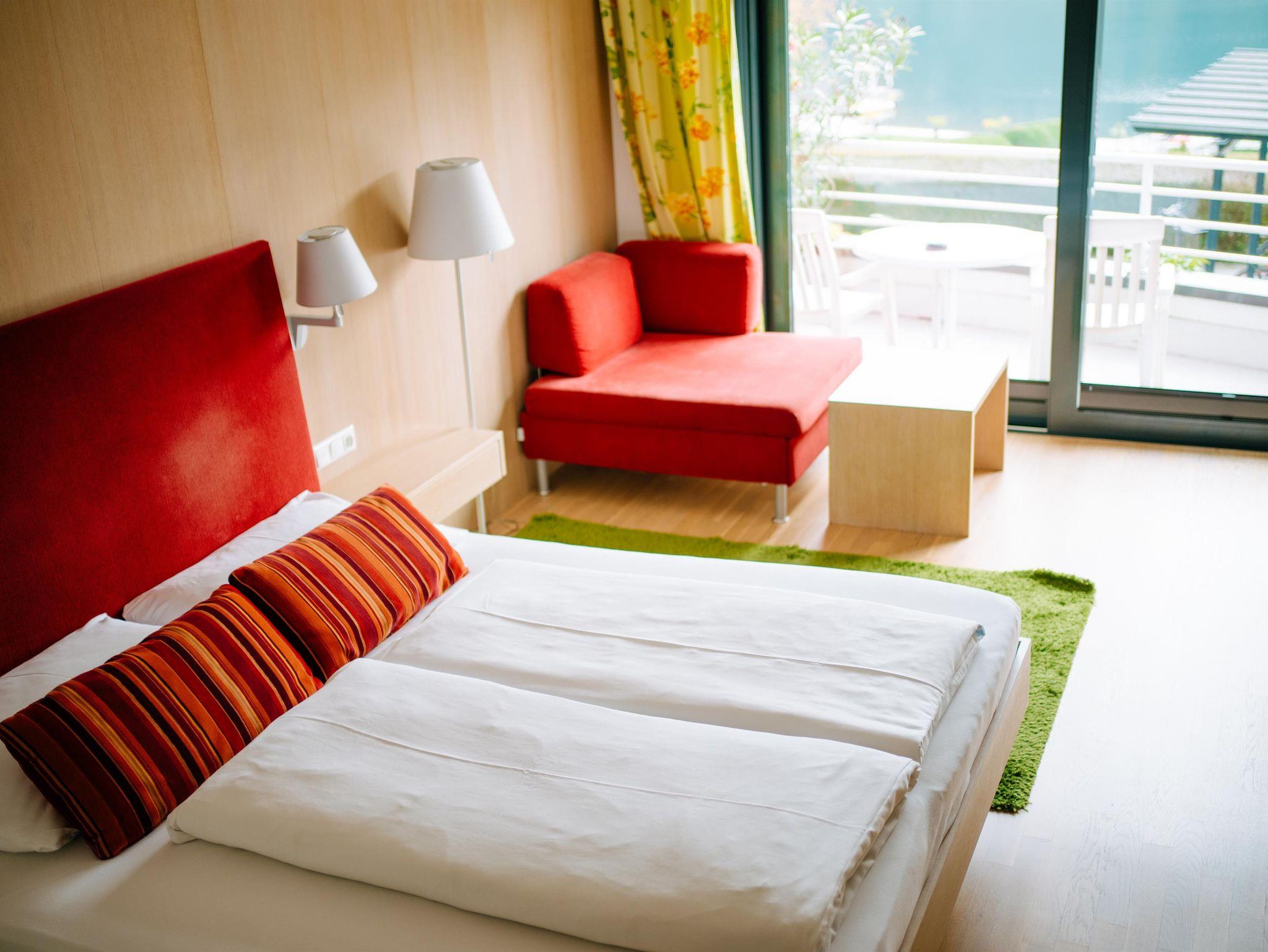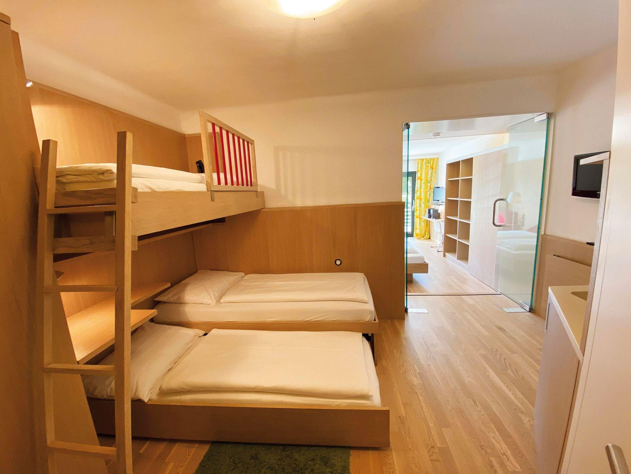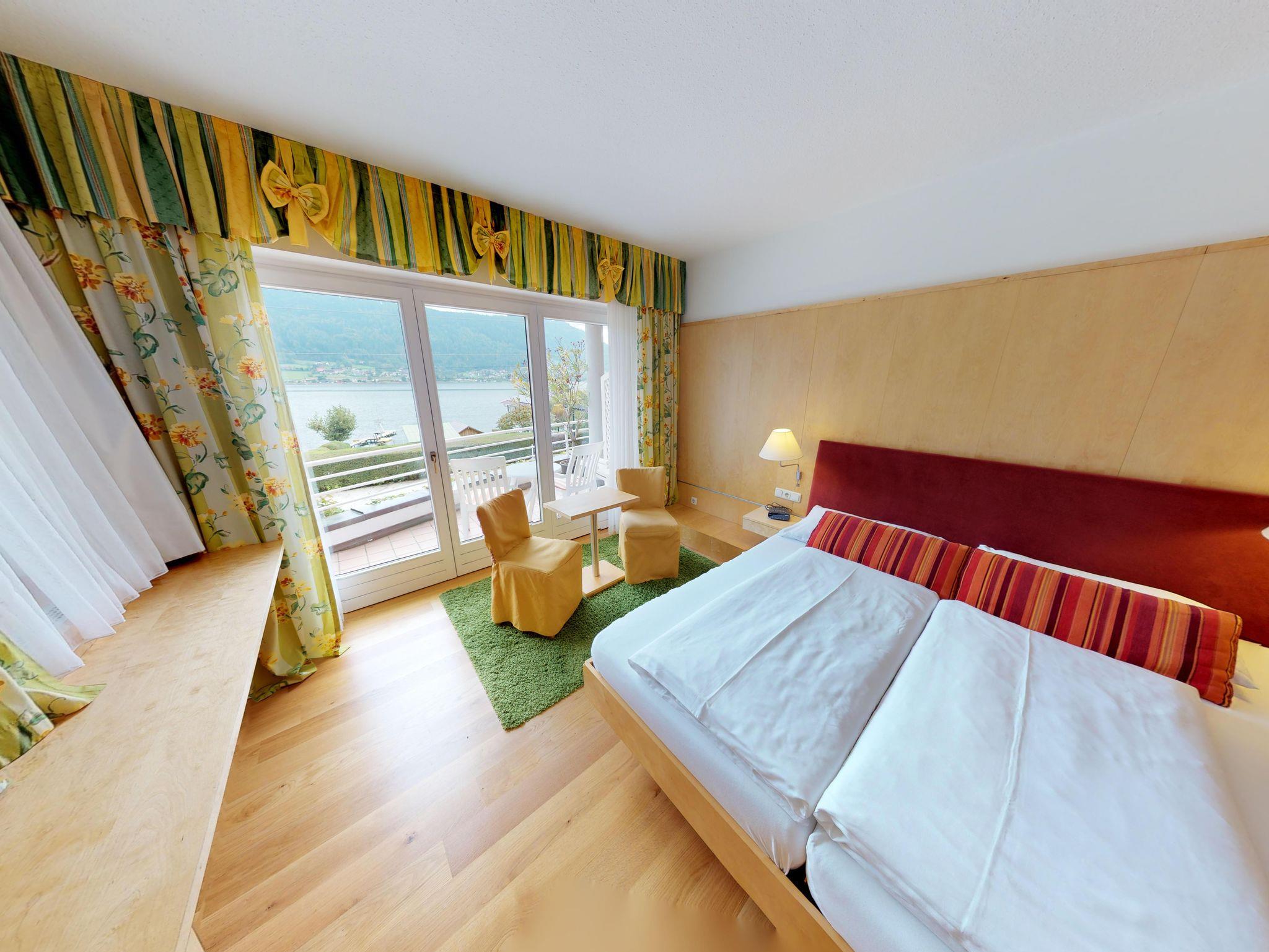Familienzimmer mit Balkon oder Terrasse und Seeblick im Haupthaus, Landhaus oder Haus am See, seeseitiges Elternzimmer und getrenntes Kinderzimmer, teilweise Hochbetten, Bad oder DU/WC, Föhn, Sat-TV, gratis W-Lan