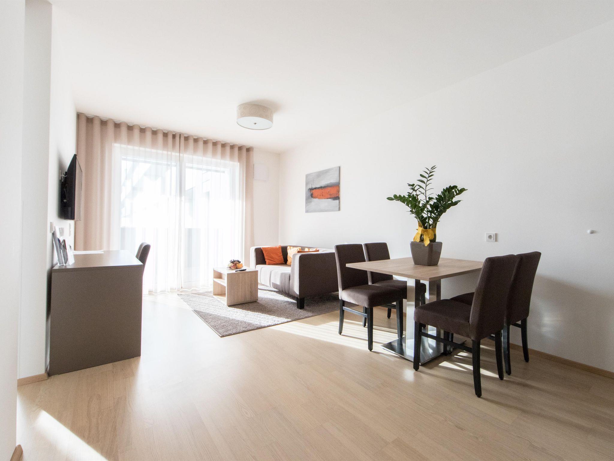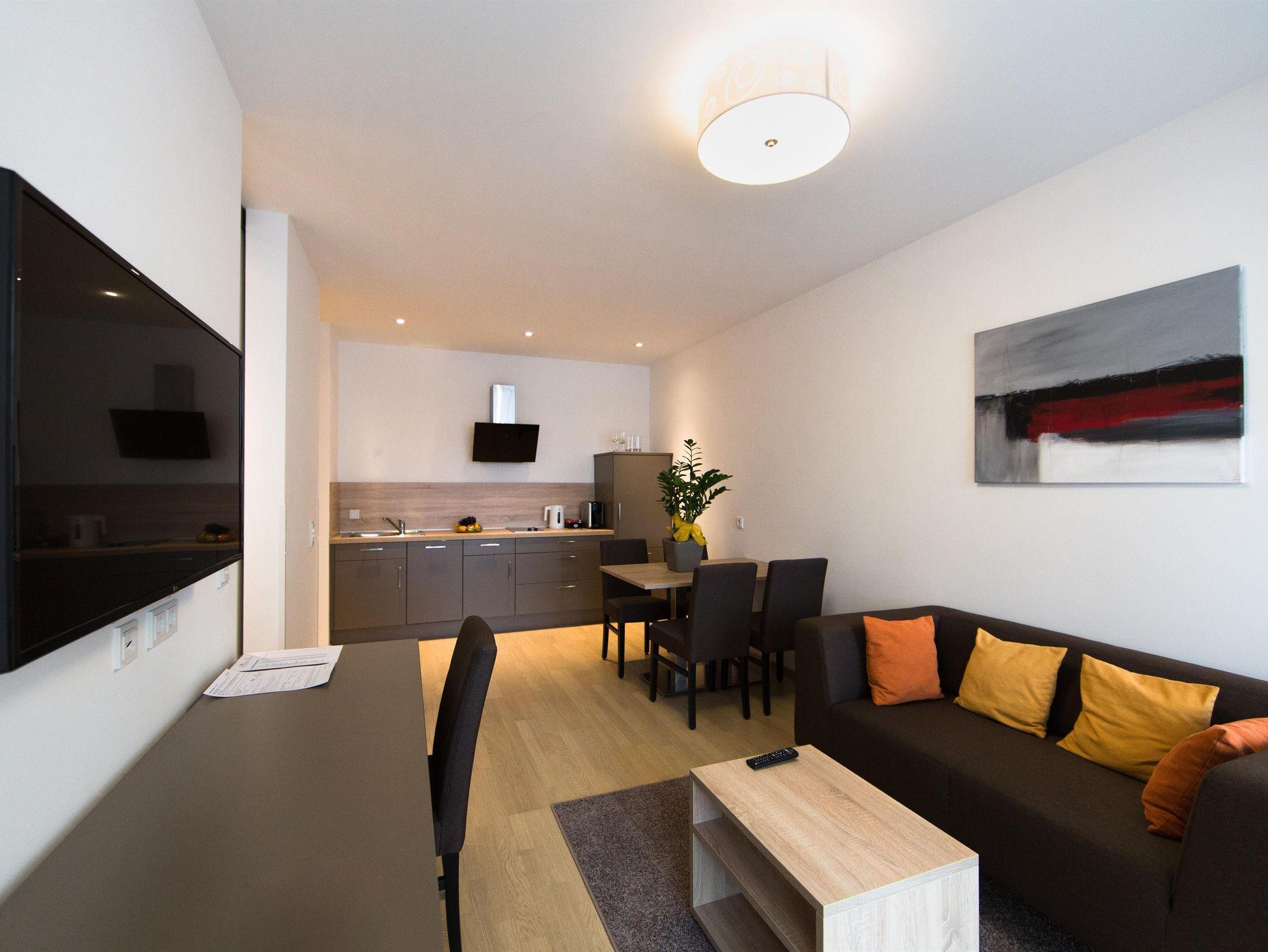Vorraum, Küchenblock mit Kühlschrank, Wohnbereich mit Esstisch, Sofa, abgetrennter Schlafbereich, abgetrenntes WC, Wohnraumlüftung, Schreibtisch, Flat TV mit Kabel Premium TV und SKY Sport, Internet, kostenloses Highspeed WLAN, Safe, Haarfön/Kosmetikspiegel