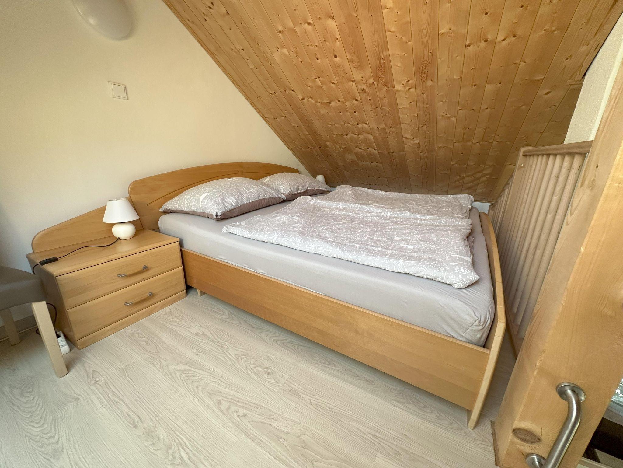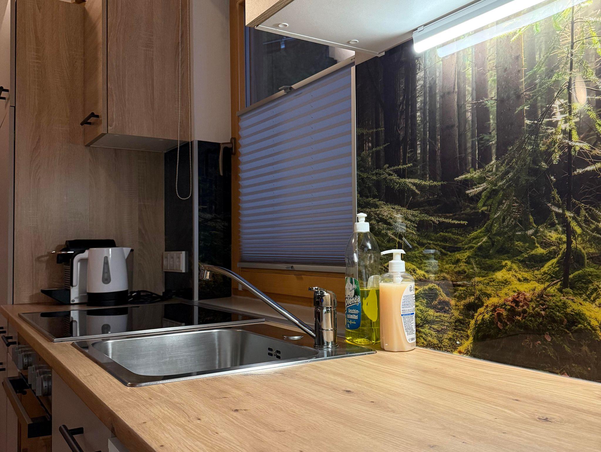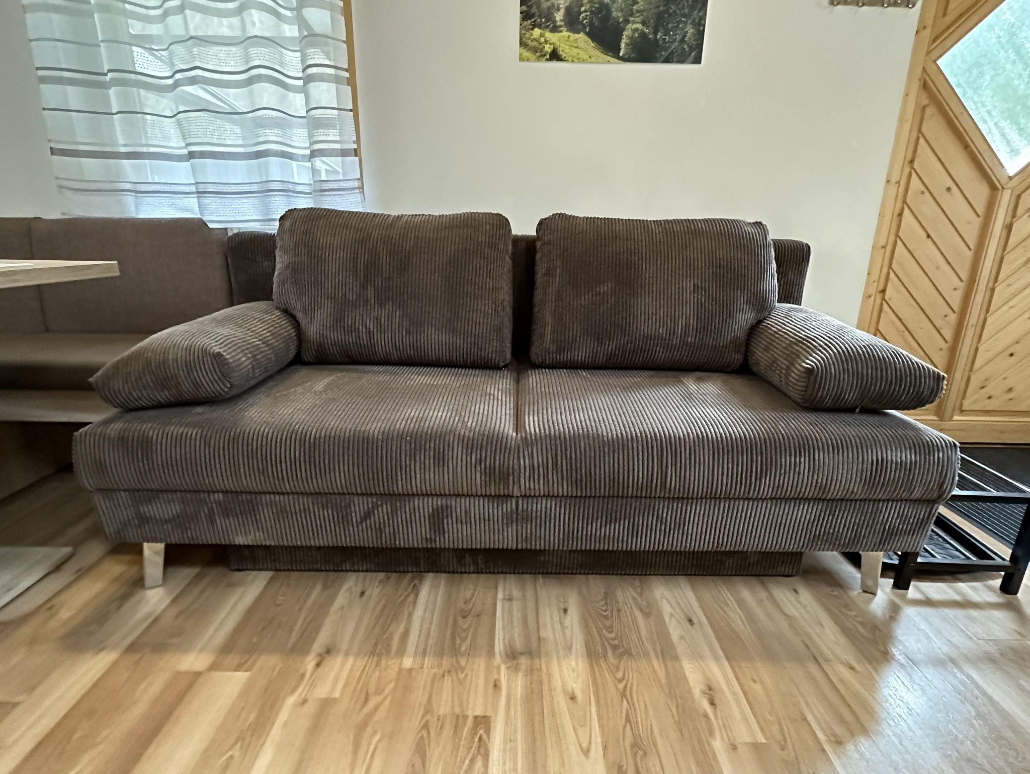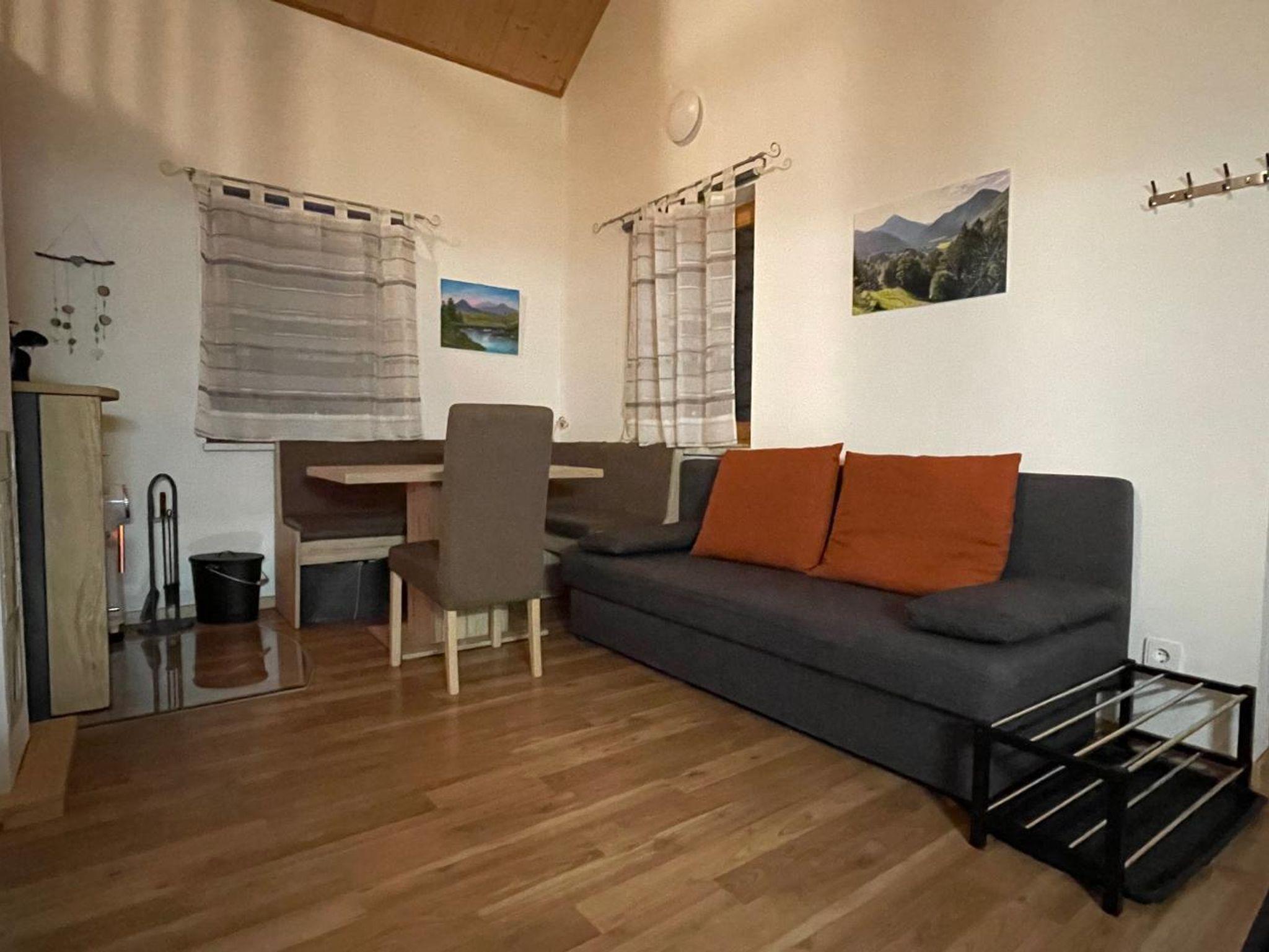 Der Wohnbereich umfasst eine vollausgestattete Küchenzeile (Külschrank mit Gefrierfach, Ceranfeld, Backrohr, Geschirrspüler, Nespressomaschine, Wasserkocher, Toaster), Eckbank, Ausziehbares Sofa und Kaminofen. Das Schlafimmer ist mit einem ausziehbaren Doppelbett (200 x 180 cm) und einem kleinen Schrank ausgestattet. Das kleine Badezimmer ist zweckmäßig eingerichtet mit einer Dusche, WC, Waschbecken und einem Handtuchtrockner ausgestattet.