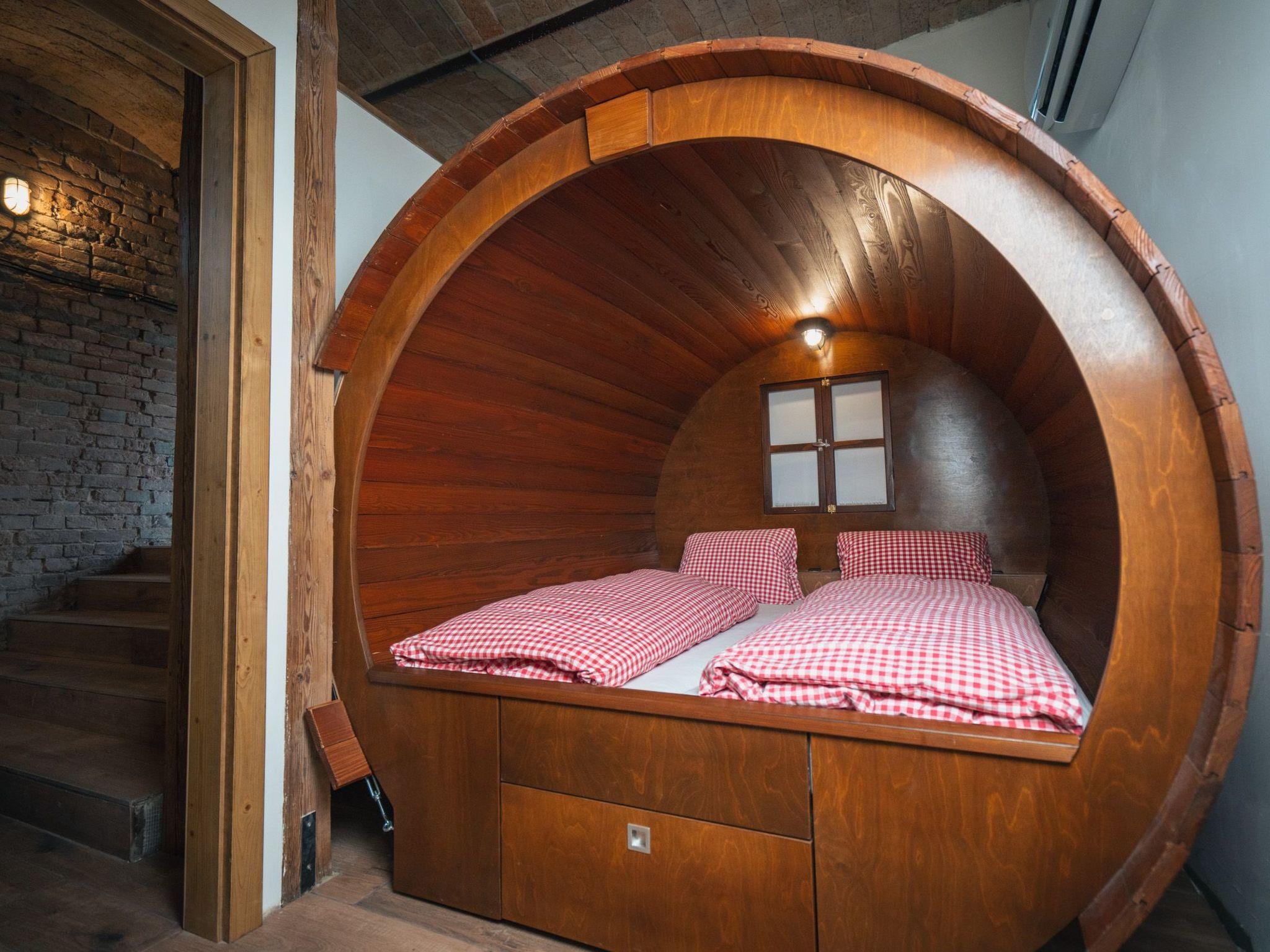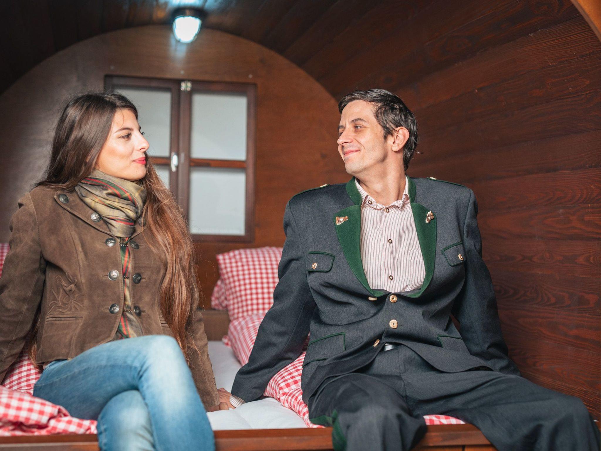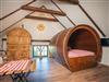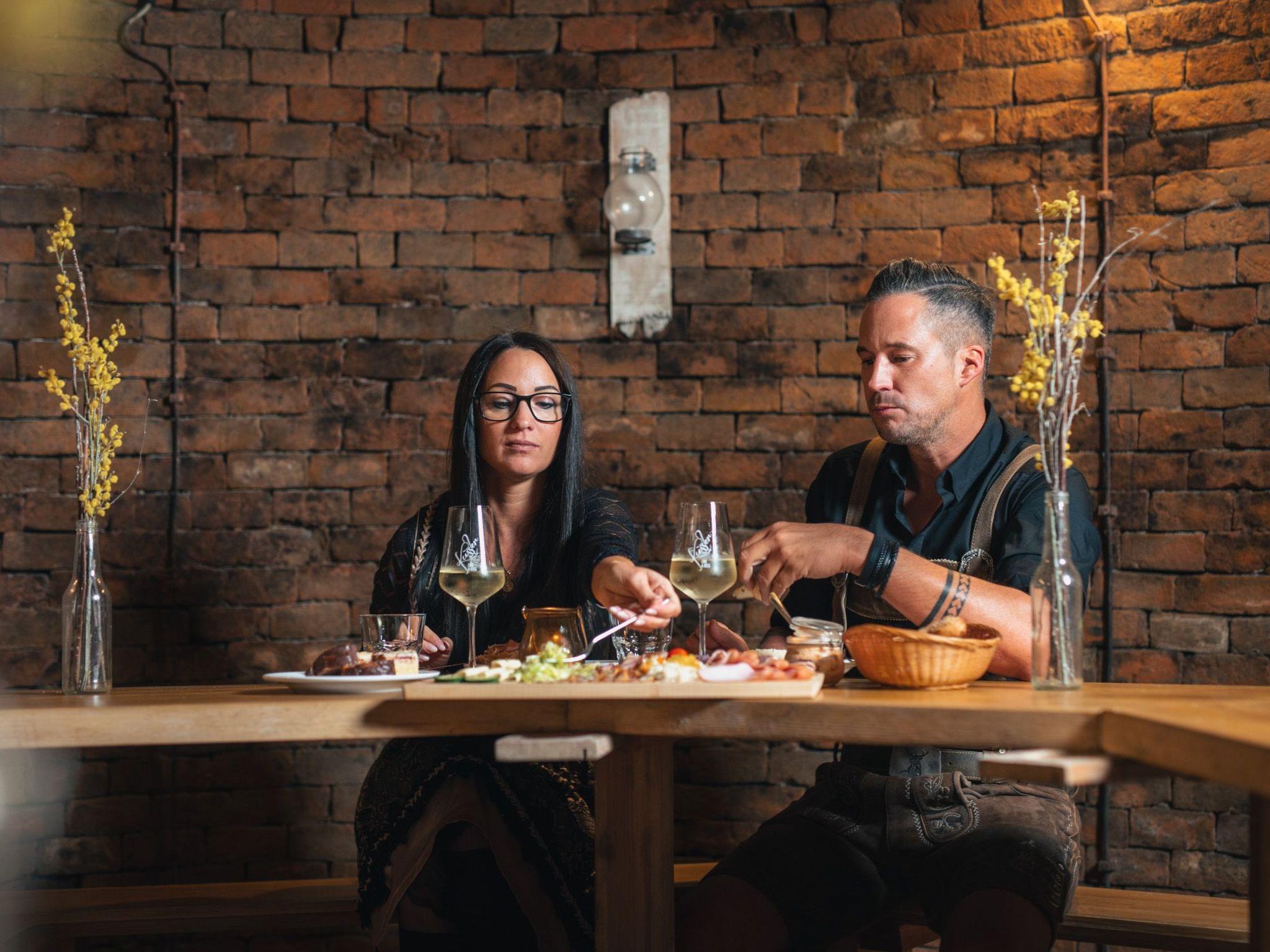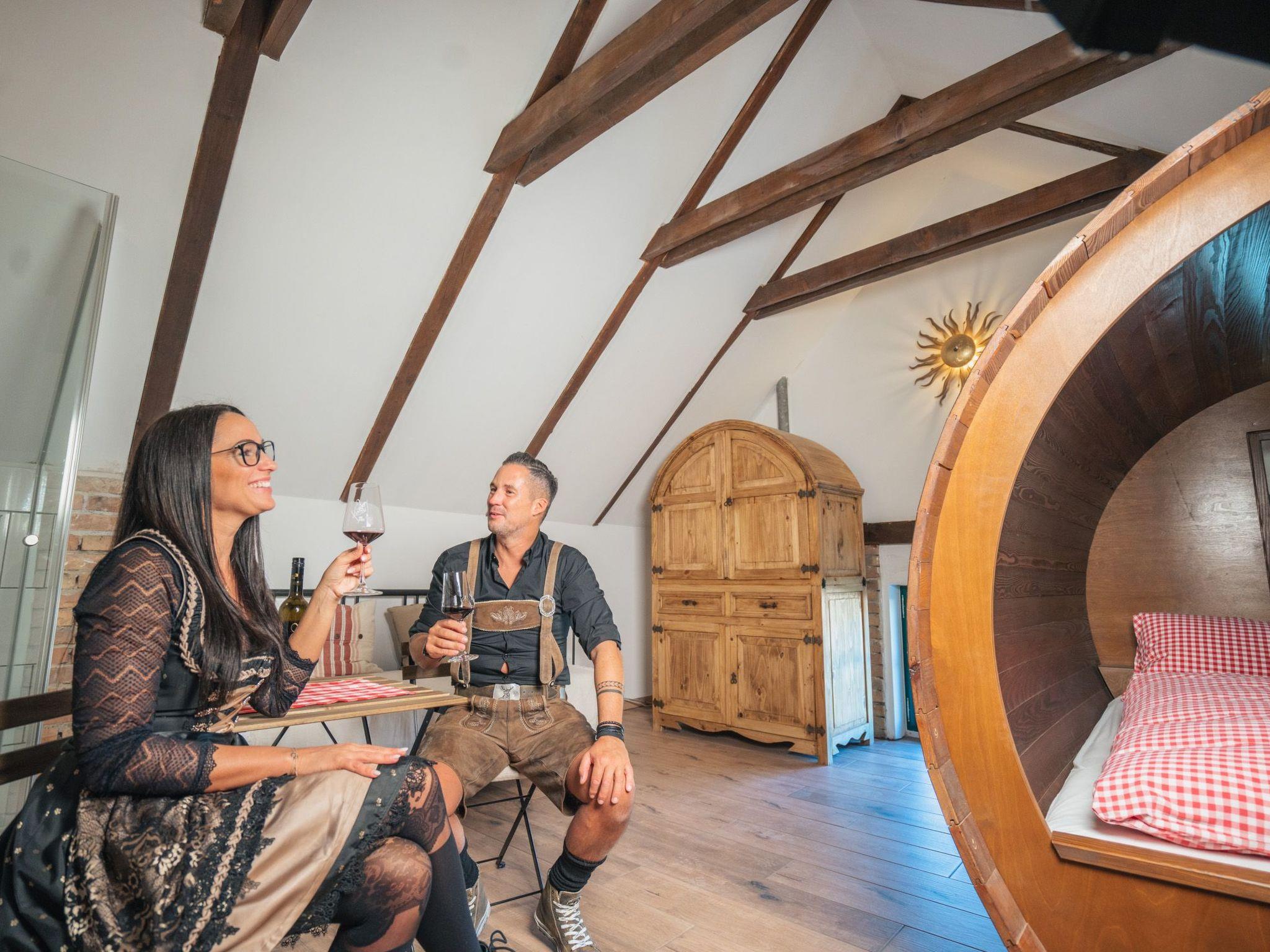 A former press house has been stylishly converted into a unique wine barrel chalet on three levels and is ideal for up to eight people. On the top floor there is a wine barrel suite for two people with two extra beds, with every comfort such as shower, WC, WiFi, TV and much more. There is also a cosy Weinviertler Stubn with direct access to the terrace. The attic is connected to the ground floor by a stylish iron staircase. On the ground floor there are two further wine barrel suites, each with a comfortable shower, WC, WiFi and TV. There is also seating directly in the former press house. The chalet also has its own 70 square metre wine cellar with its own seating area and a feel-good zone for toasting. The wine shelves contain a wide range of exquisite Küssler wines. Outside, there is a spacious terrace with seating that invites you to linger. The chalet is offered as a flat with breakfast and in combination with a guided tour of the Winzerhof, wine tasting in the 300-year-old cellar vault and the savouring of Heurigen delicacies and pastries.
