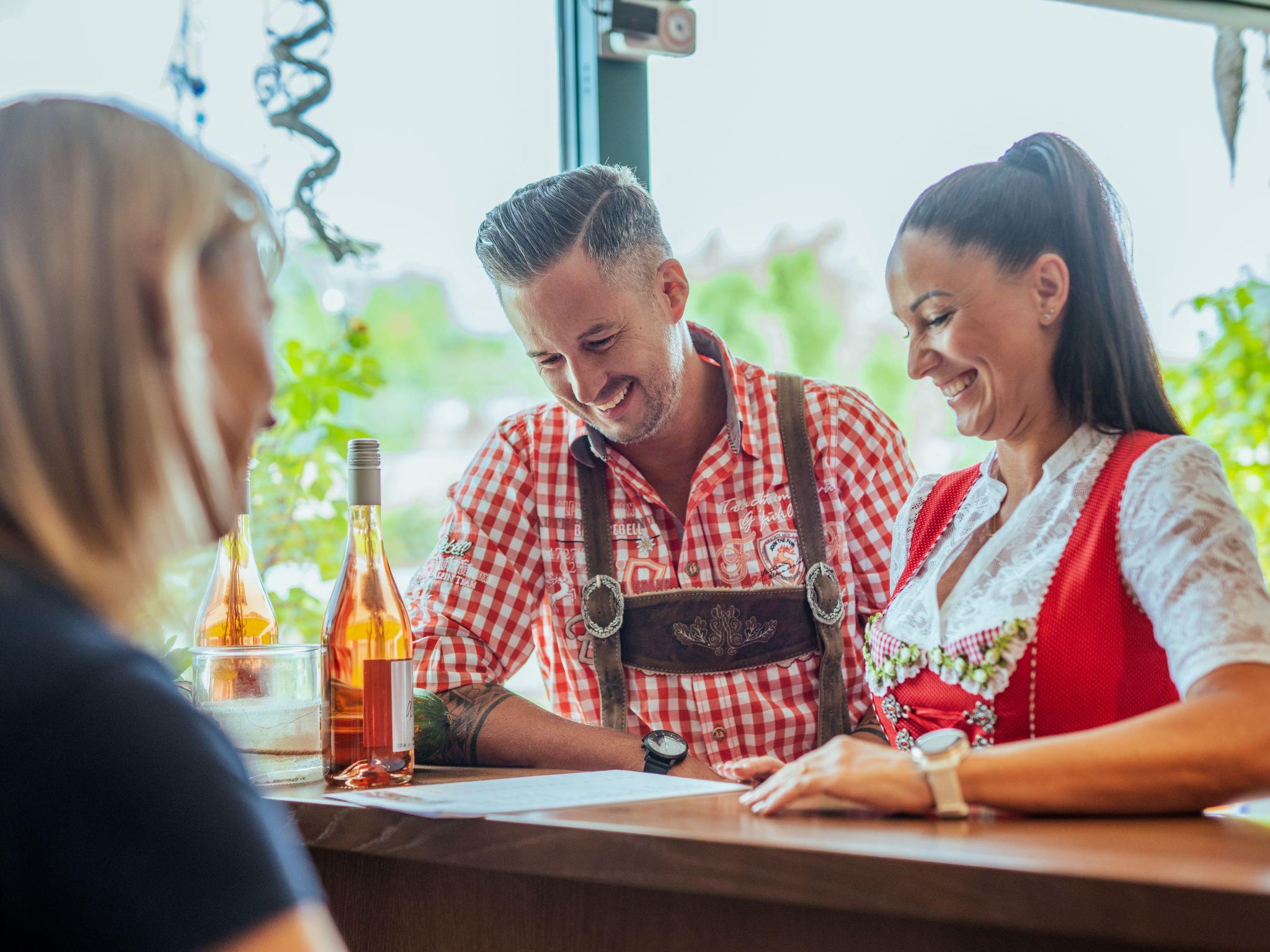 The former press house has been stylishly converted into a unique wine barrel chalet on three levels and is ideal for four people. On the top floor there is a wine barrel suite for two people with every comfort such as shower, WC, WiFi, TV and much more. On the ground floor there is another wine barrel suite, a comfortable shower in the former press area, a WC, a press as well as WiFi and TV. The chalet also has its own 70 square metre wine cellar with its own seating area and a feel-good zone for toasting. The wine shelves contain a wide range of exquisite Küssler wines. Outside, there is a secluded arbour that invites you to linger. The chalet is offered as a flat with breakfast and in combination with a guided tour of the Winzerhof, wine tasting in the 300-year-old cellar vault and the savouring of Heurigen delicacies and pastries.