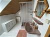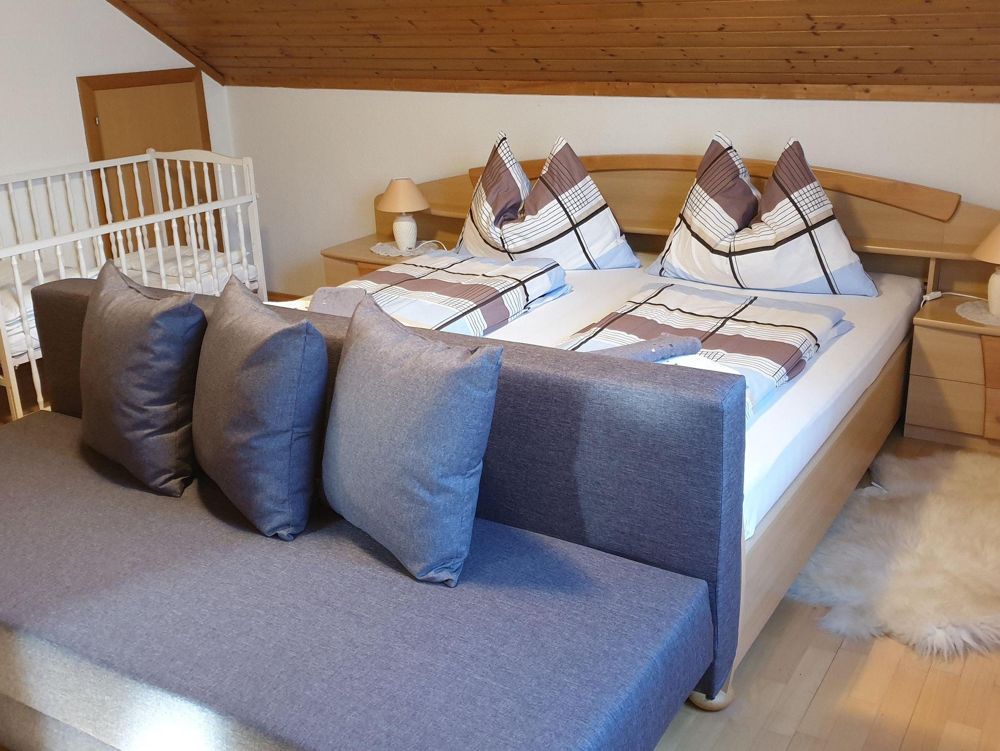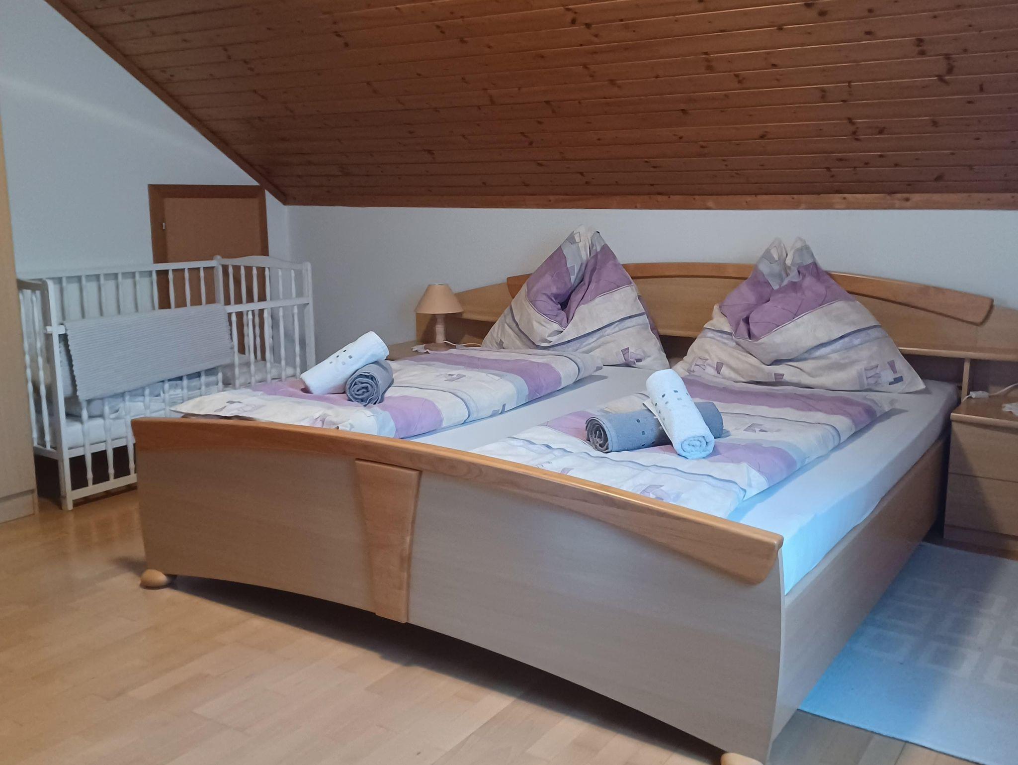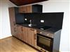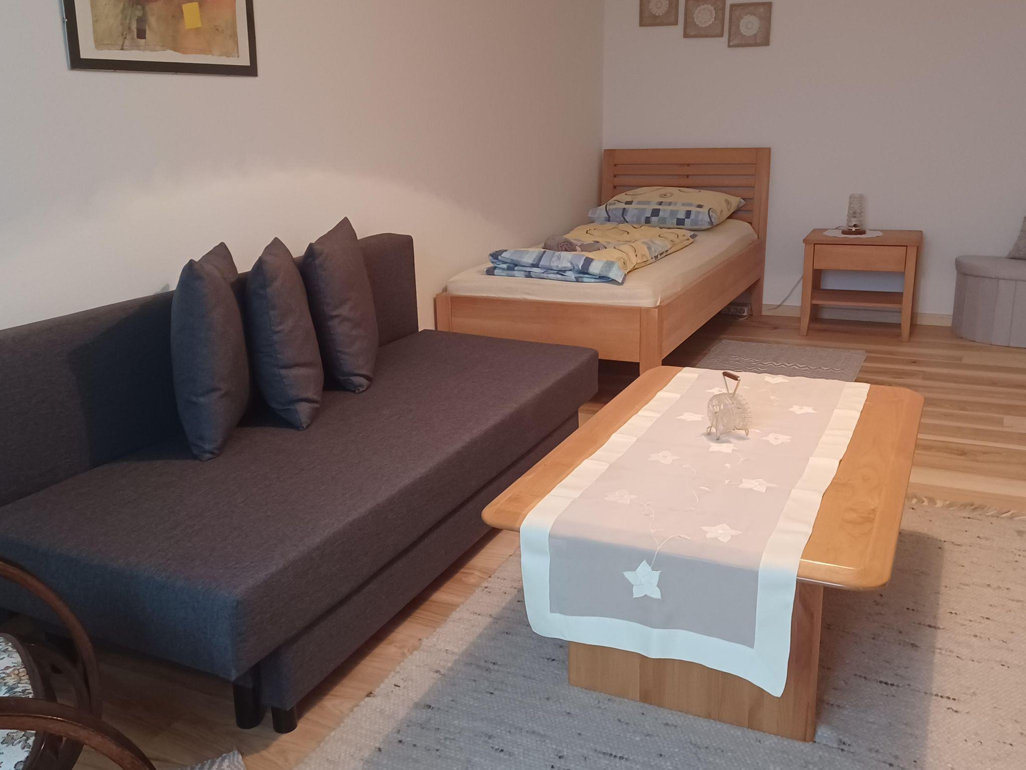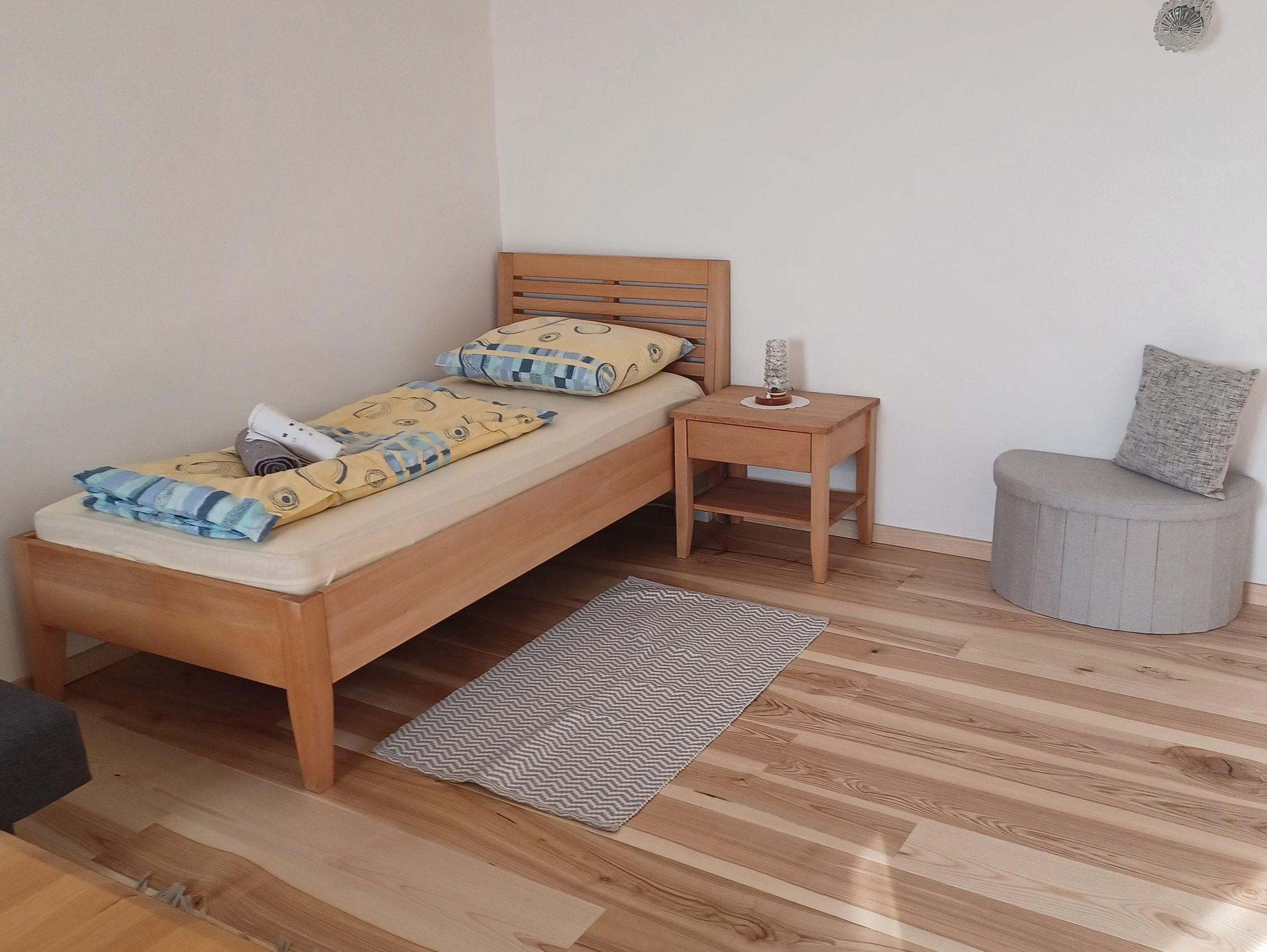 Das Appartement im OG verfügt über eine kleine Küche mit einem Essbereich, einem Schlafzimmer mit Doppelbett, einem Sanitärbereich mit Dusche und WC.