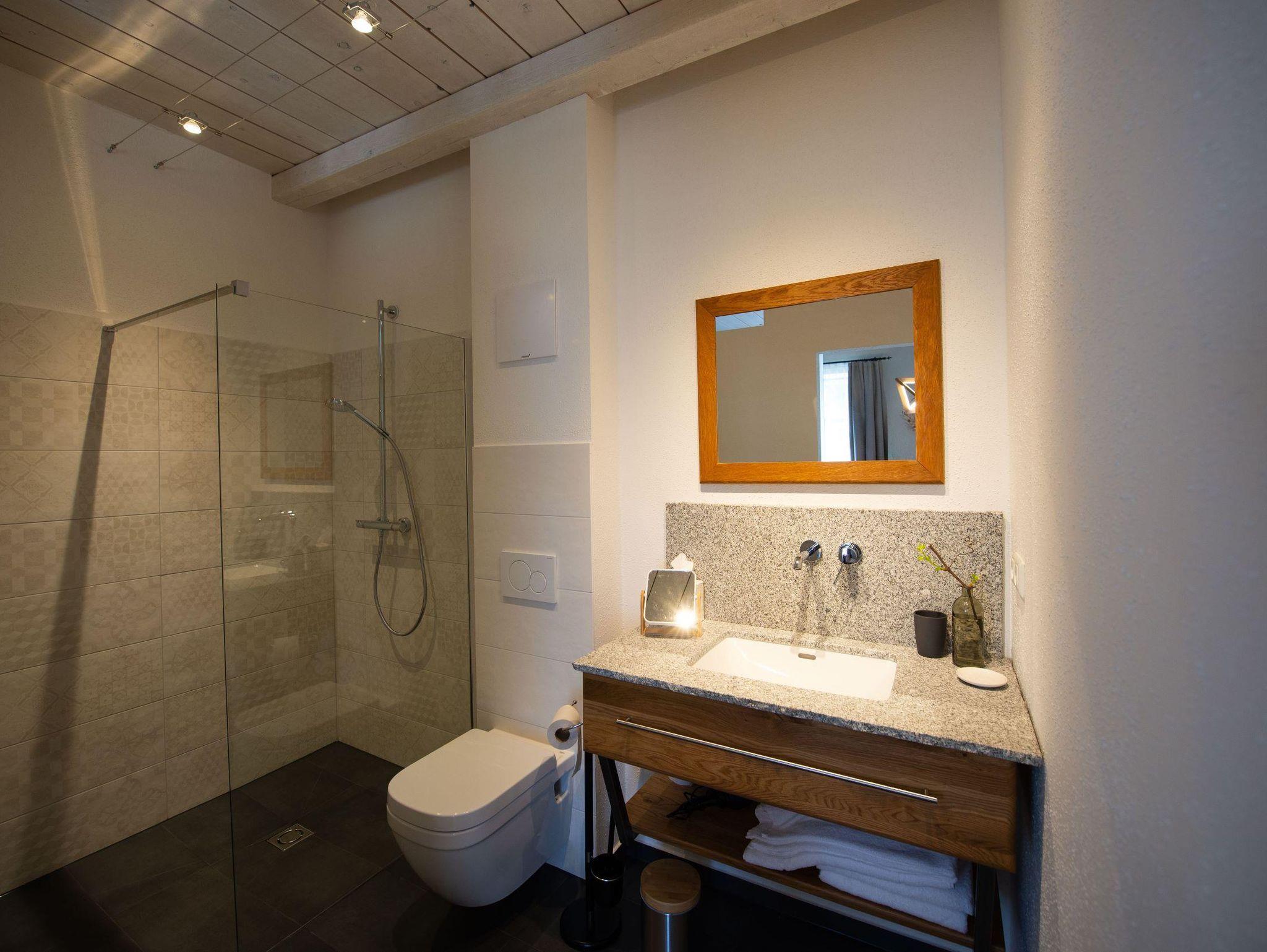 Das Naturzimmer Tief verwurzelt ist ein Doppelzimmer mit einem separaten Bad, das eine Dusche und eine Toilette umfasst. Die Betten sind aus hochwertigem Vollholz, speziell Eiche gefertigt, was eine natürliche und gemütliche Atmosphäre schafft. Der Boden besteht ebenfalls aus Eiche-Naturholz, was das ökologische Ambiente des Zimmers unterstreicht. Mit Lehmputz und anderen Naturmaterialien fördert das Zimmer eine gesunde Raumluft.