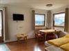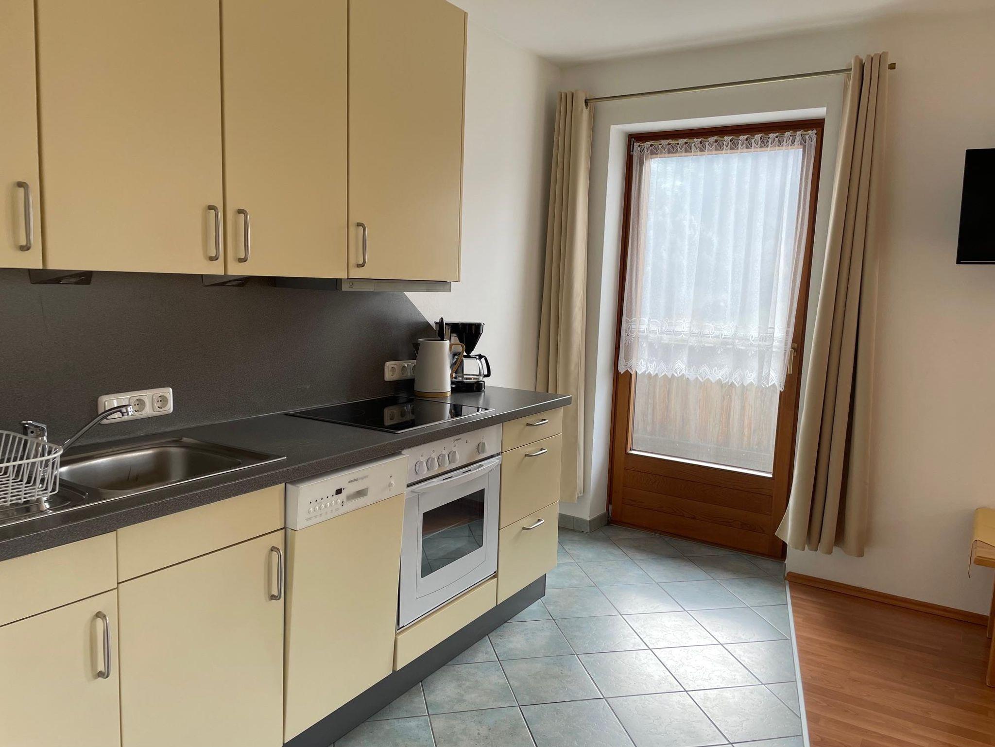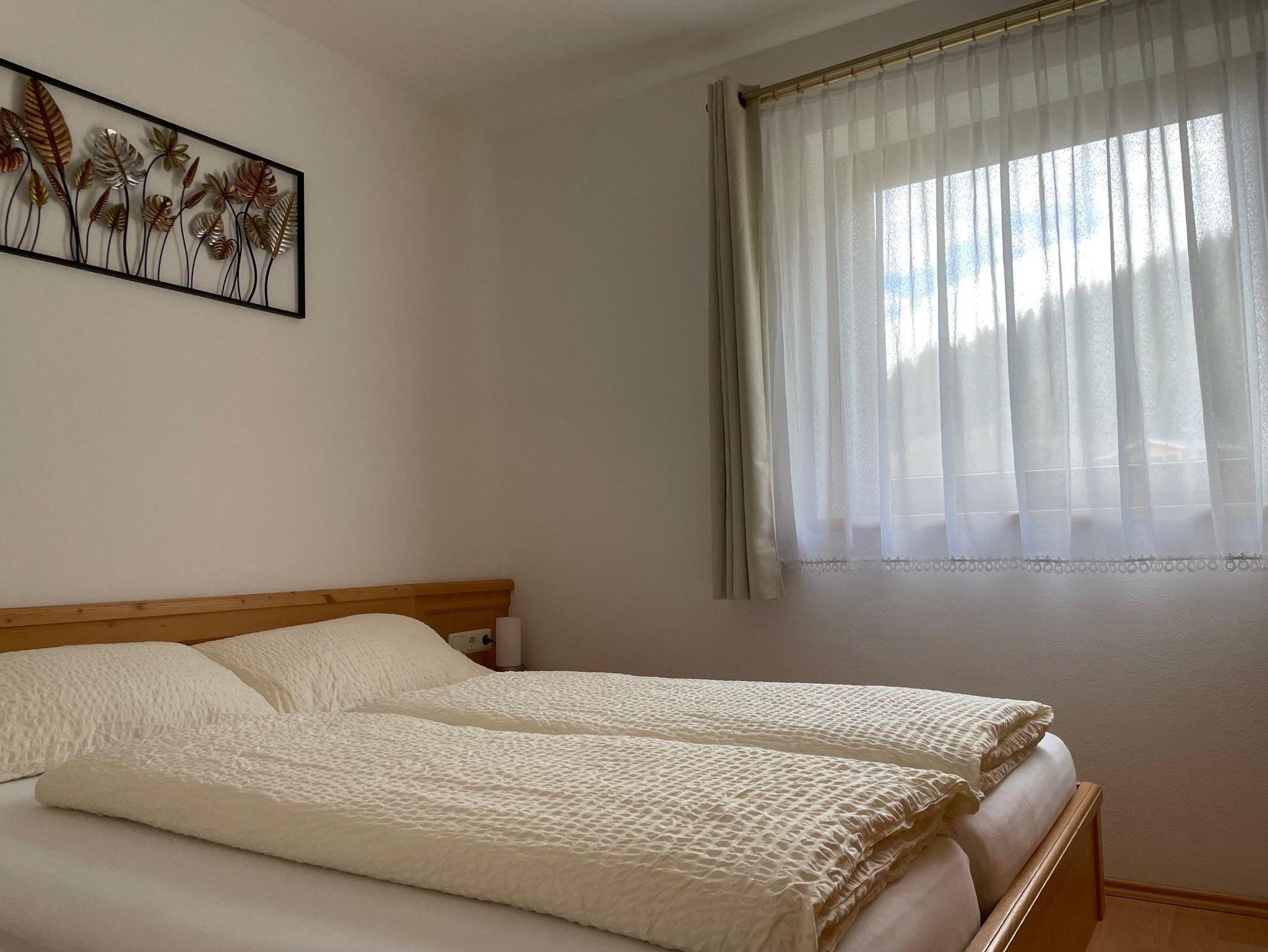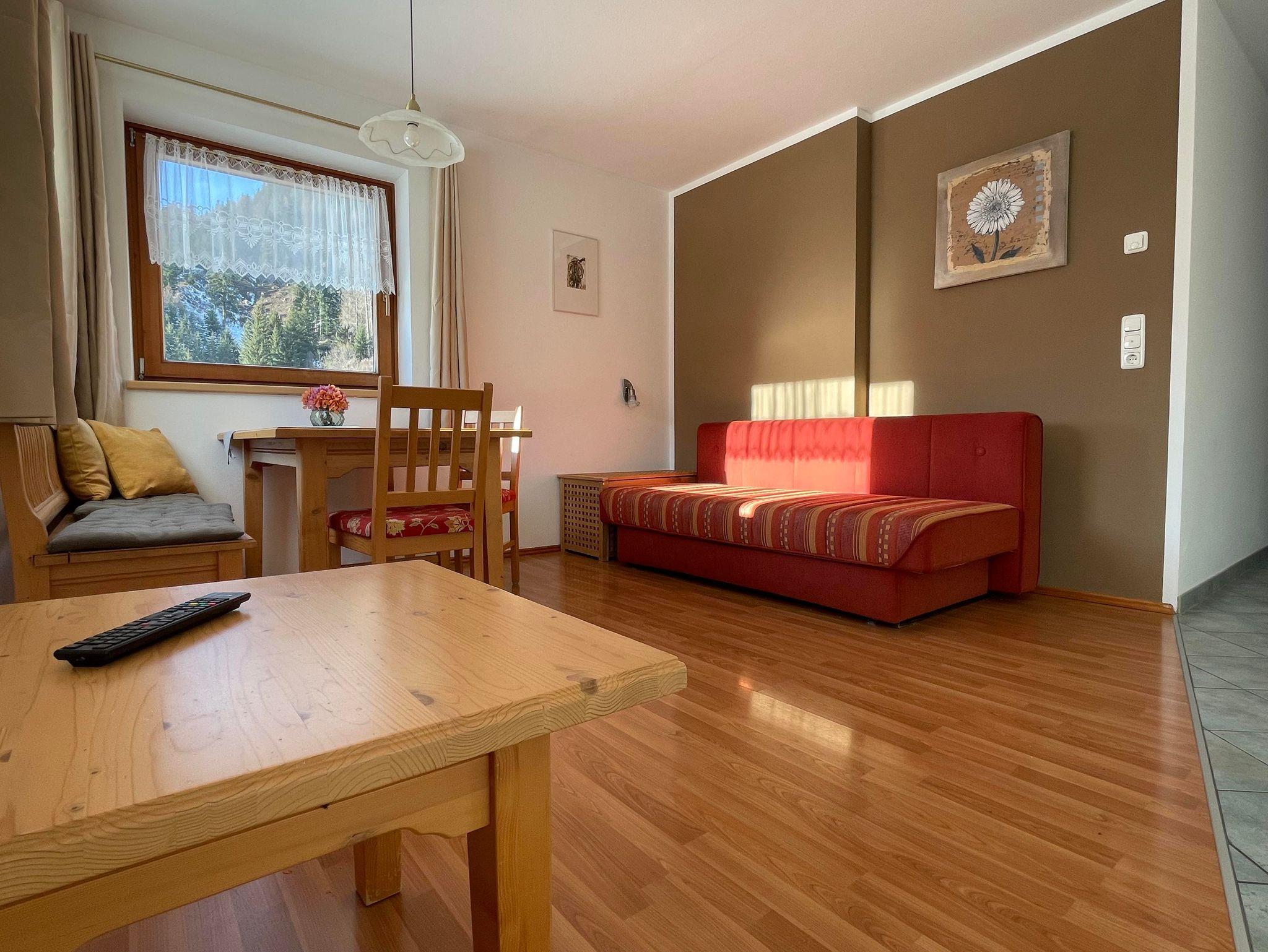Zwei-Raum Ferienwohnung auf 45 m², inkl. SAT-TV und gratis WLAN und komplett eingerichteter Wohn-Essküche inkl. Schlafcouch, Schlafzimmer mit Doppelbett, Bad mit Dusche und WC, süd-west ausgerichteter Balkon mit herrlichem Ausblick auf die Dolomiten