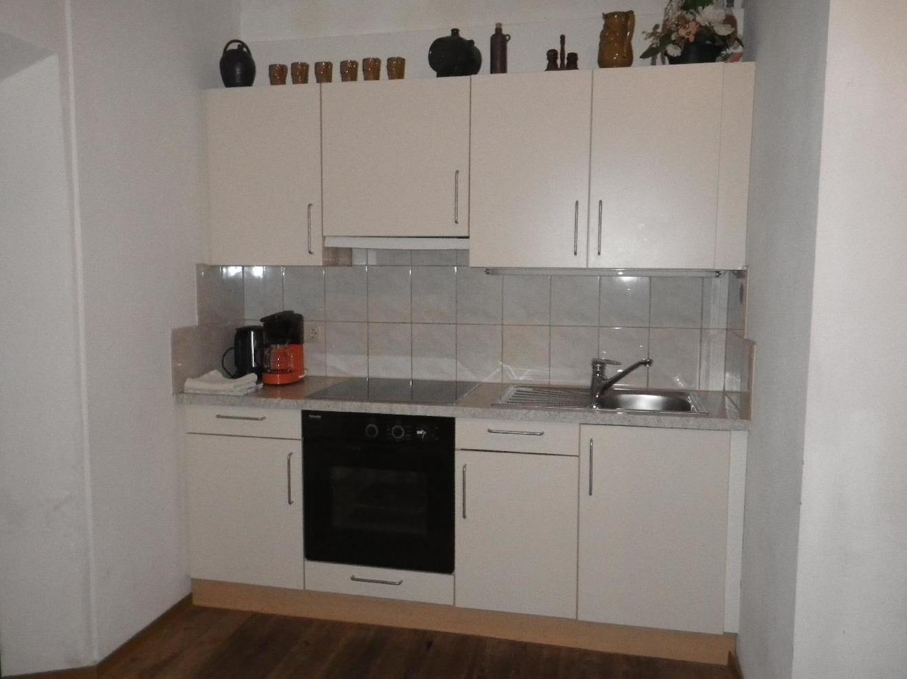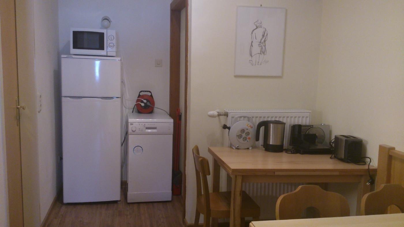 Die Küche ist komplett ausgestattet mit Geschirr, Elektroherd, Backrohr, Kaffeemaschine, Mixer, Toaster, Allesschneider, Kühlschrank kombiniert mit großem Gefrierfach, Geschirrspüler und Sitzecke für 4 Personen, mit Zusatztisch auch für 6 Personen möglich.