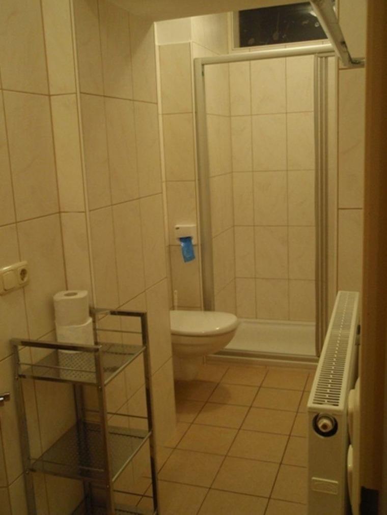 Ein großes Badezimmer mit Bodenheizung, Dusche, WC und Waschmaschine.