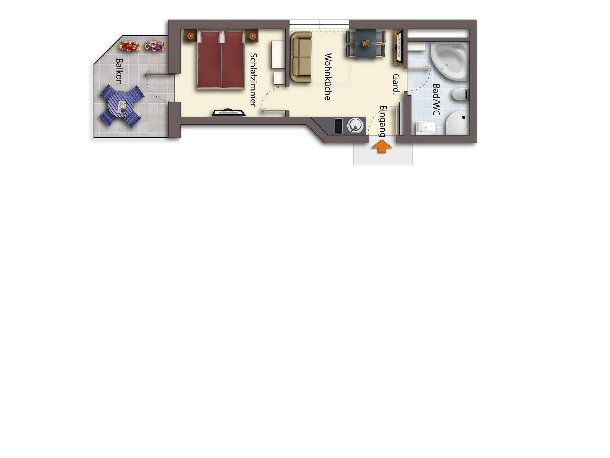 • 1 geräumiges Badezimmer mit Whirlpool, Dusche und WC.