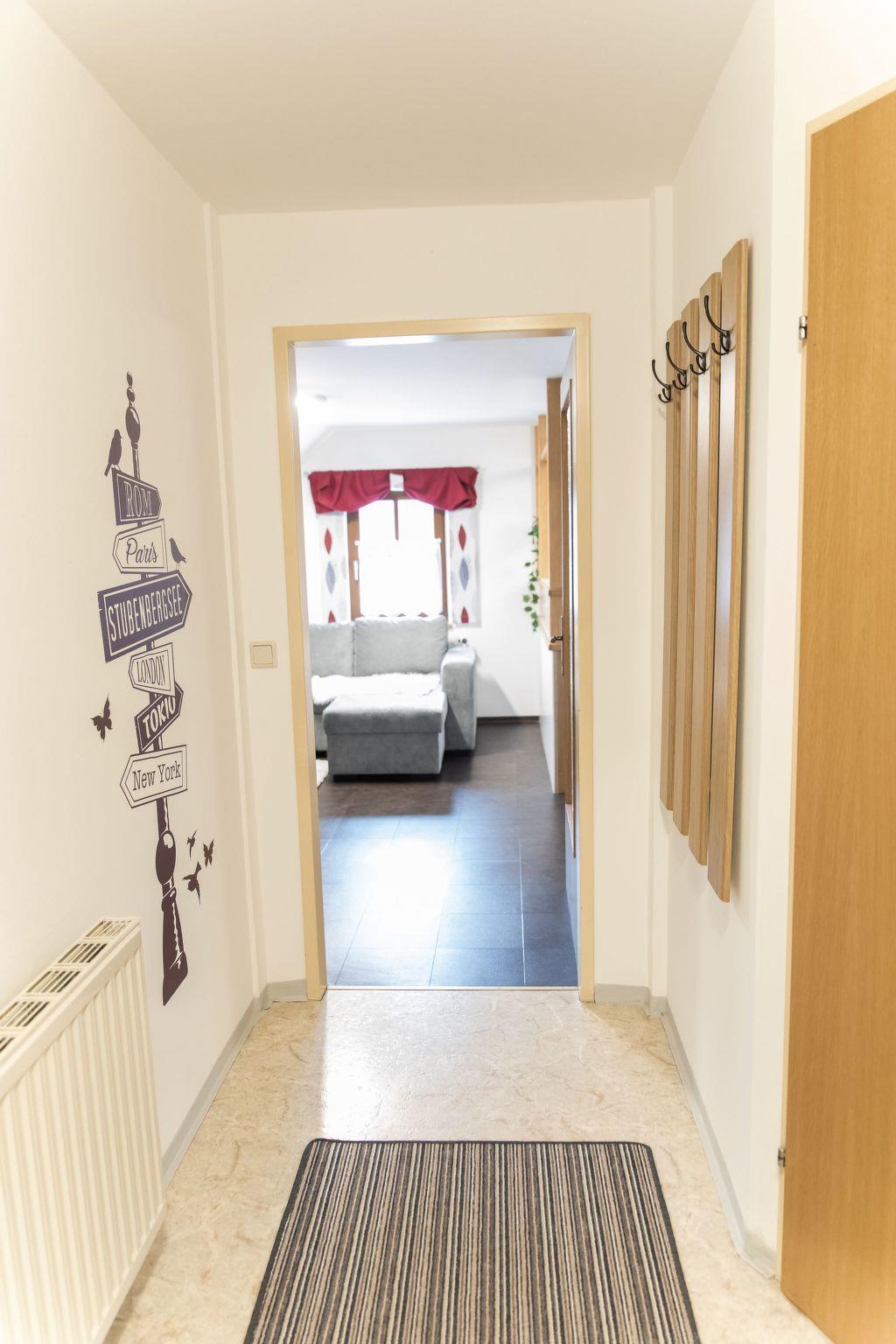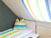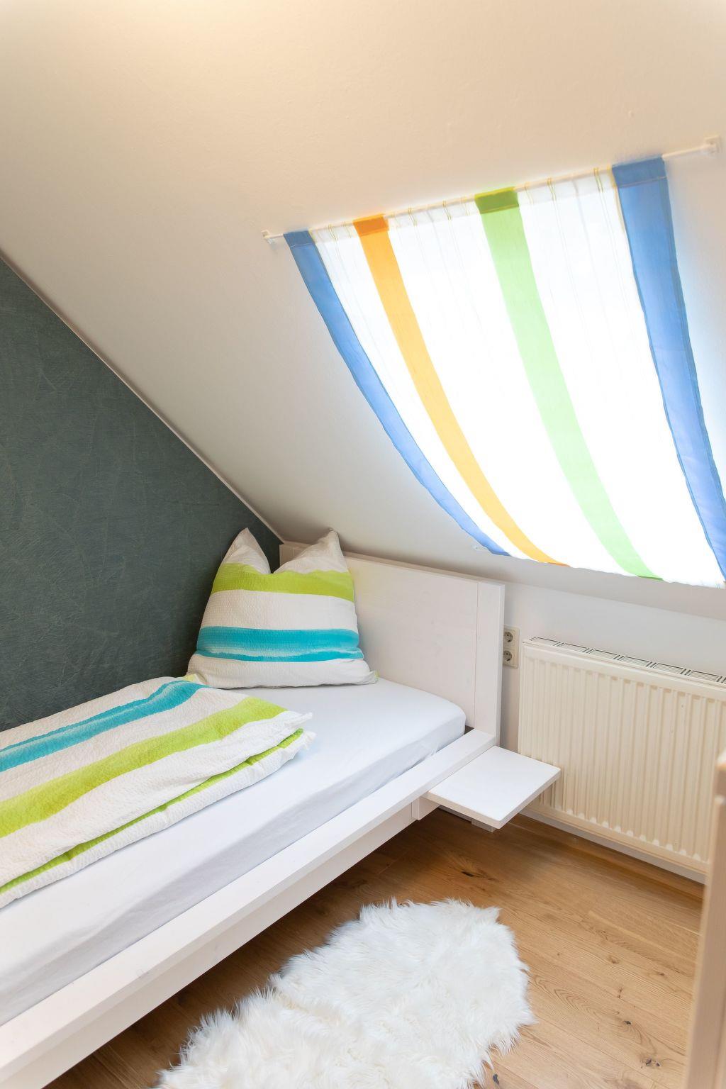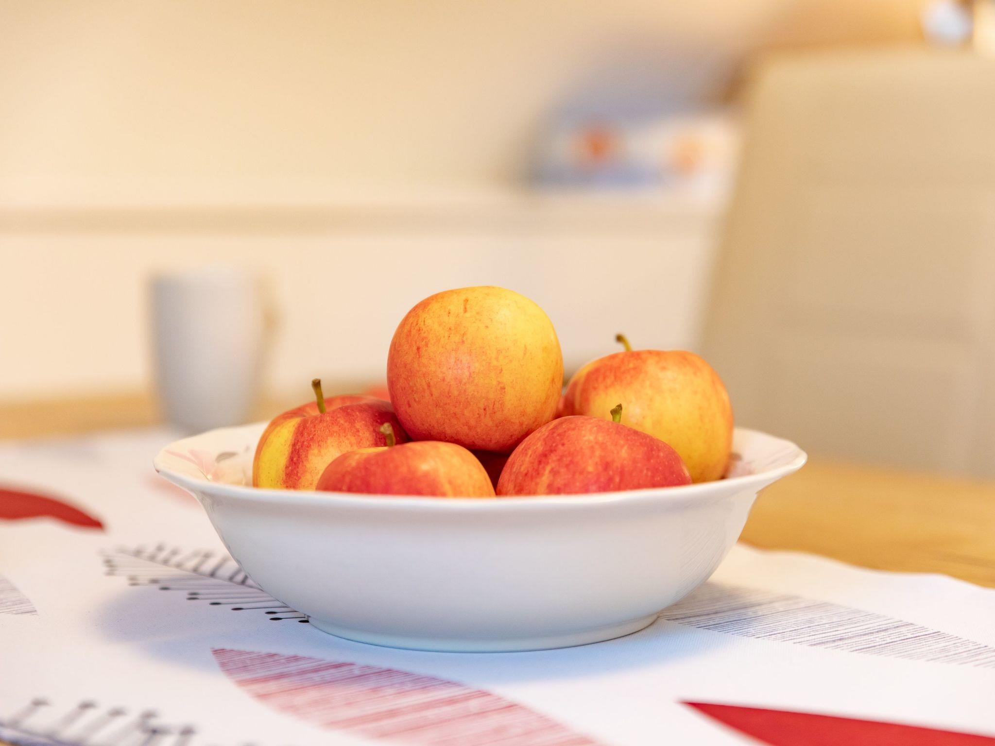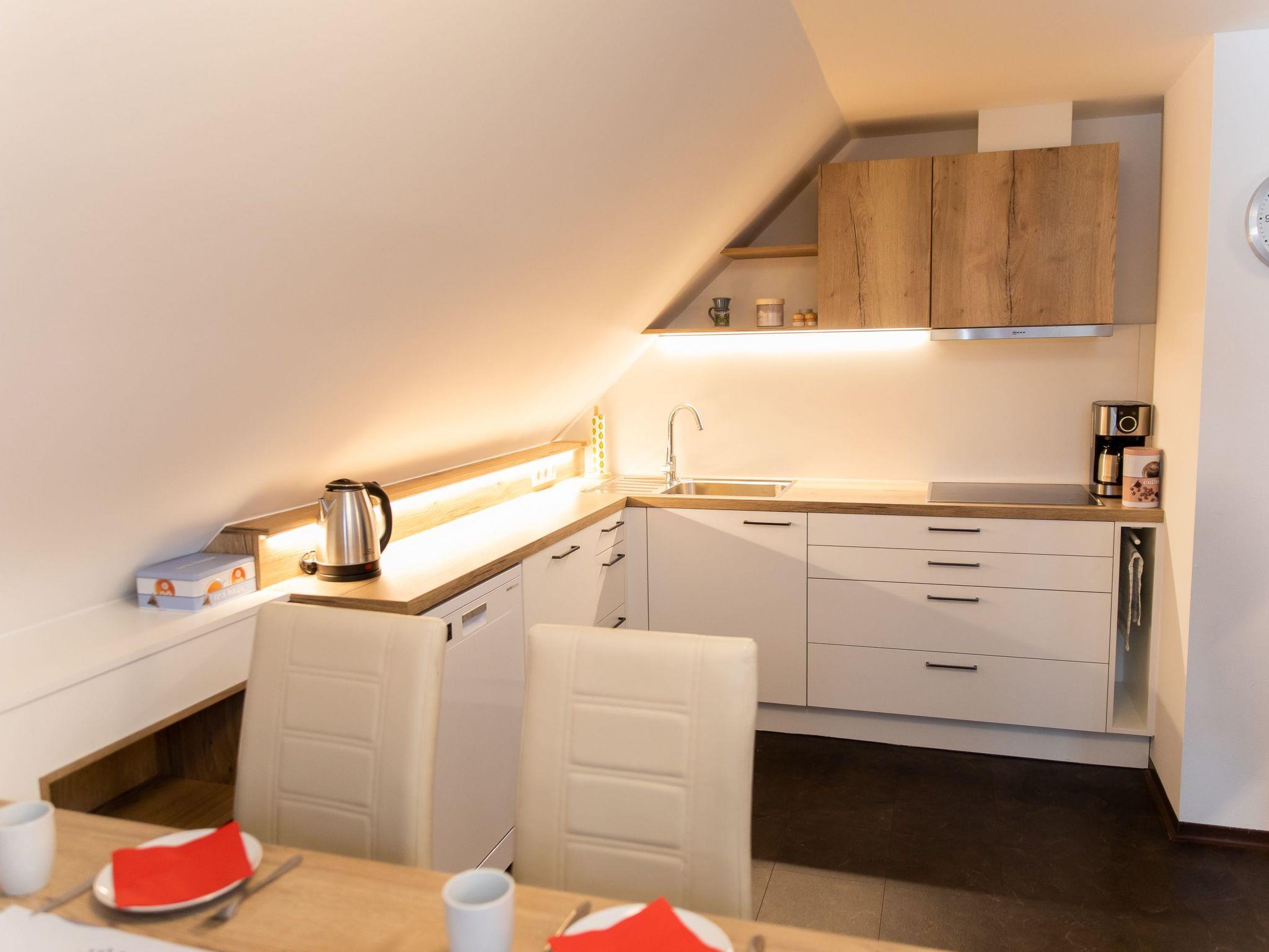 The apartment completed in 2016 is on the upper floor of a two-storey single-family house and provides 60m² of living space. Two to four people can enjoy the pleasant atmosphere exuded by the attractive interior, comprising rooms flooded with daylight, light furniture and natural wood colours. After the entrance, there are stairs directly to your apartment, which consists of an entrance area, a double bedroom, a sociable living room-kitchen, a storage room and a modern shower room with a WC. The bedroom promises a good night’s sleep with a double bed (180 x 200cm), a wardrobe and a little dresser also for a laptop. The two skylights above the bed invite you to fall asleep under a starry sky if you leave the blinds open. The centrepiece of the apartment is the living and dining room with an integrated kitchen. After a day trip, you can relax on the large and comfortable sofa. Satellite TV provides entertainment. The sofa can be used as a bed for a child as a third person. There is also a child’s bed. Next to the suite, you go past the dining table with four high-backed chairs to the open kitchen space, fully-equipped for practical self-catering: induction hob, microwave, oven, large fridge and freeze, dishwasher, coffee machine, kettle and toaster.