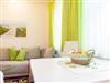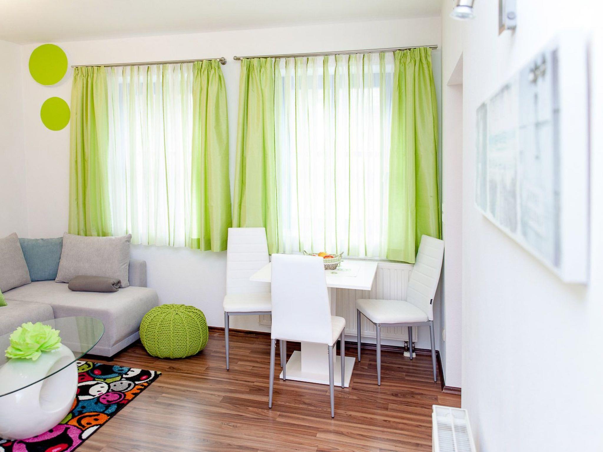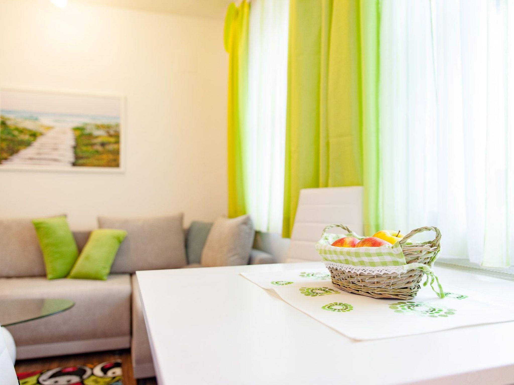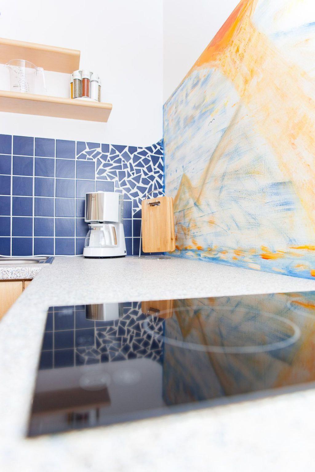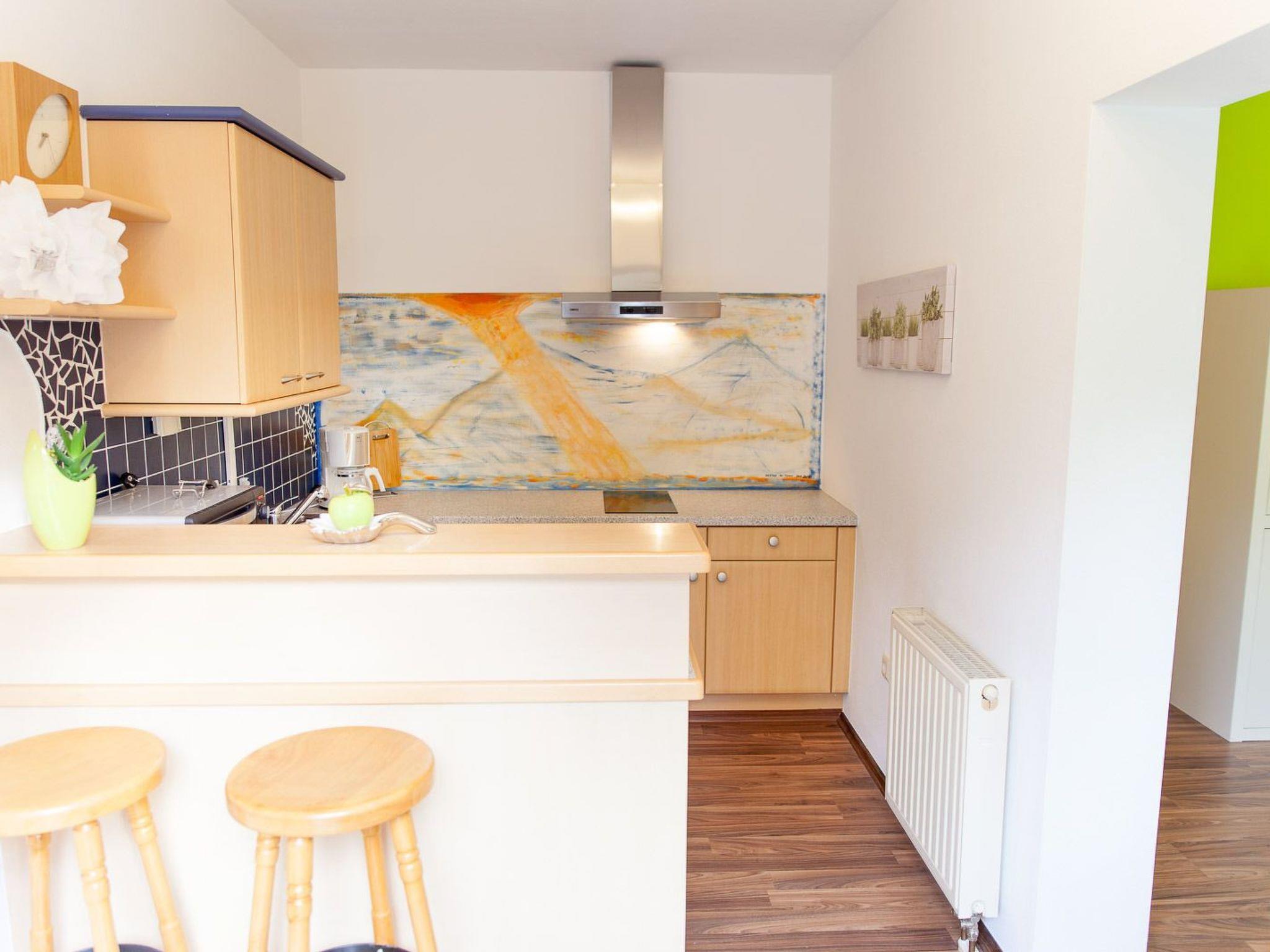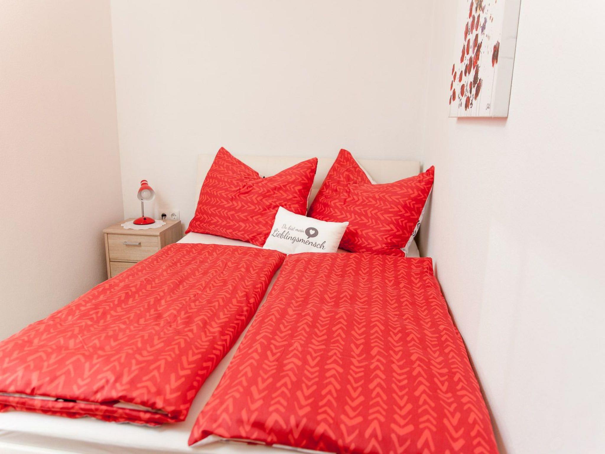 Holiday flat (45 m2) with feel-good ambience for 2 - 3 persons. Bright, friendly rooms at ground level. Small kitchen area with bar at the entrance, living and sleeping area, bathroom with shower/WC and storage room. Fully equipped kitchen for self-catering: induction hob with two hotplates, small oven, large fridge, filter coffee machine, kettle. Living area with dining table, pull-out sofa bed, satellite TV, free WiFi. Bedroom with queen-size bed (140x200), wardrobe and chest of drawers. Bed linen, hand and bath towels, toilet paper are provided.